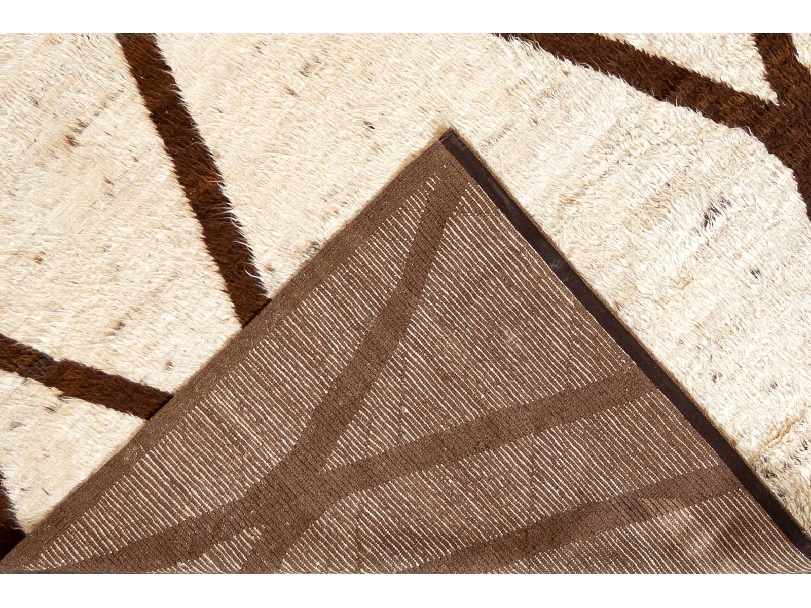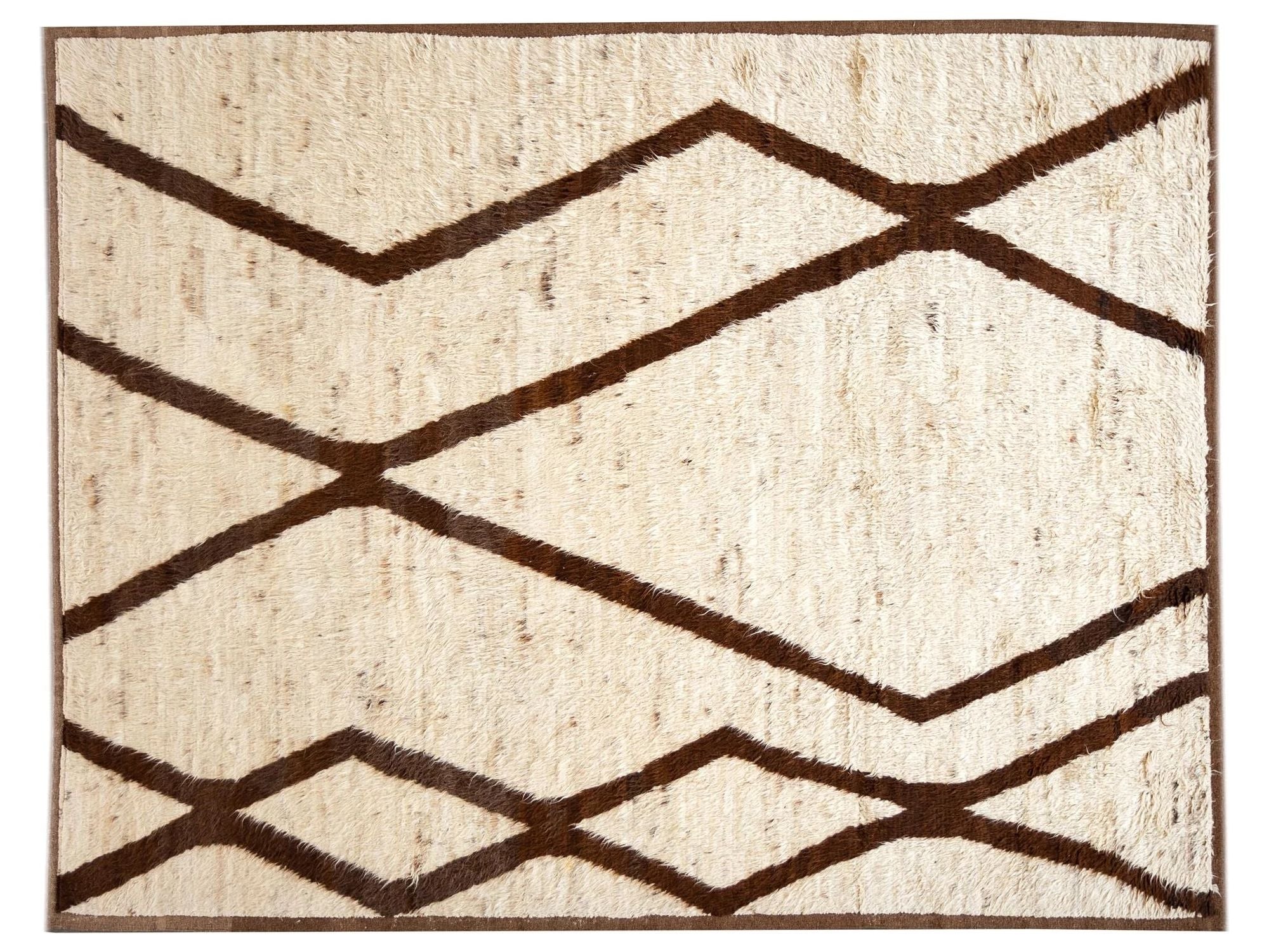 Beautiful Contemporary Moroccan style Rug, hand-knotted wool with an ivory field, geometric brown accents in an allover tribal design.