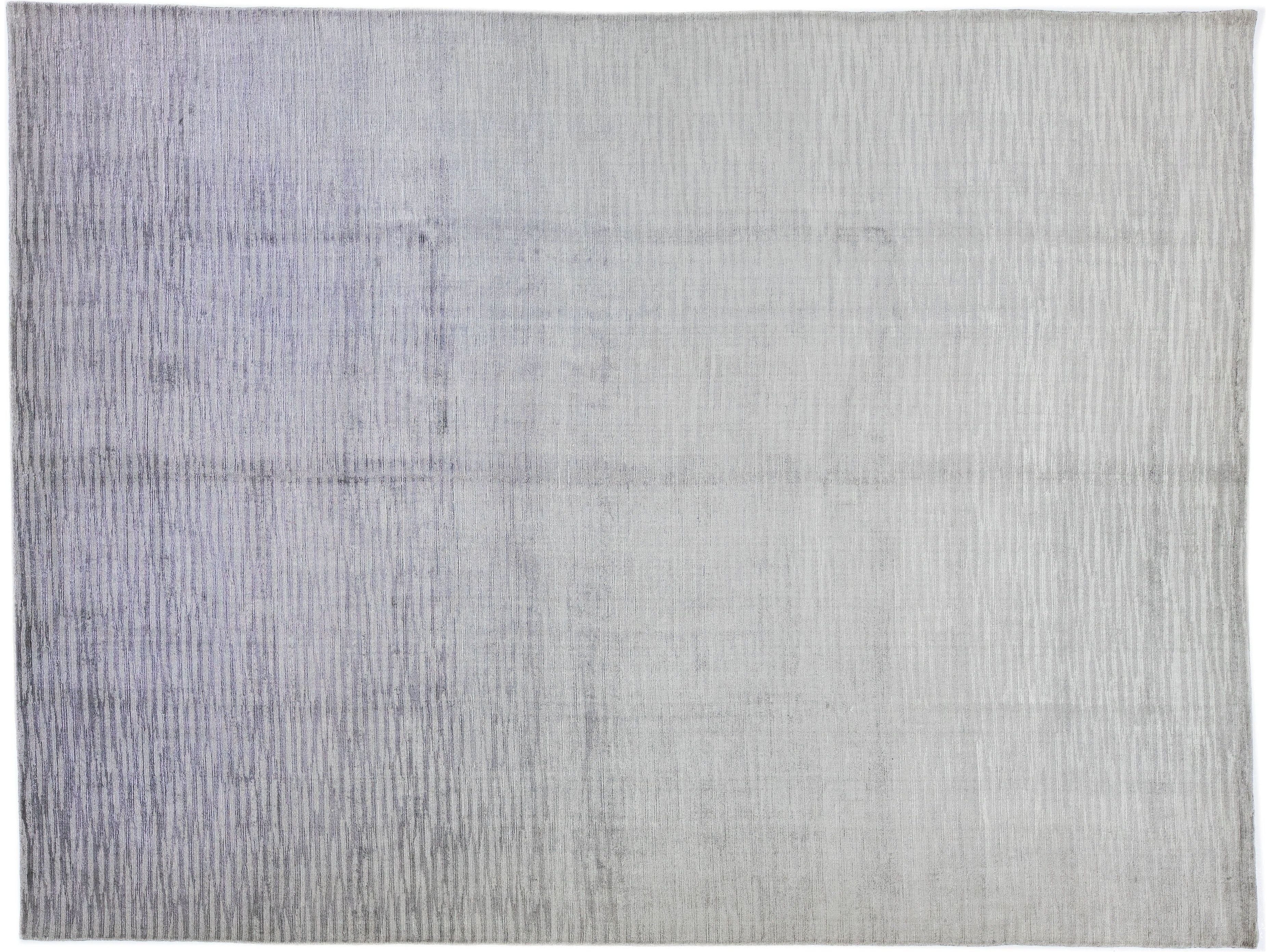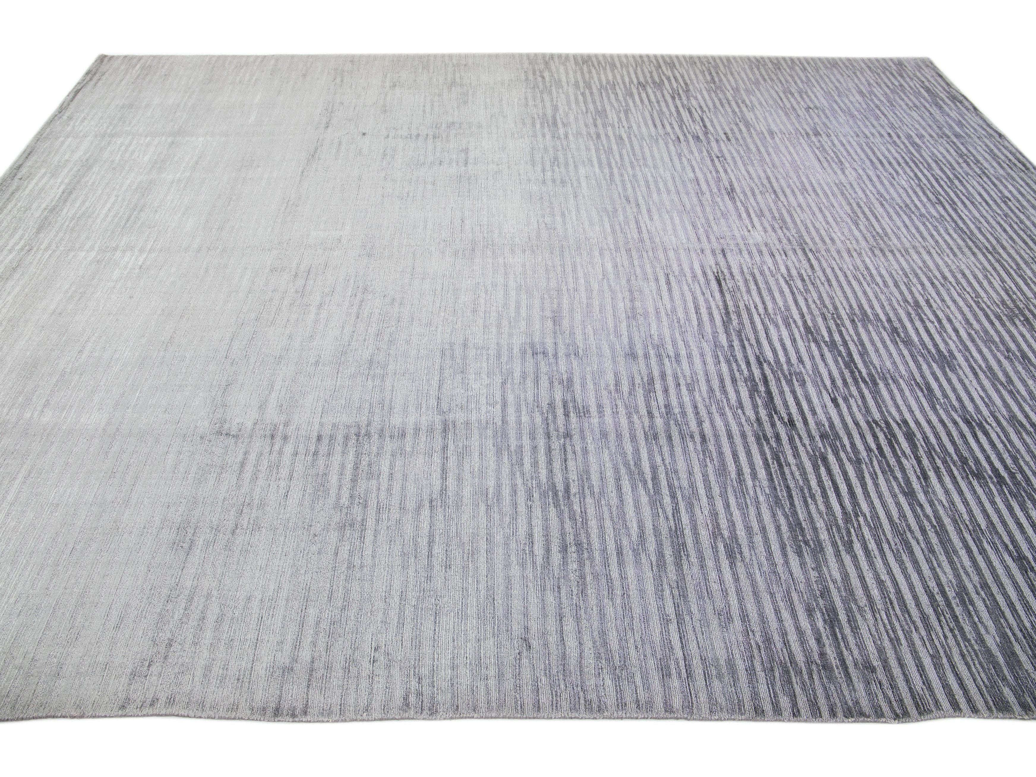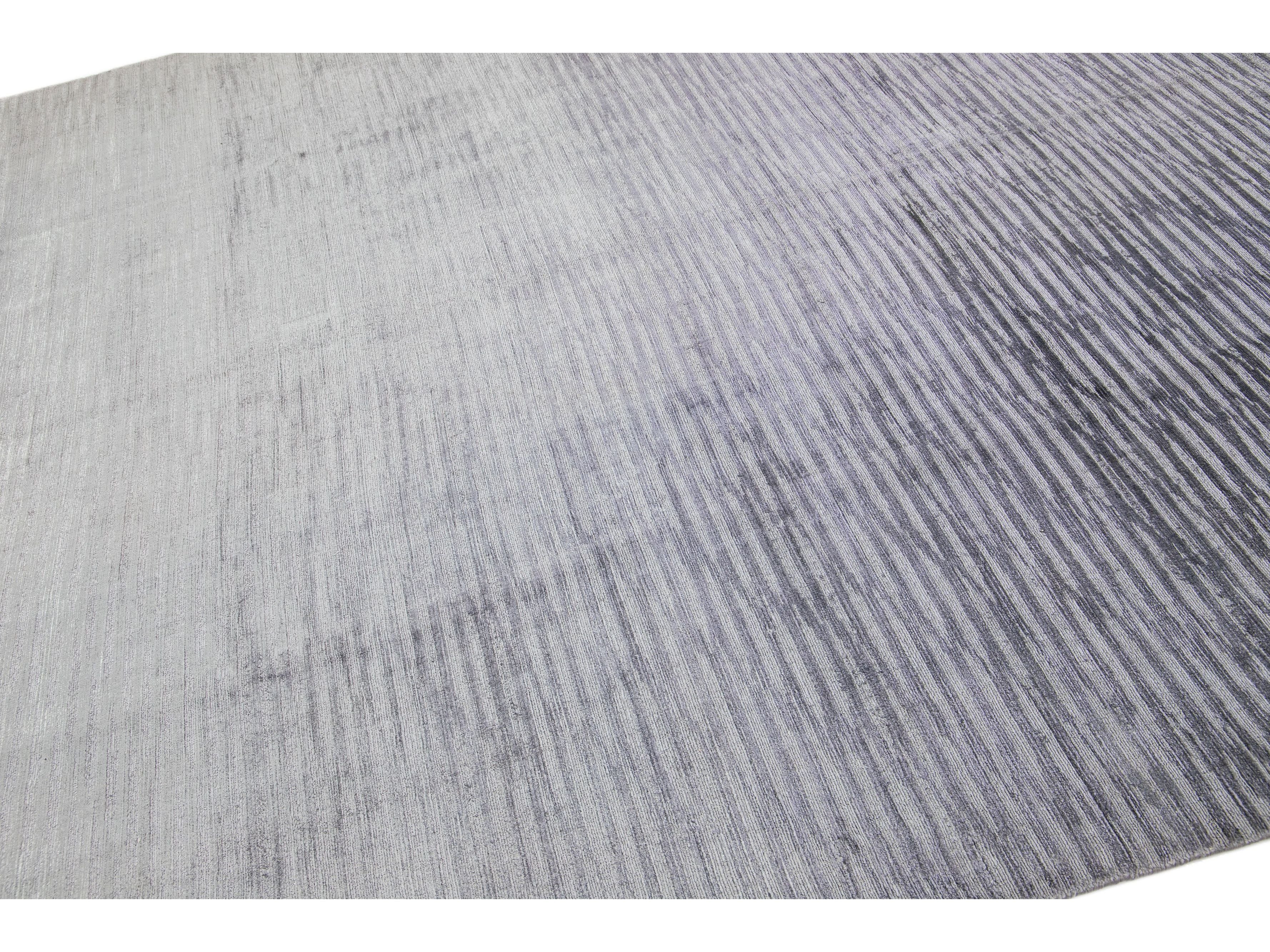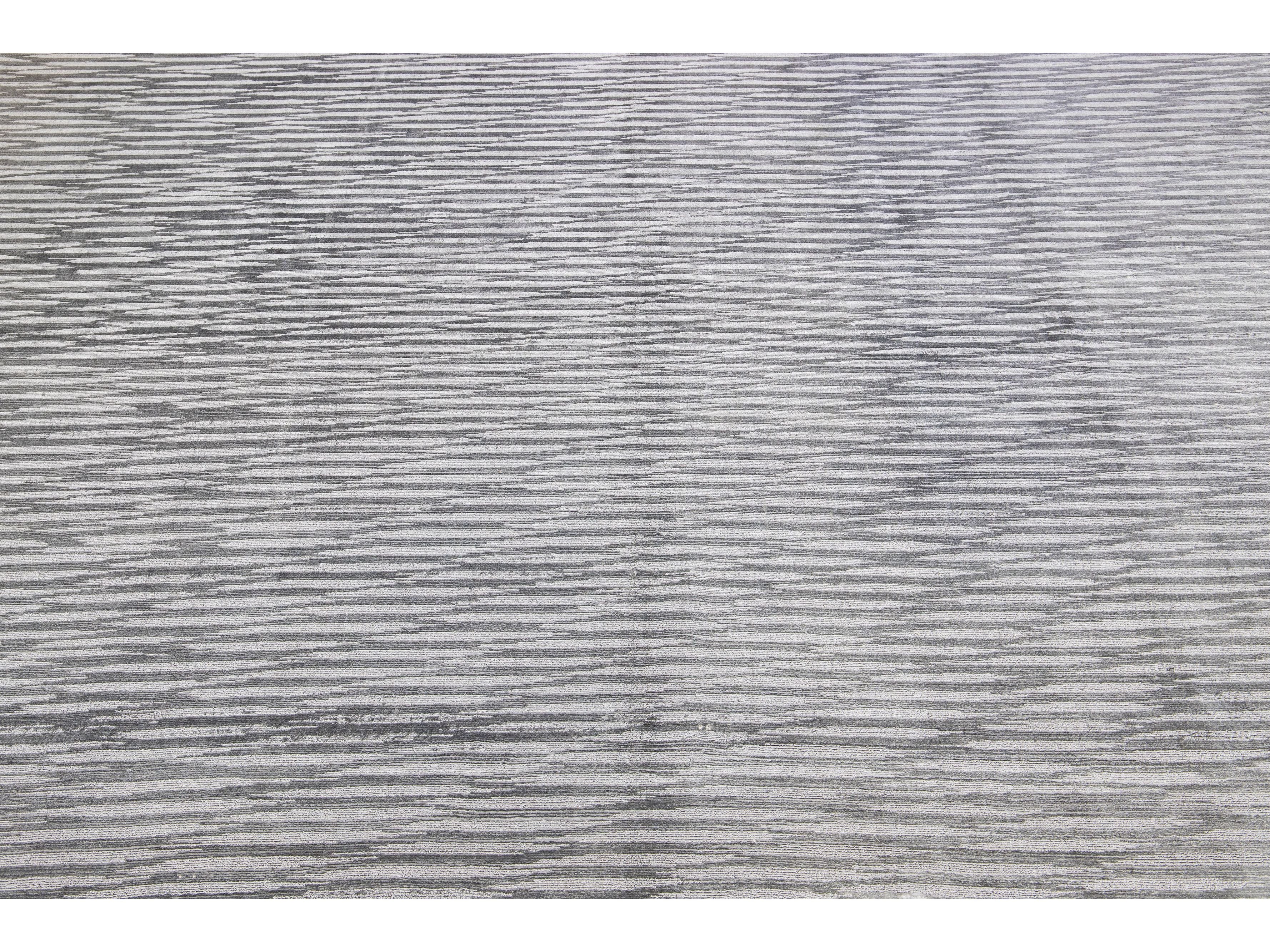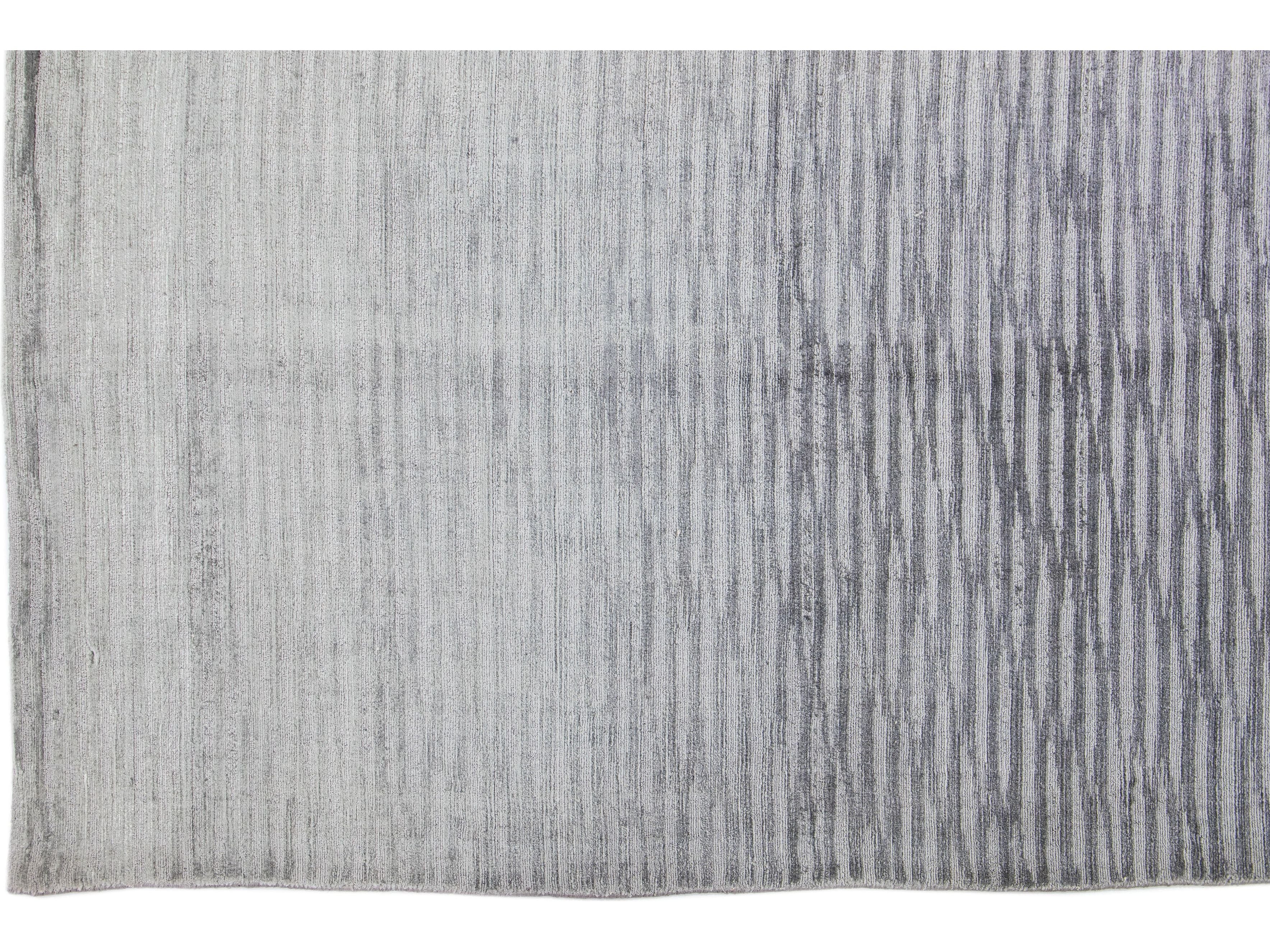 Meticulously crafted by hand using a blend of silk and wool, this exquisite contemporary rug showcases a stunning gray foundation perfectly accentuated by an alluring Stripe design in Silver shades.
