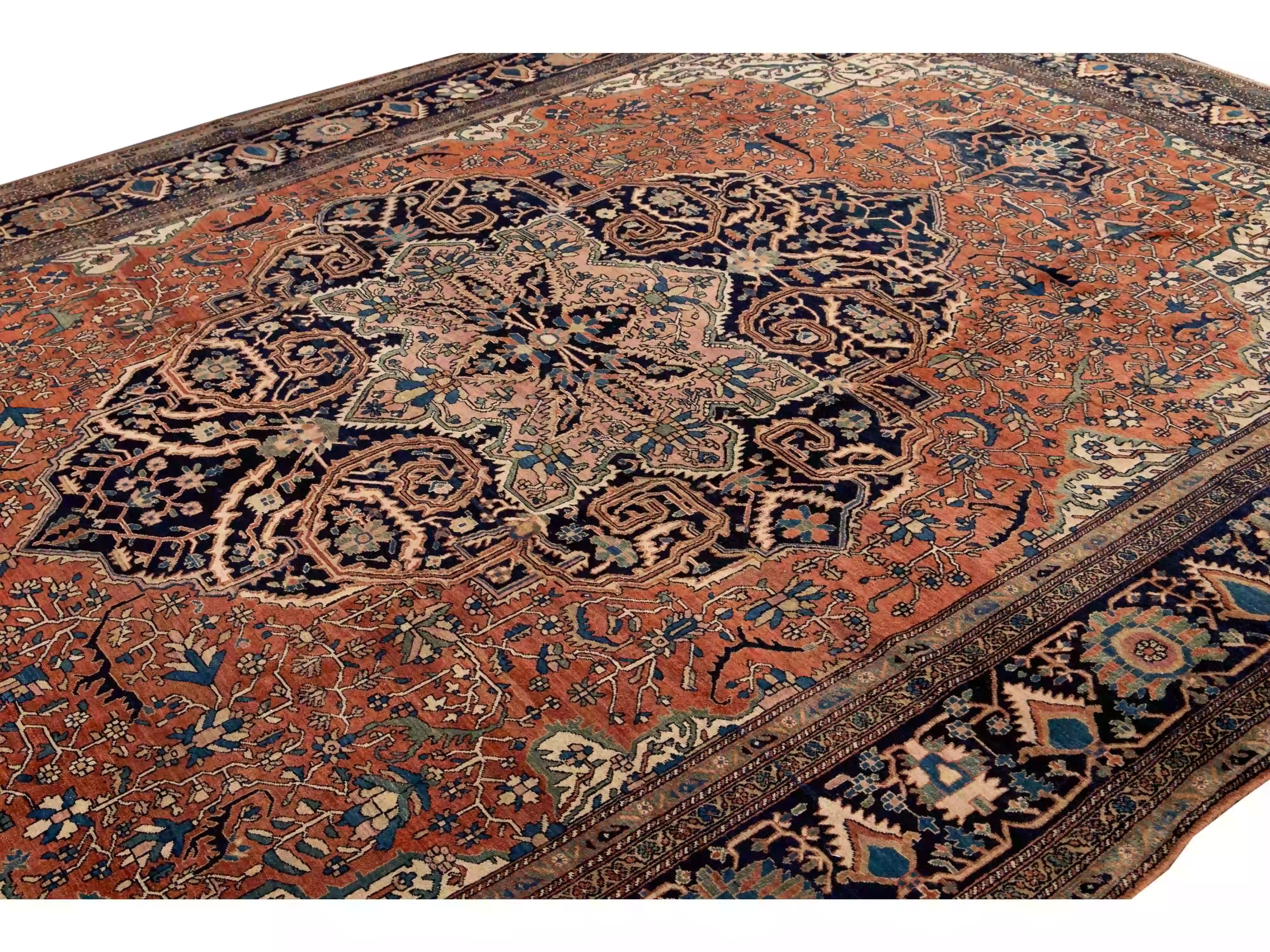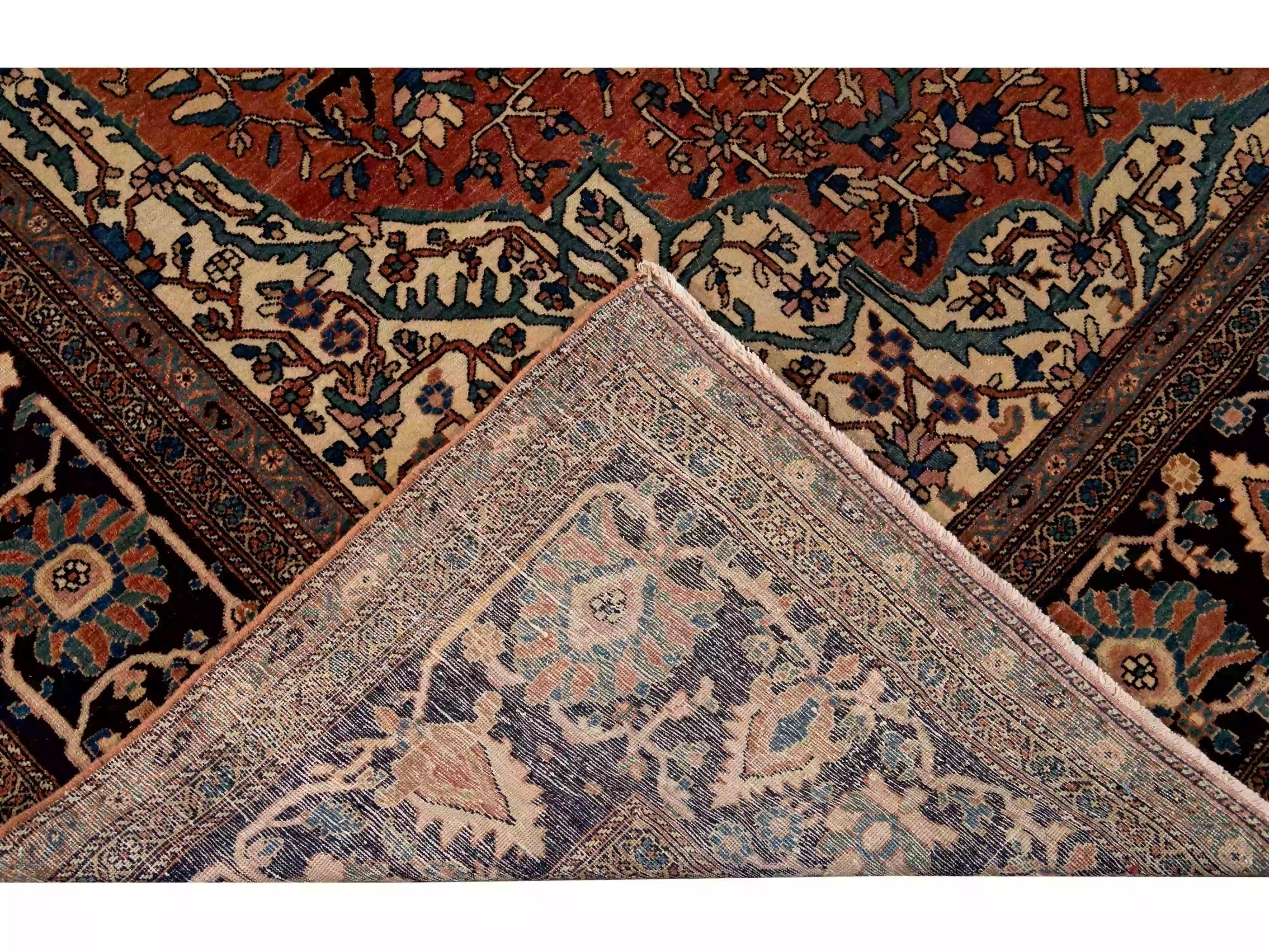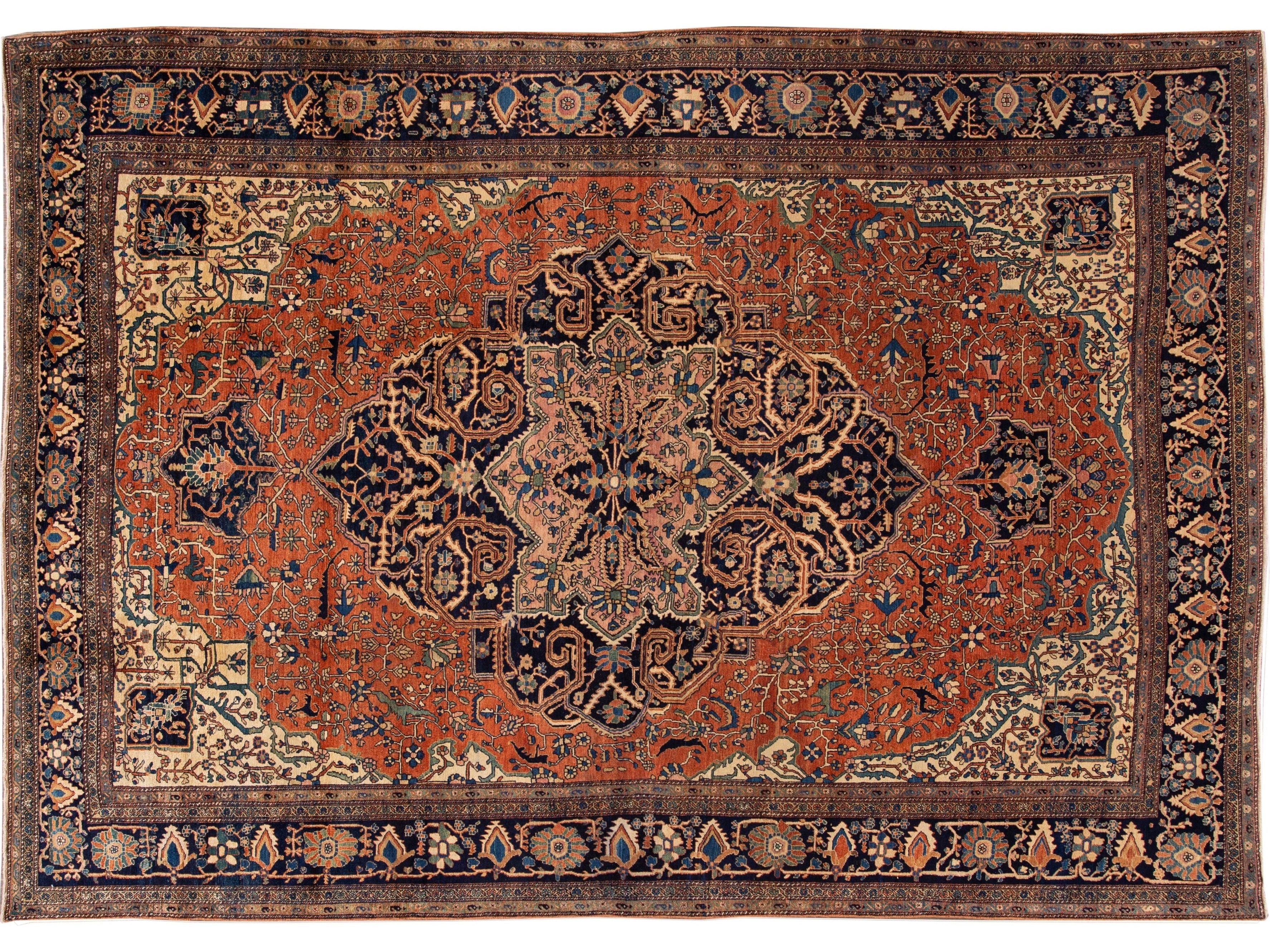 Beautiful Antique Farahan hand-knotted wool rug with an orange-rust color field. This Persian rug has a designed dark blue frame with multicolor accents on a Classic floral medallion design.