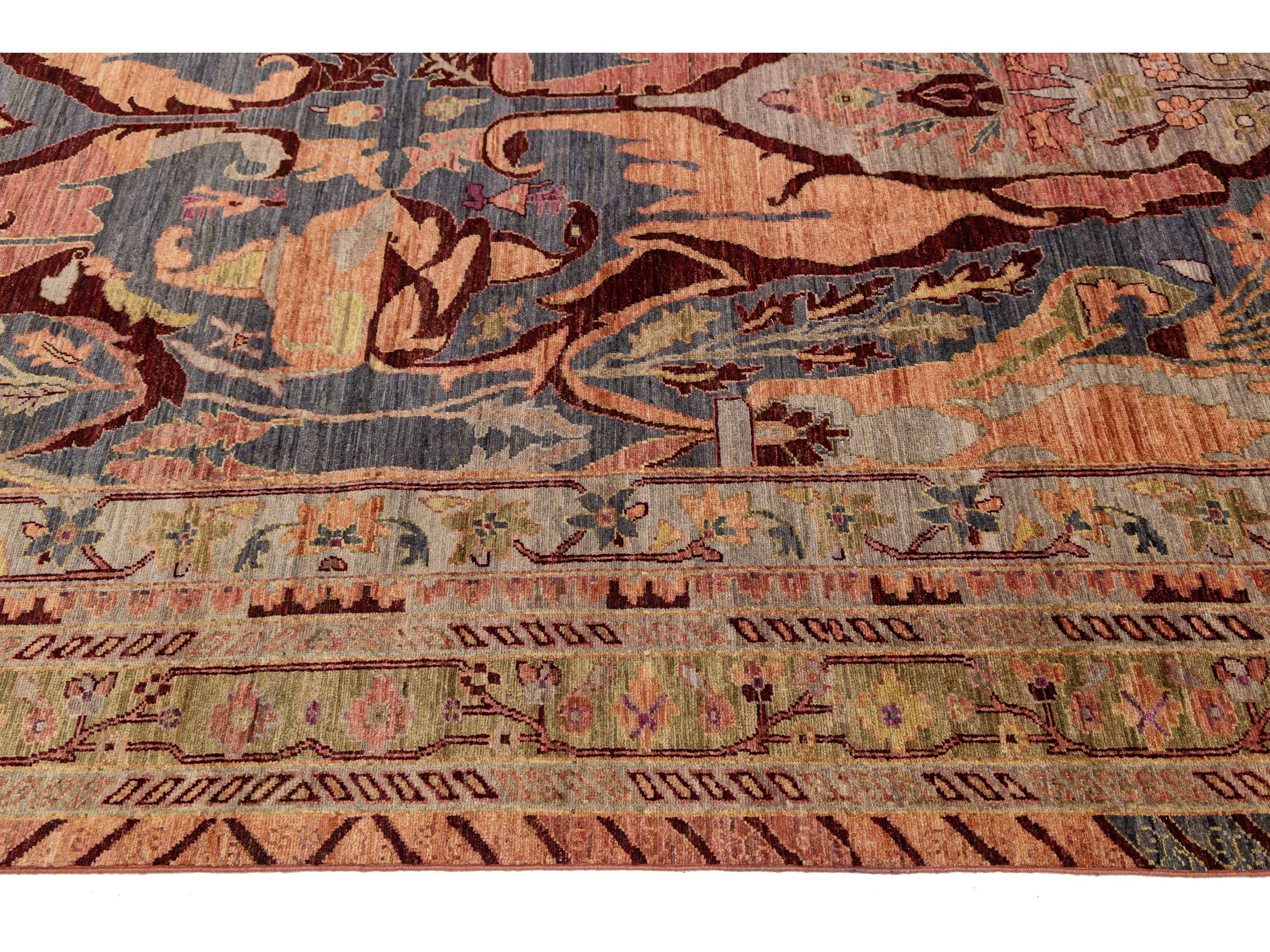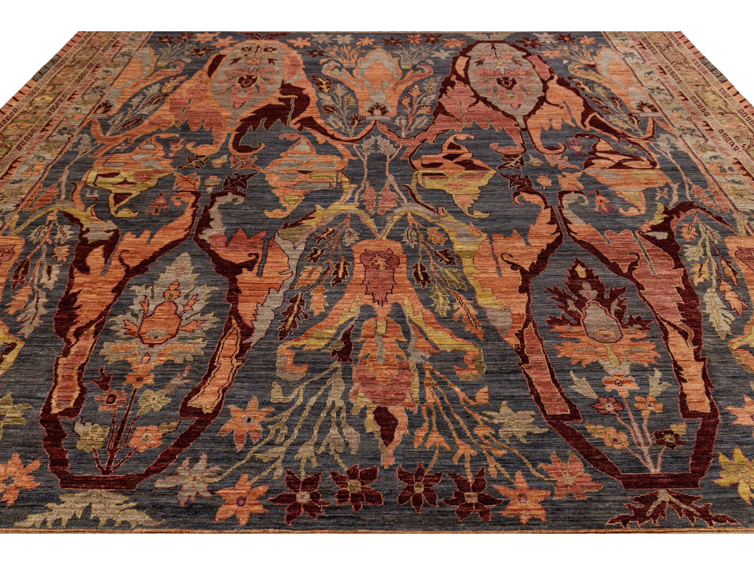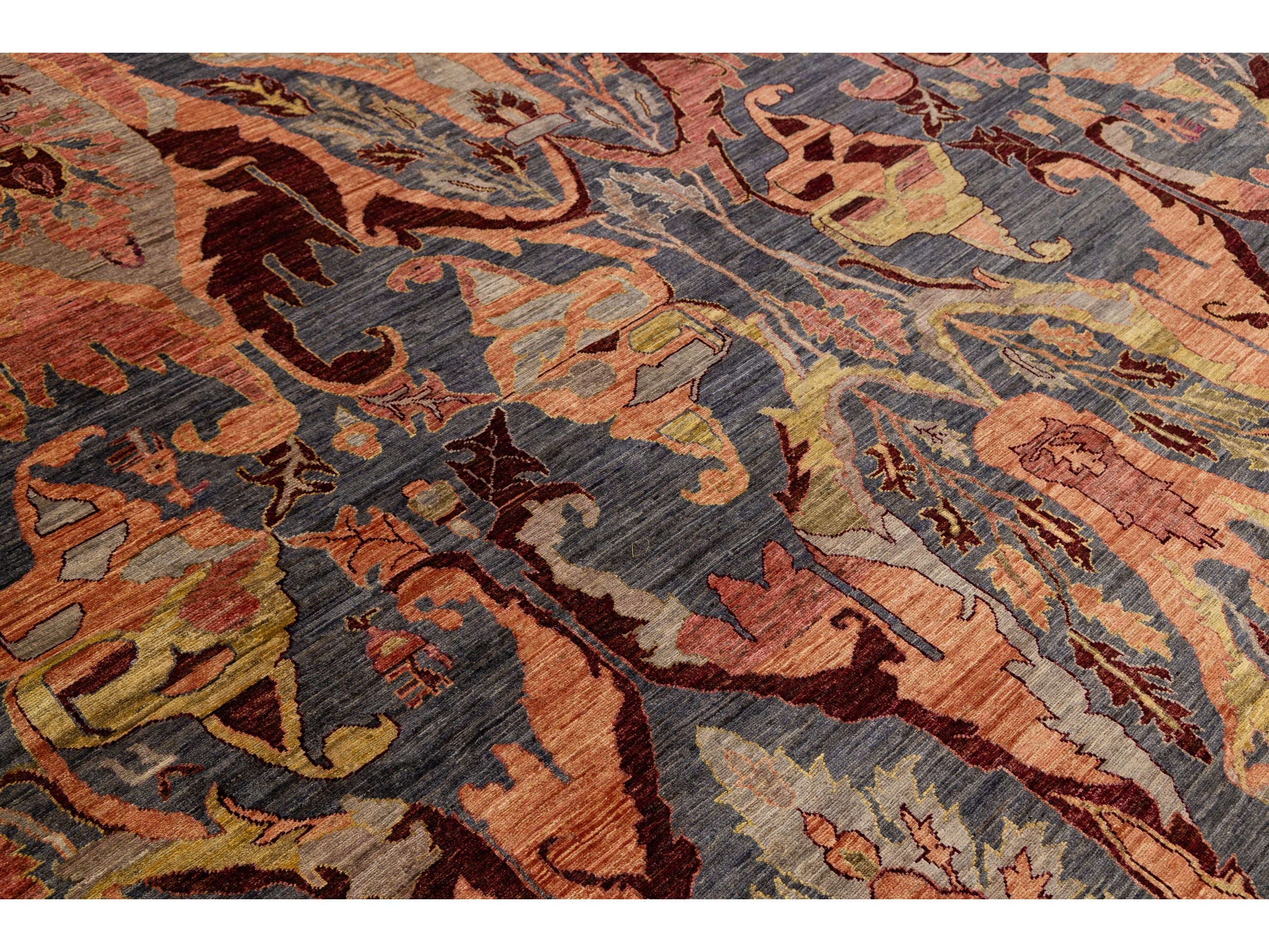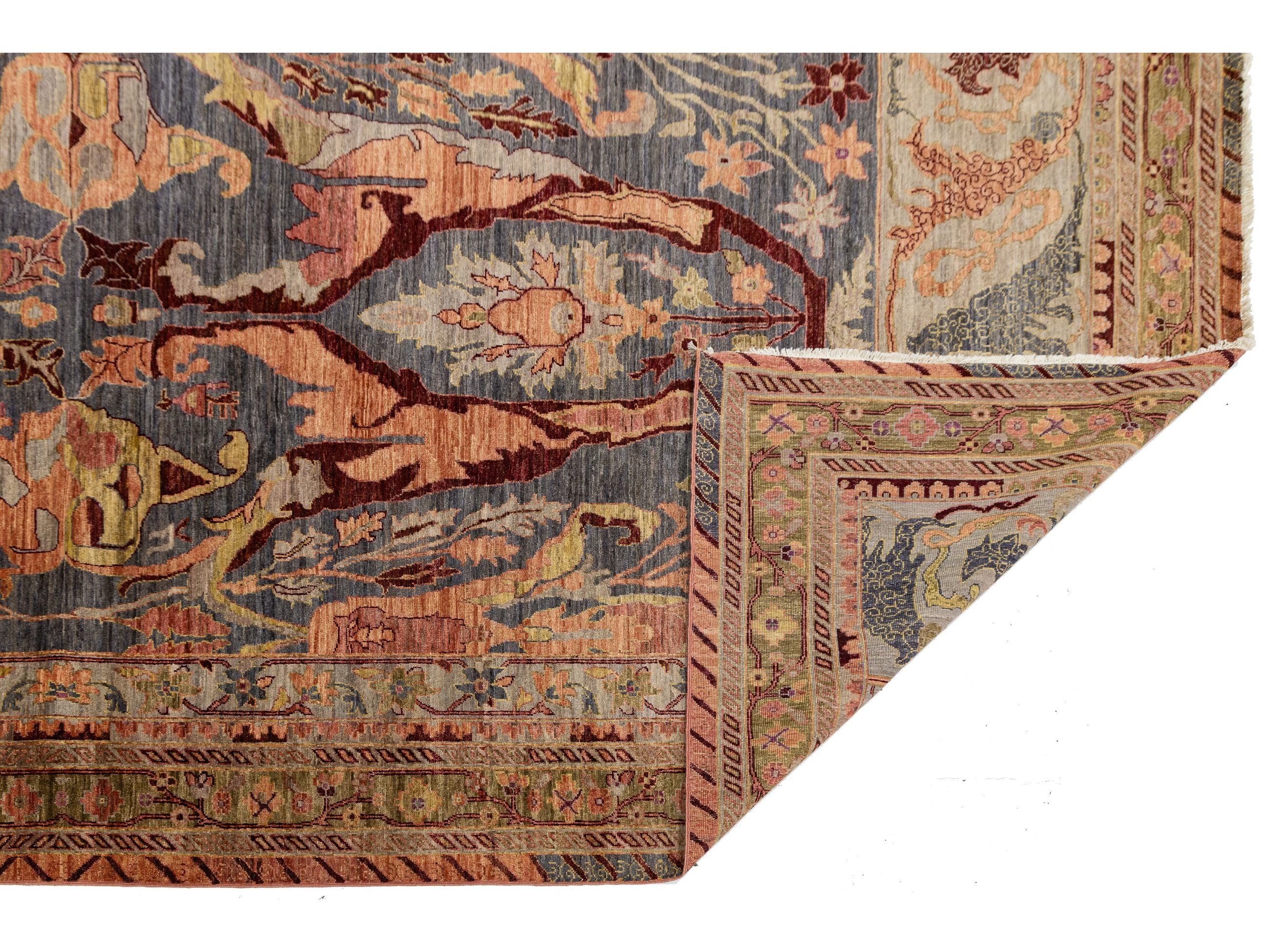 Elevate your space with this exquisite hand-knotted wool rug inspired by the "Iron Rugs" of Bidjar. It features bold botanical motifs on a deep slate-blue field, with a sophisticated palette of terracotta, burnt orange, and muted gold. Crafted from premium wool, its dense weave ensures durability and a luxurious feel, making it perfect for high-traffic living areas or modern offices. This rug measures: 11'10" x 14'9".
