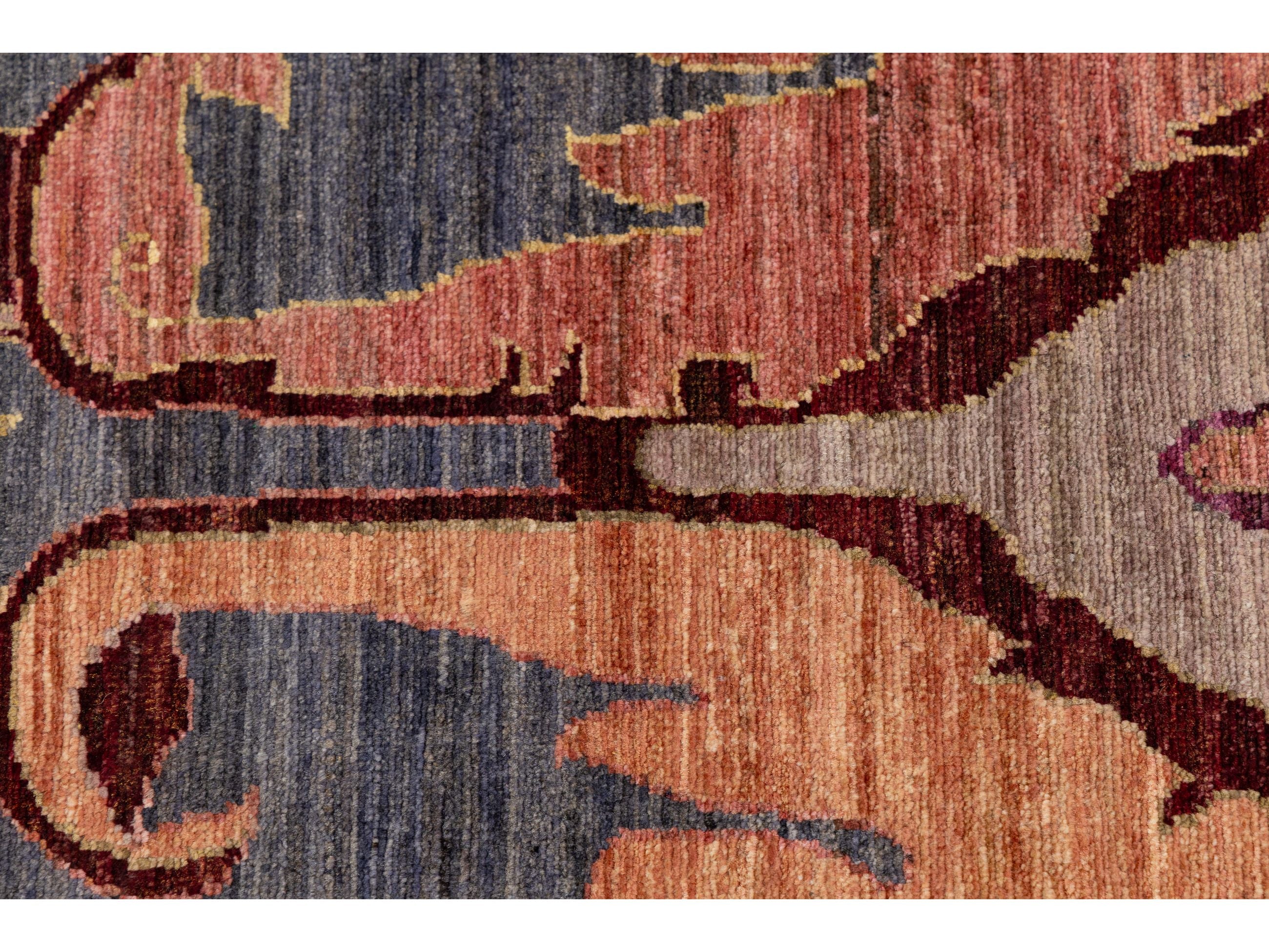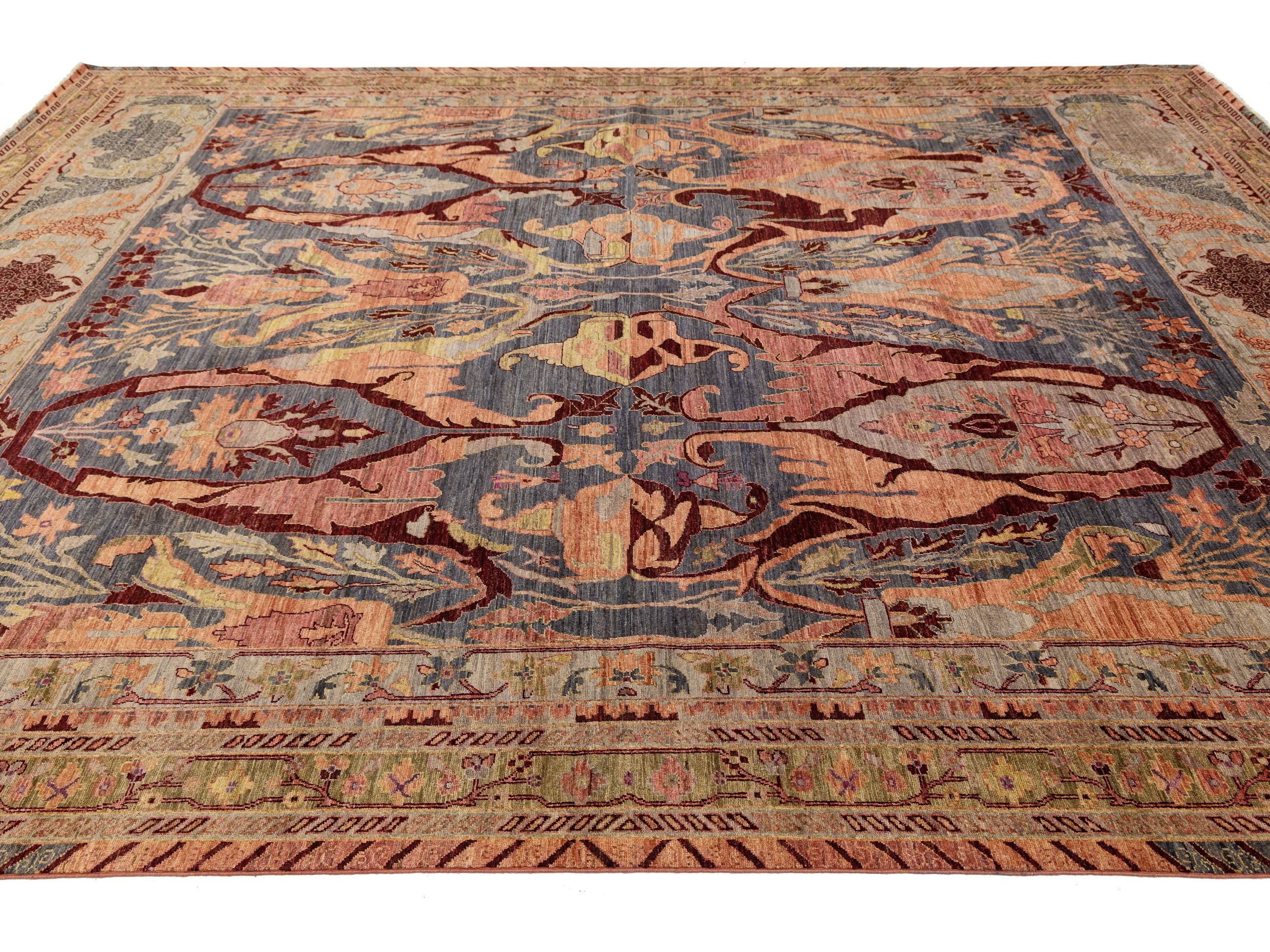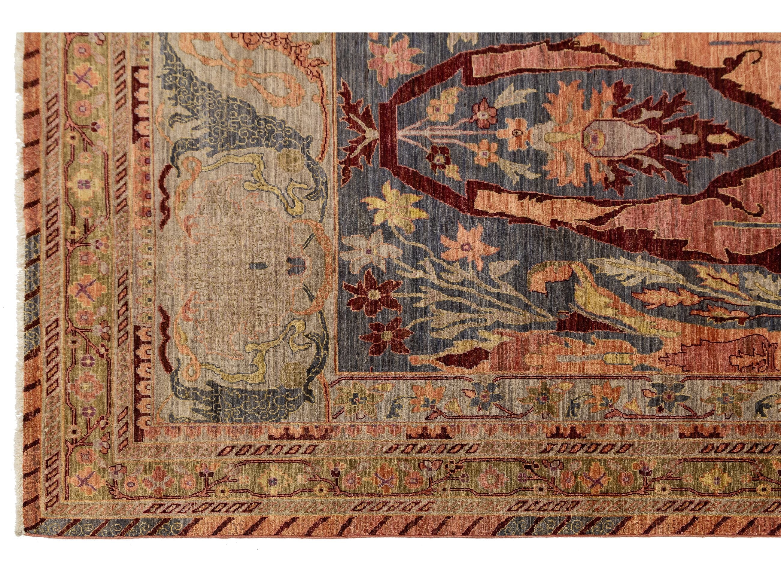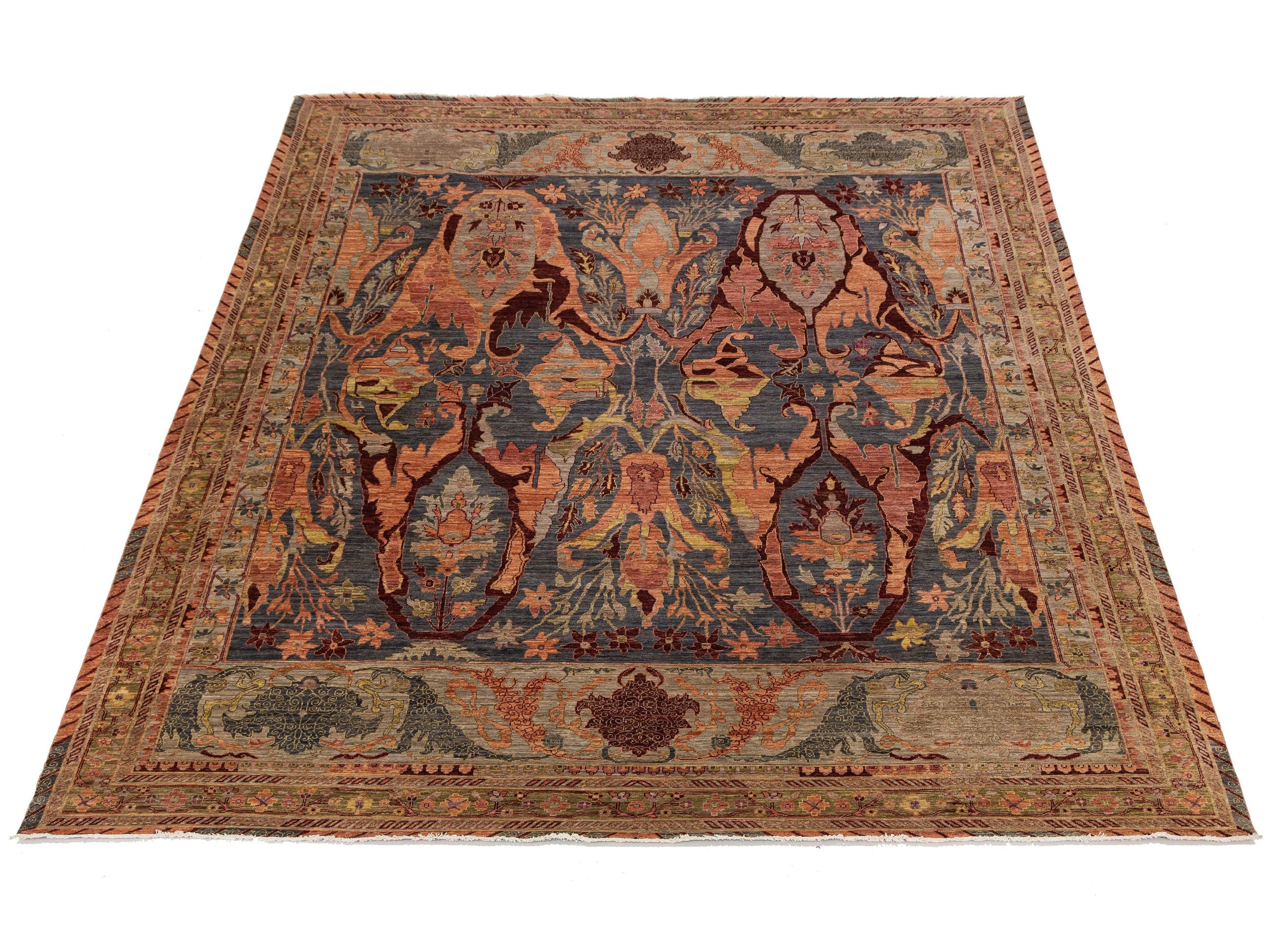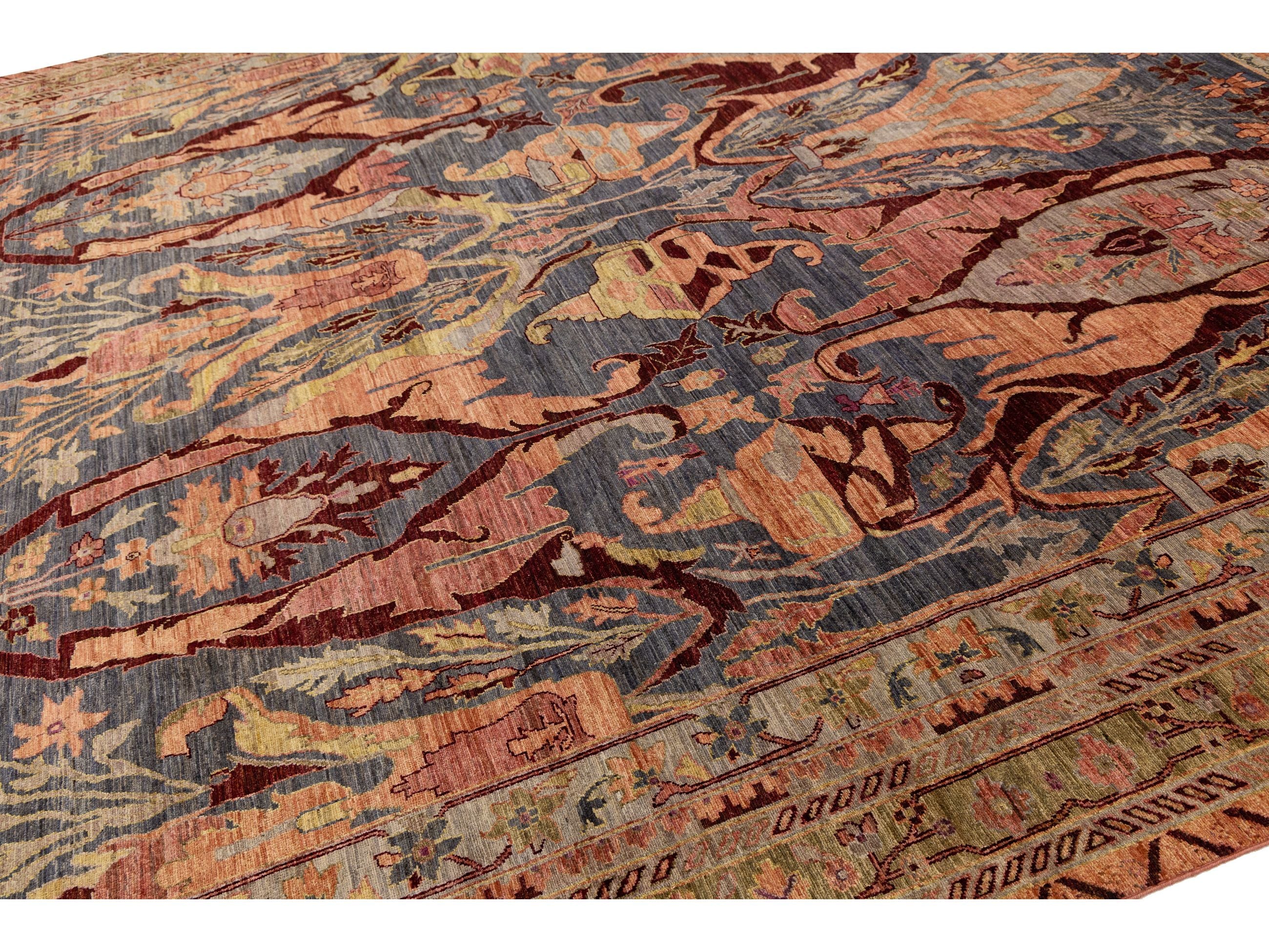 Elevate your space with this exquisite hand-knotted wool rug inspired by the "Iron Rugs" of Bidjar. It features bold botanical motifs on a deep slate-blue field, with a sophisticated palette of terracotta, burnt orange, and muted gold. Crafted from premium wool, its dense weave ensures durability and a luxurious feel, making it perfect for high-traffic living areas or modern offices. This rug measures: 11'10" x 14'9".
