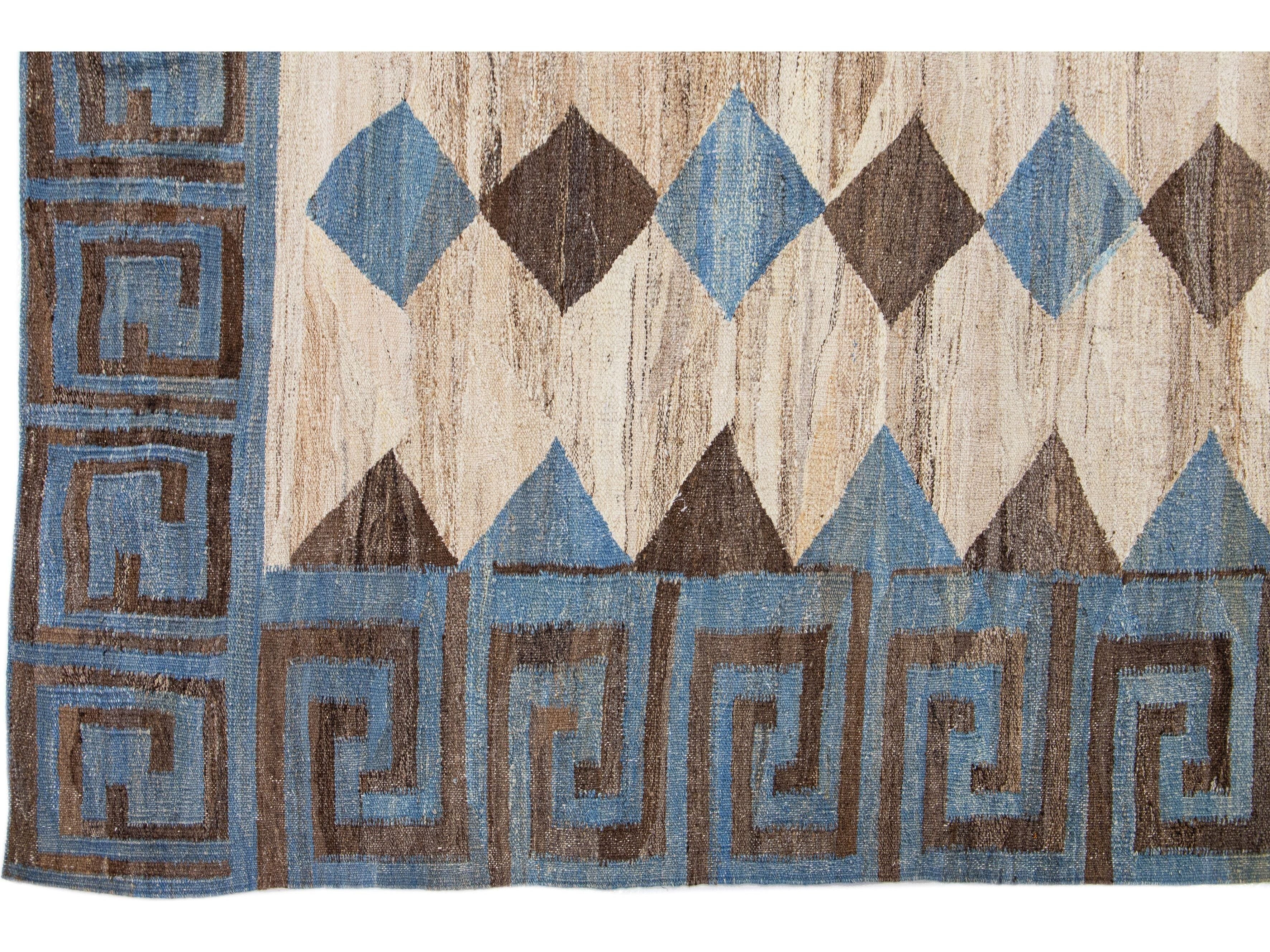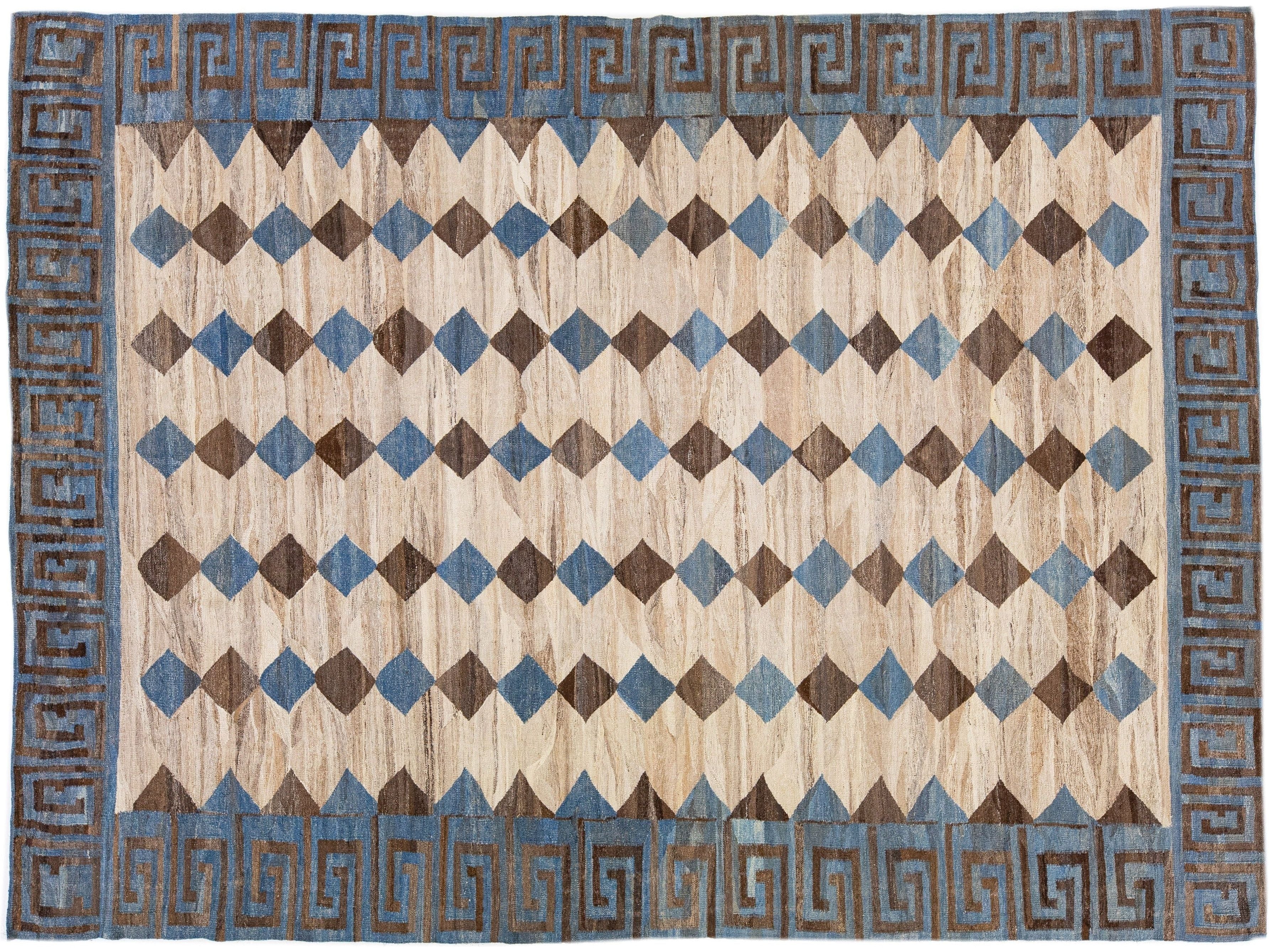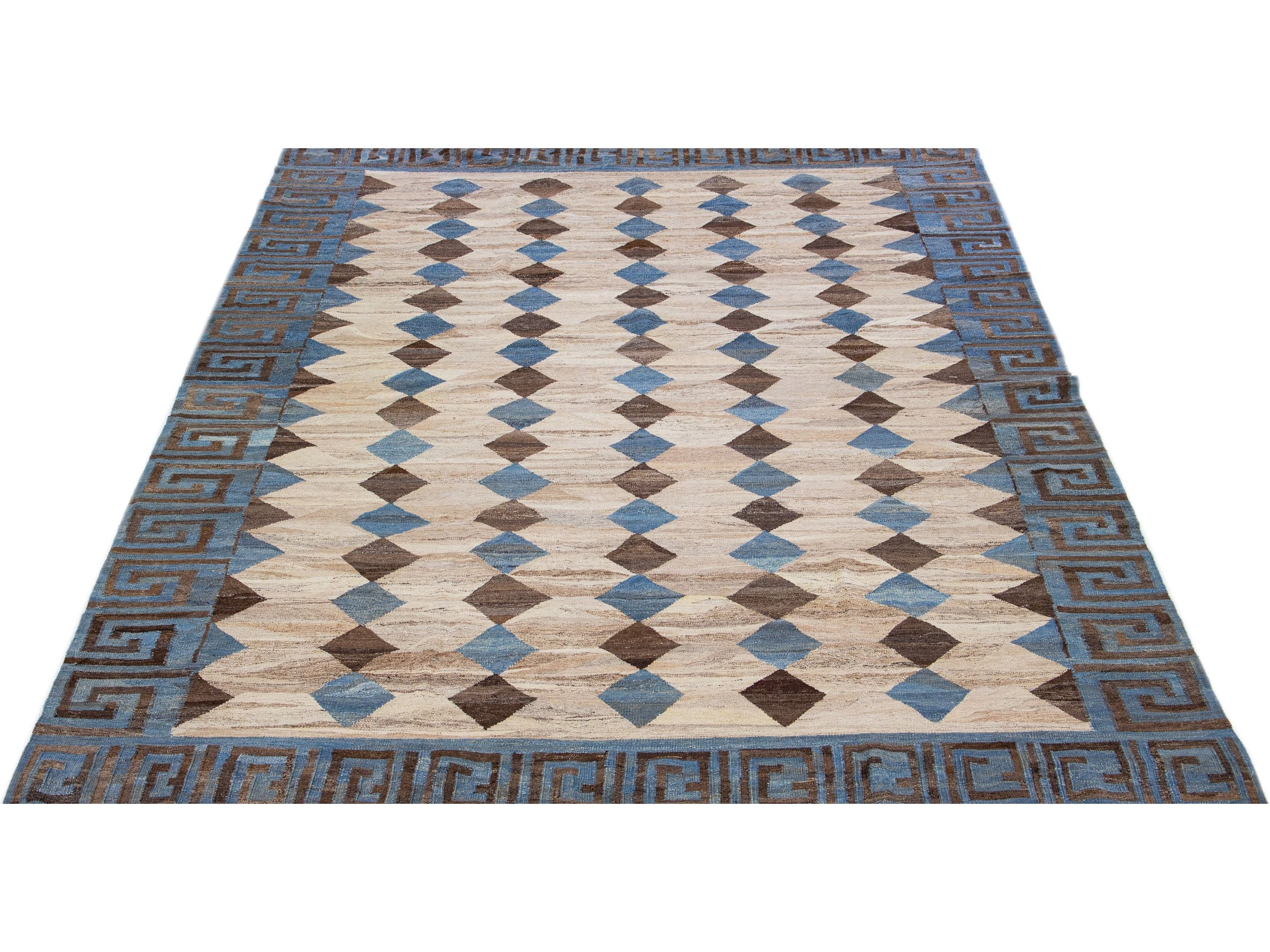 This Deco flatweave wool rug exhibits a fascinating beige color field with brown and beige accents, creating a contemporary and aesthetically-pleasing abstract design. The natural material of the Deco wool rug is designed for comfort and long-lasting durability. The flatweave construction allows for effortless maintenance and easy placement.