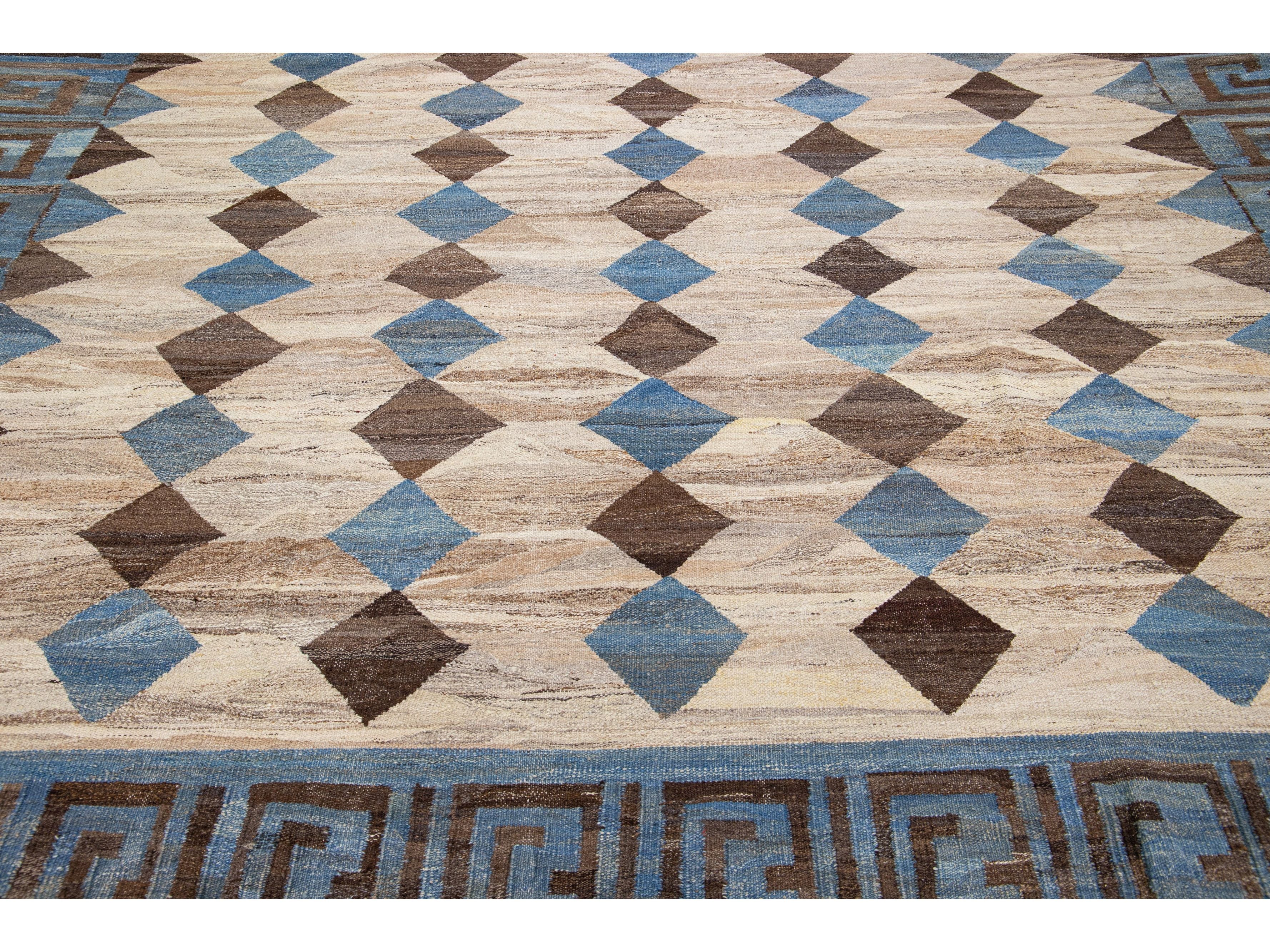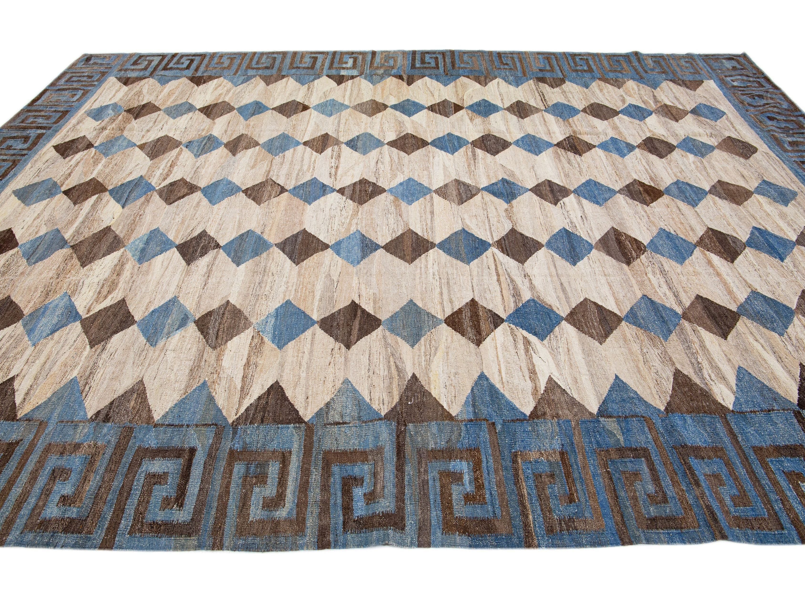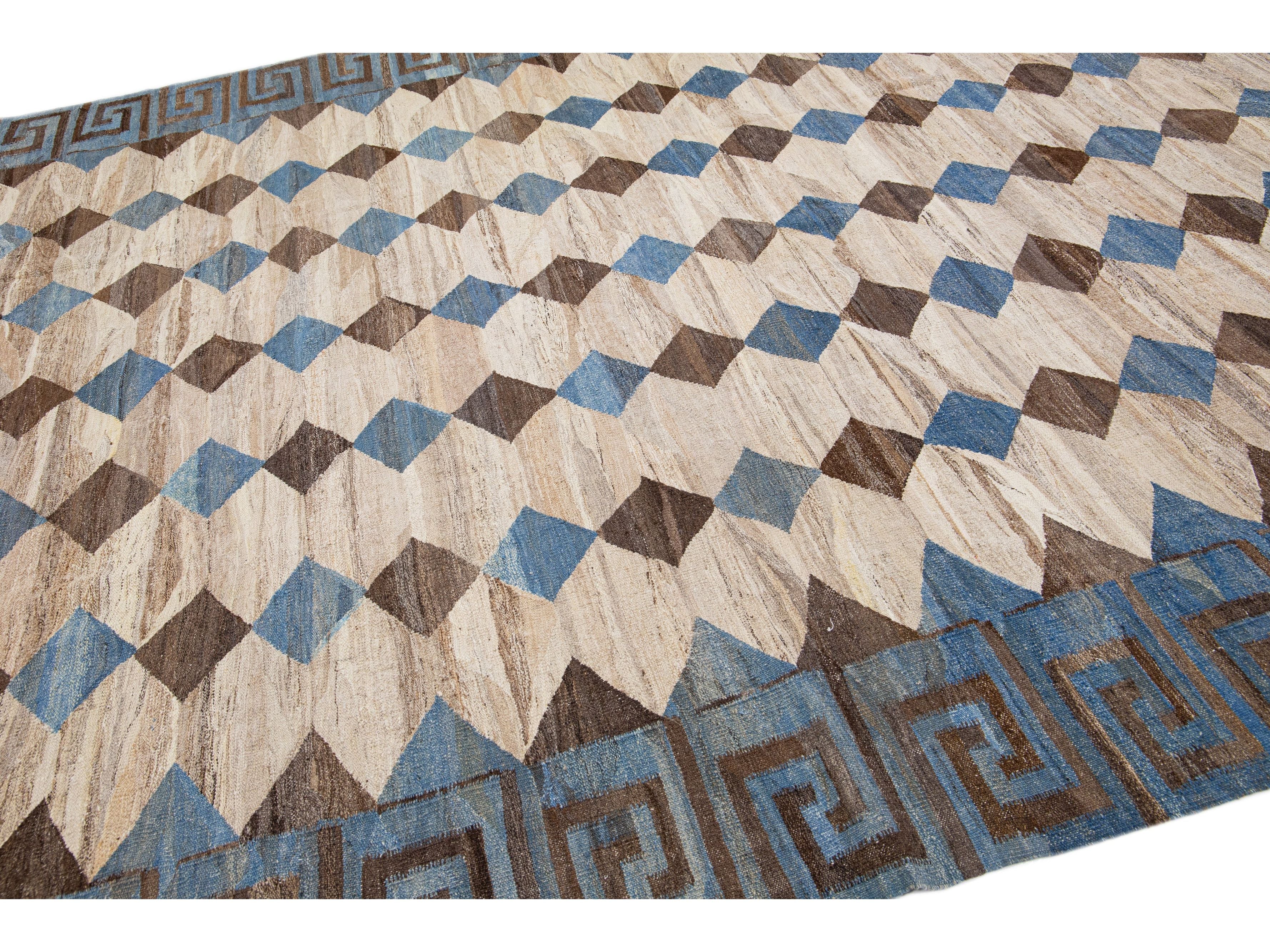 This Deco flatweave wool rug exhibits a fascinating beige color field with brown and beige accents, creating a contemporary and aesthetically-pleasing abstract design. The natural material of the Deco wool rug is designed for comfort and long-lasting durability. The flatweave construction allows for effortless maintenance and easy placement.