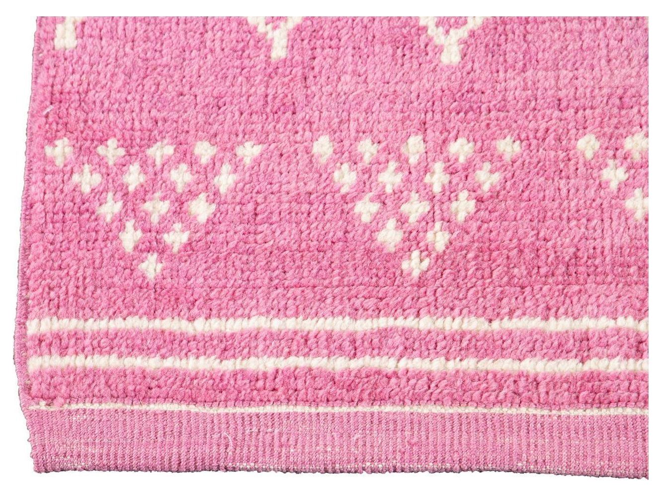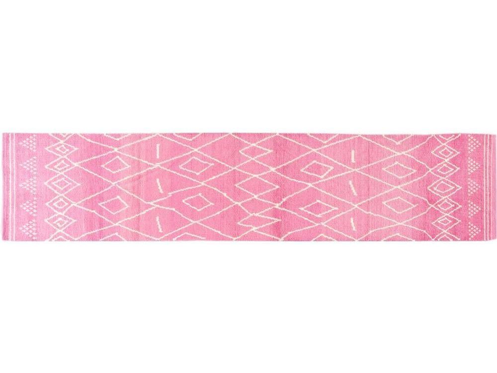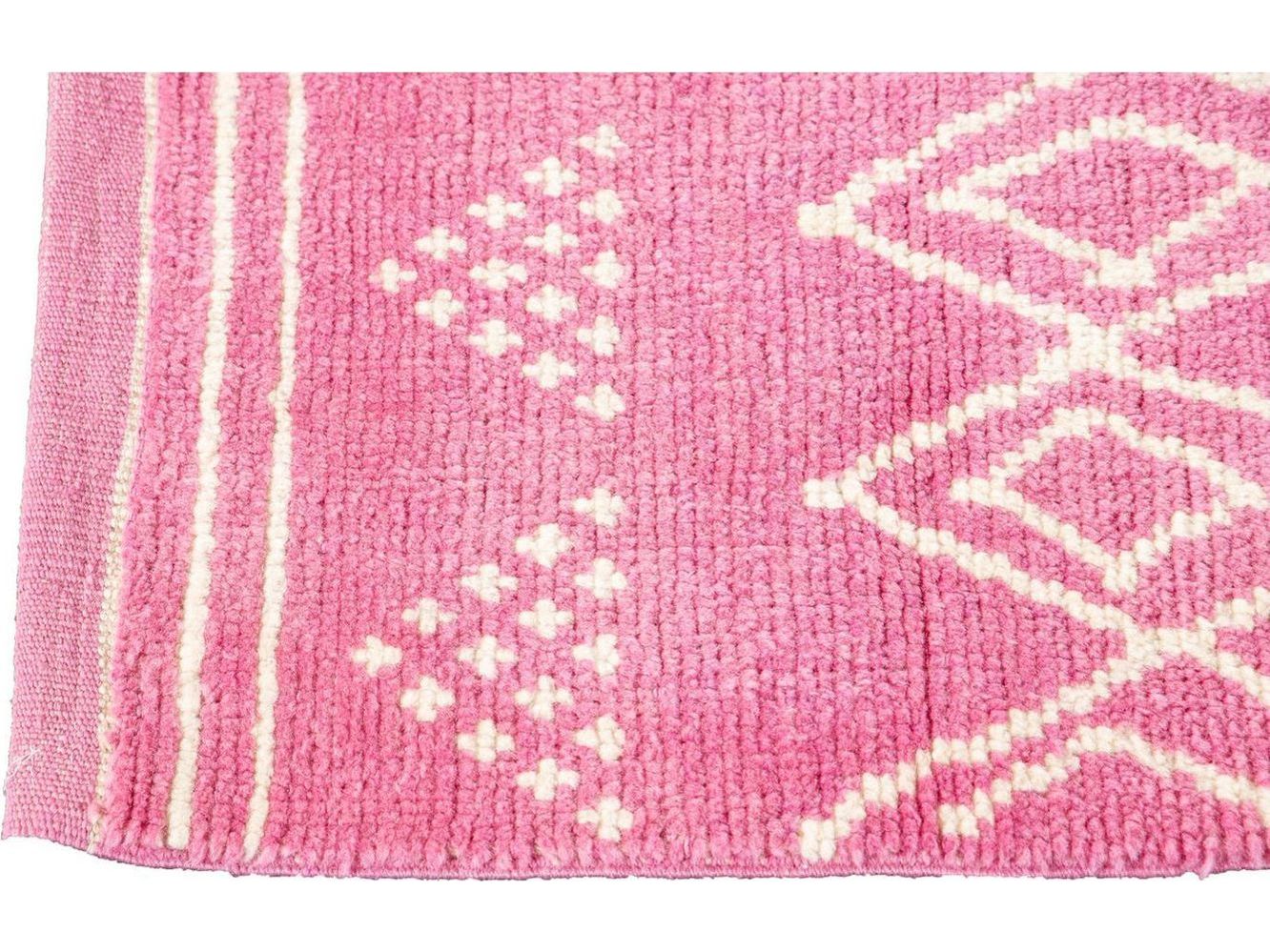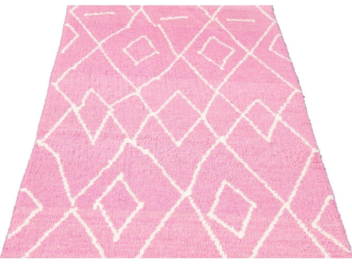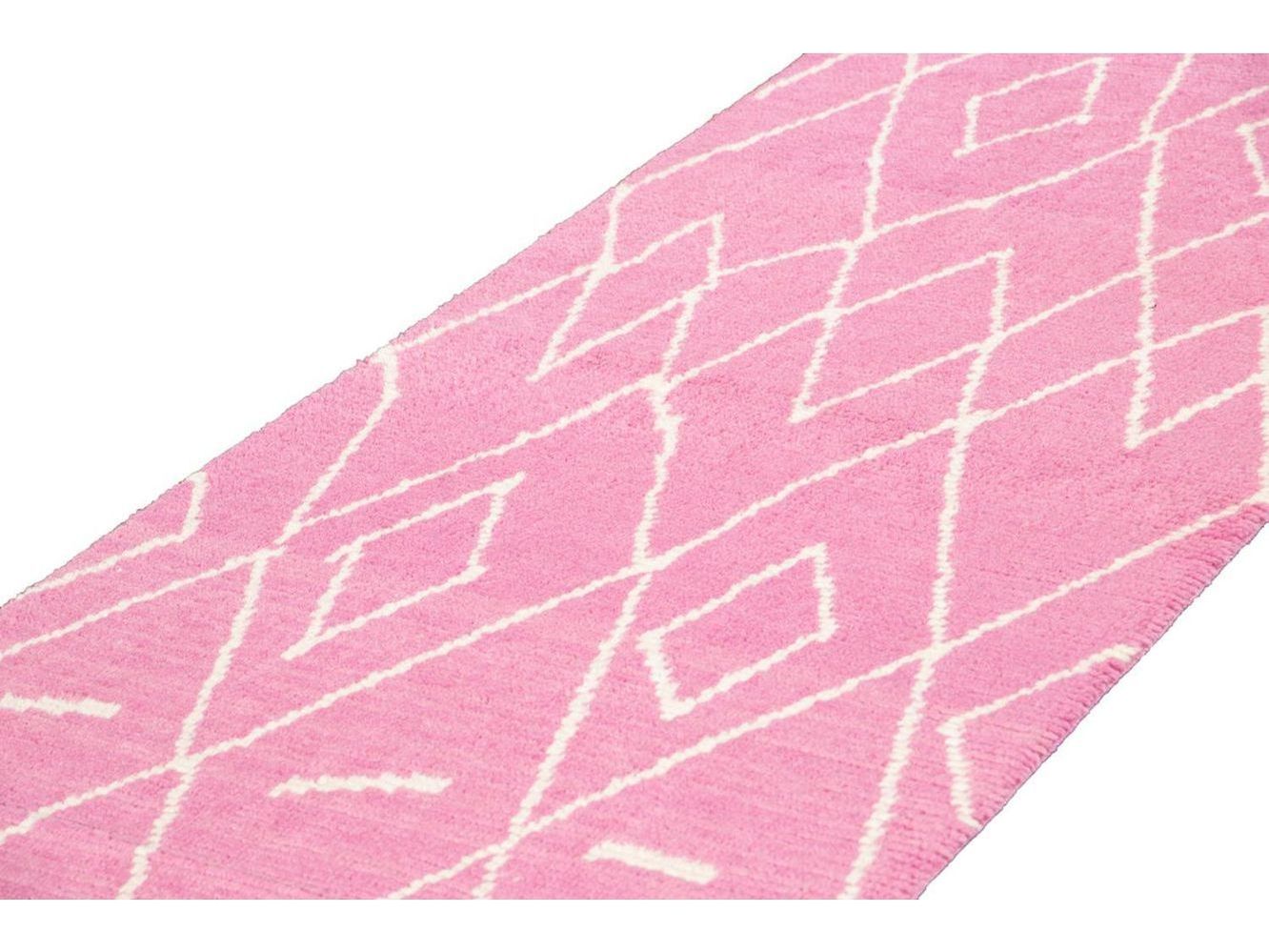 Beautiful contemporary Moroccan-style runner rug, hand-knotted wool with a pink field, ivory accents in a gorgeous all-over tribal design.