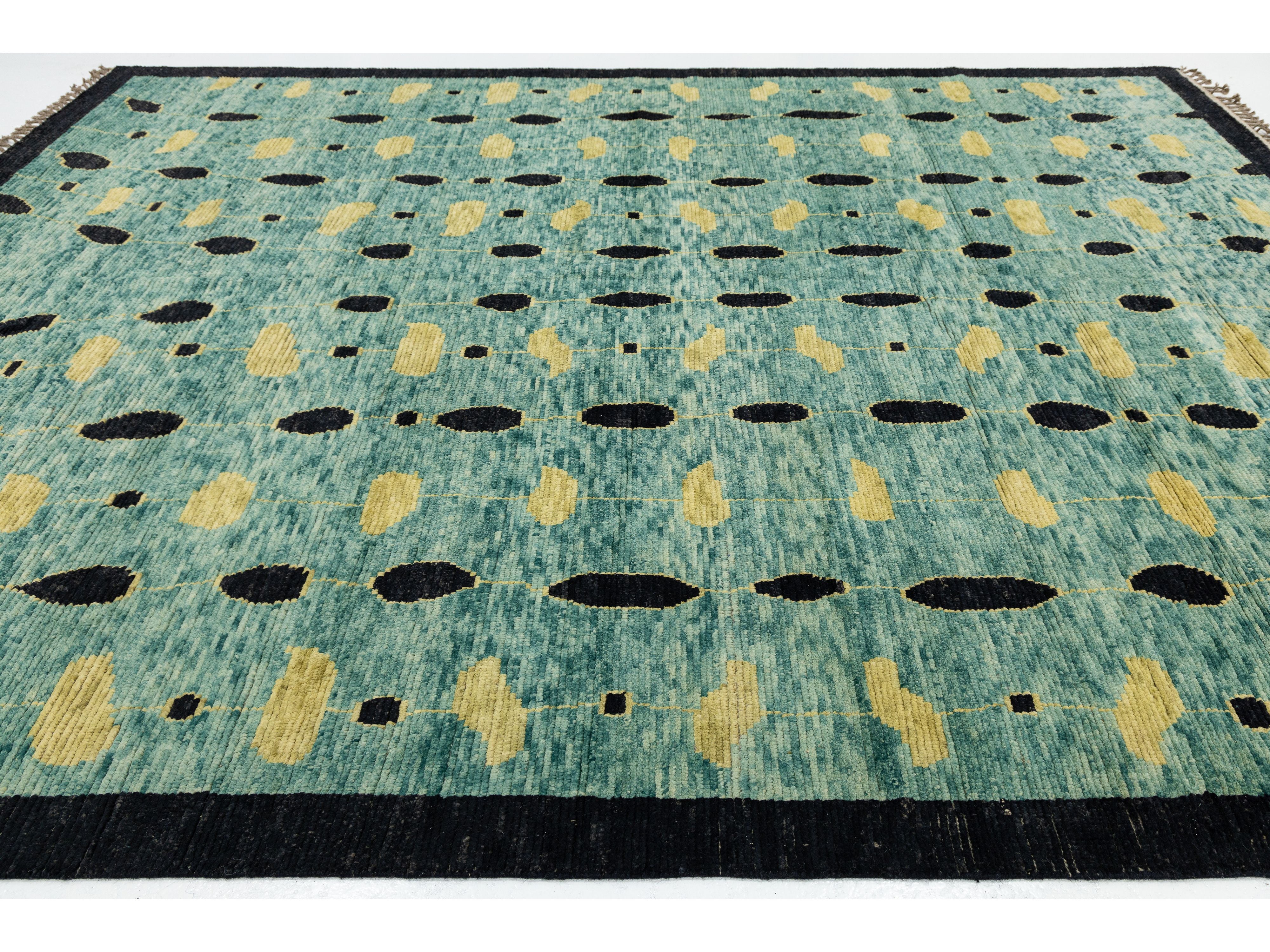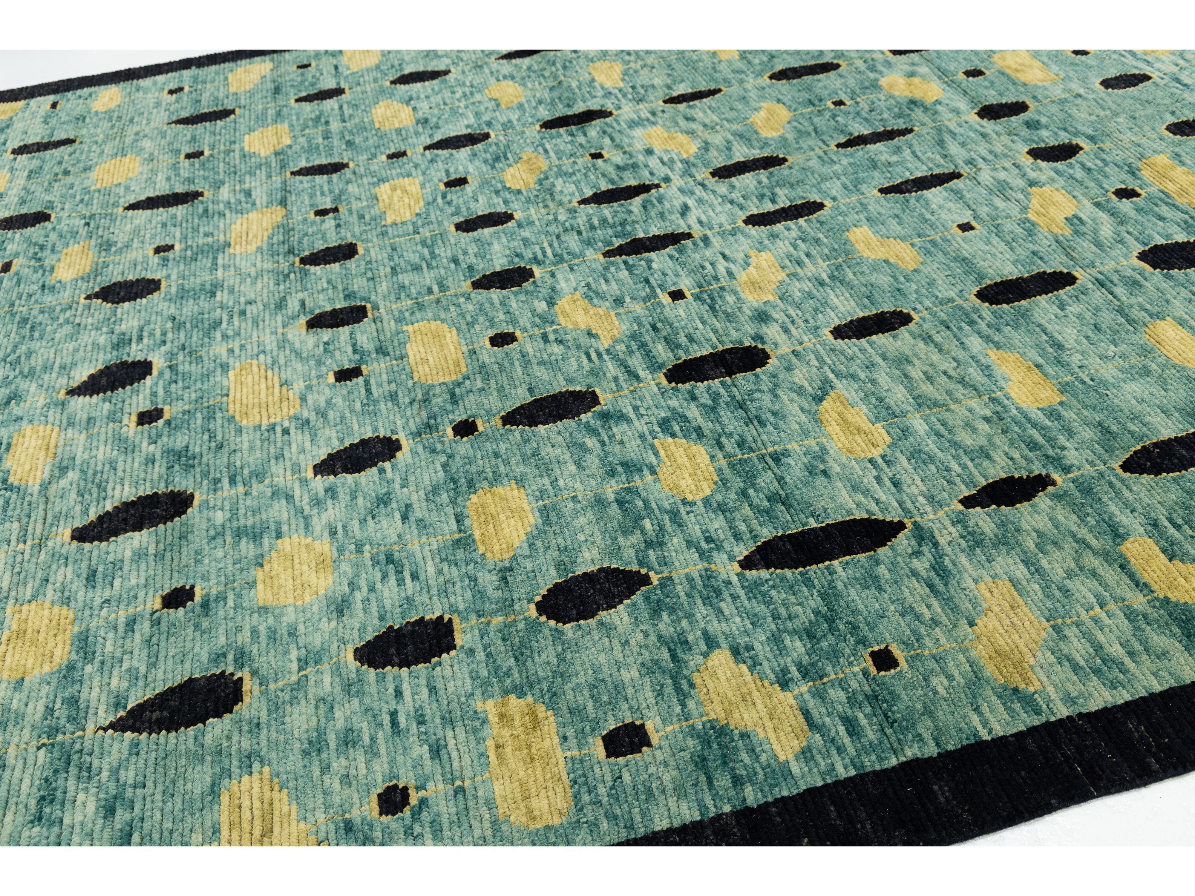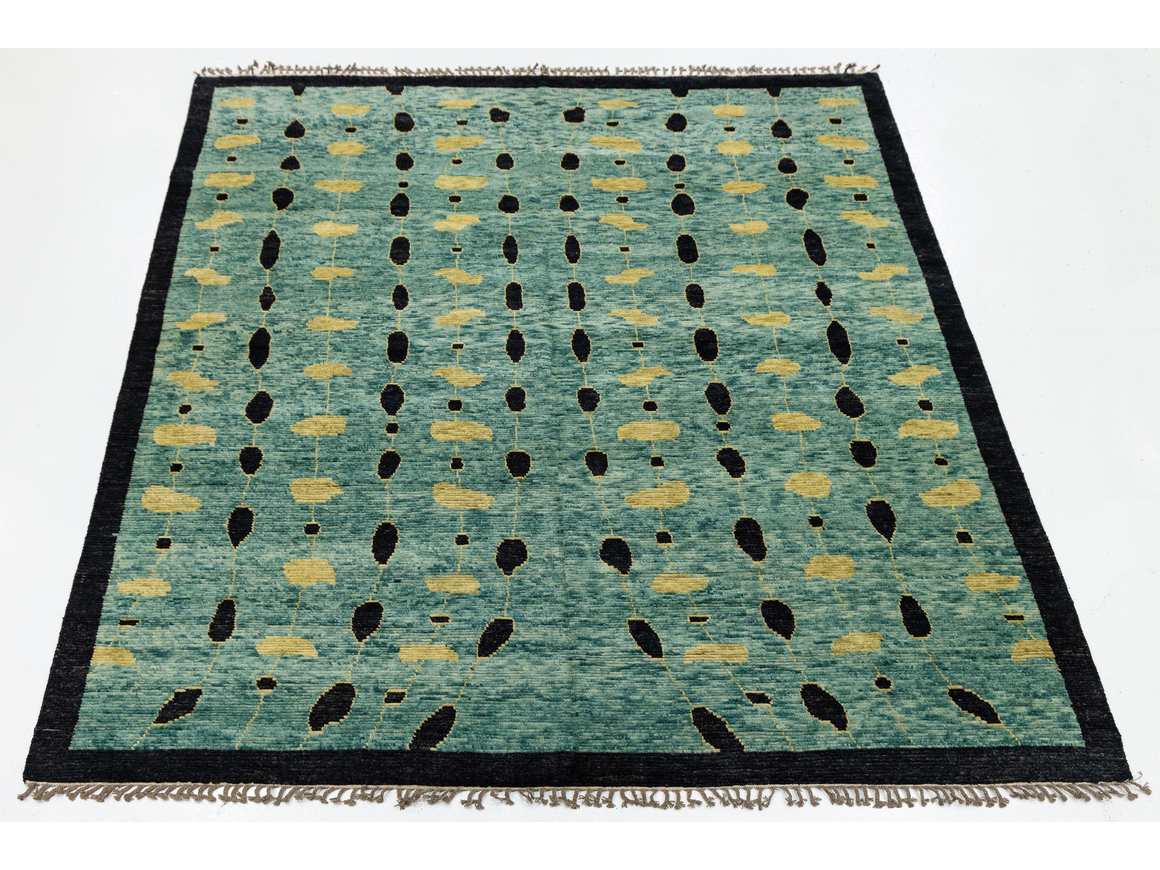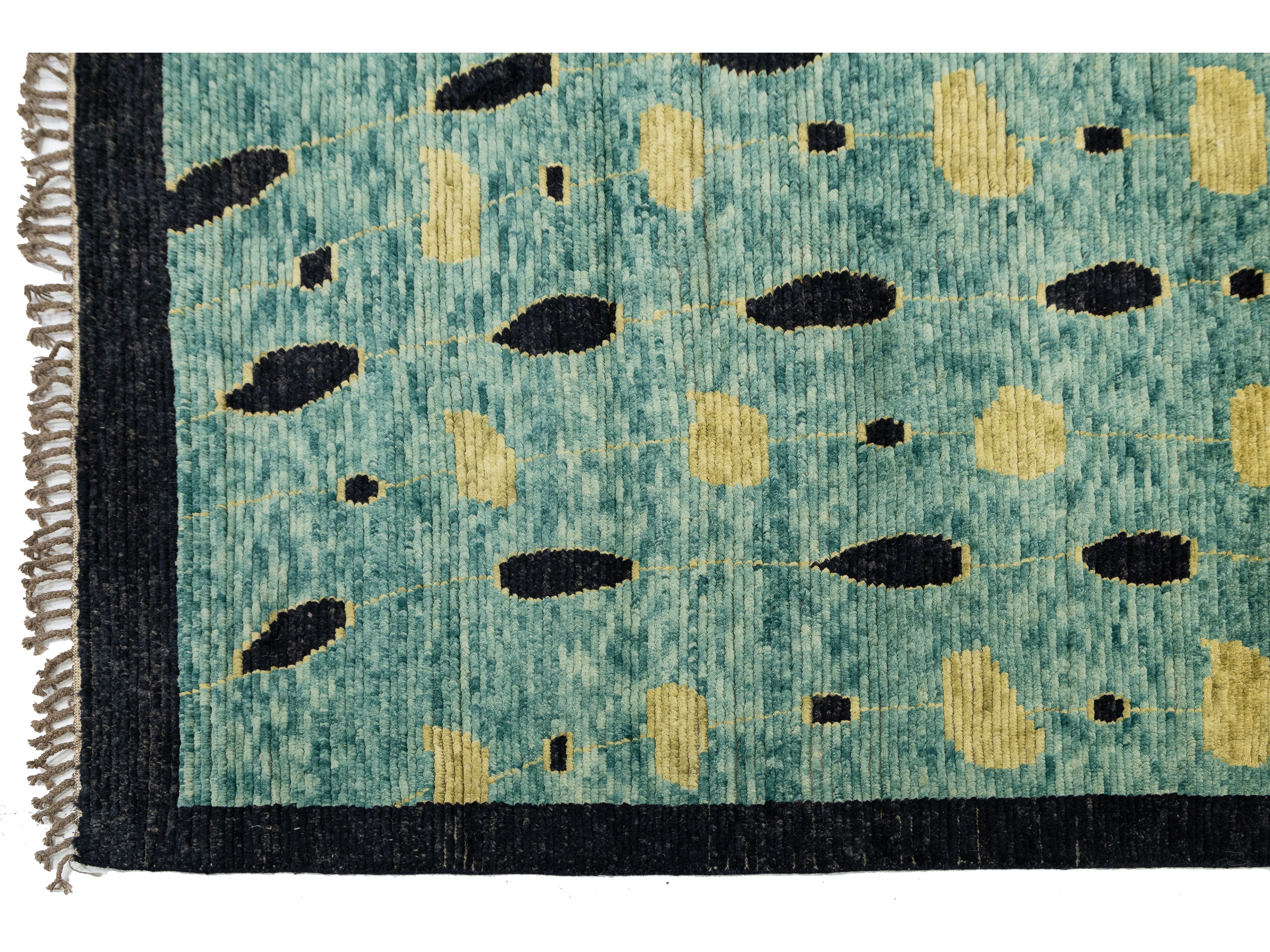 Elevate your space with this stunning Modern Moroccan-style wool rug, featuring a sophisticated fusion of traditional craftsmanship and contemporary abstract design. Set against a rich, textured teal-green field, the rug showcases a rhythmic pattern of hand-knotted charcoal and golden-ochre "raindrop" motifs. Crafted with high-quality wool, this piece offers a plush, durable pile that feels as luxurious as it looks. The striking contrast between the deep jewel tones and the organic, floating shapes makes it a perfect focal point for minimalist, mid-century modern, or eclectic interiors. This rug measures 10'2" x 13'6".