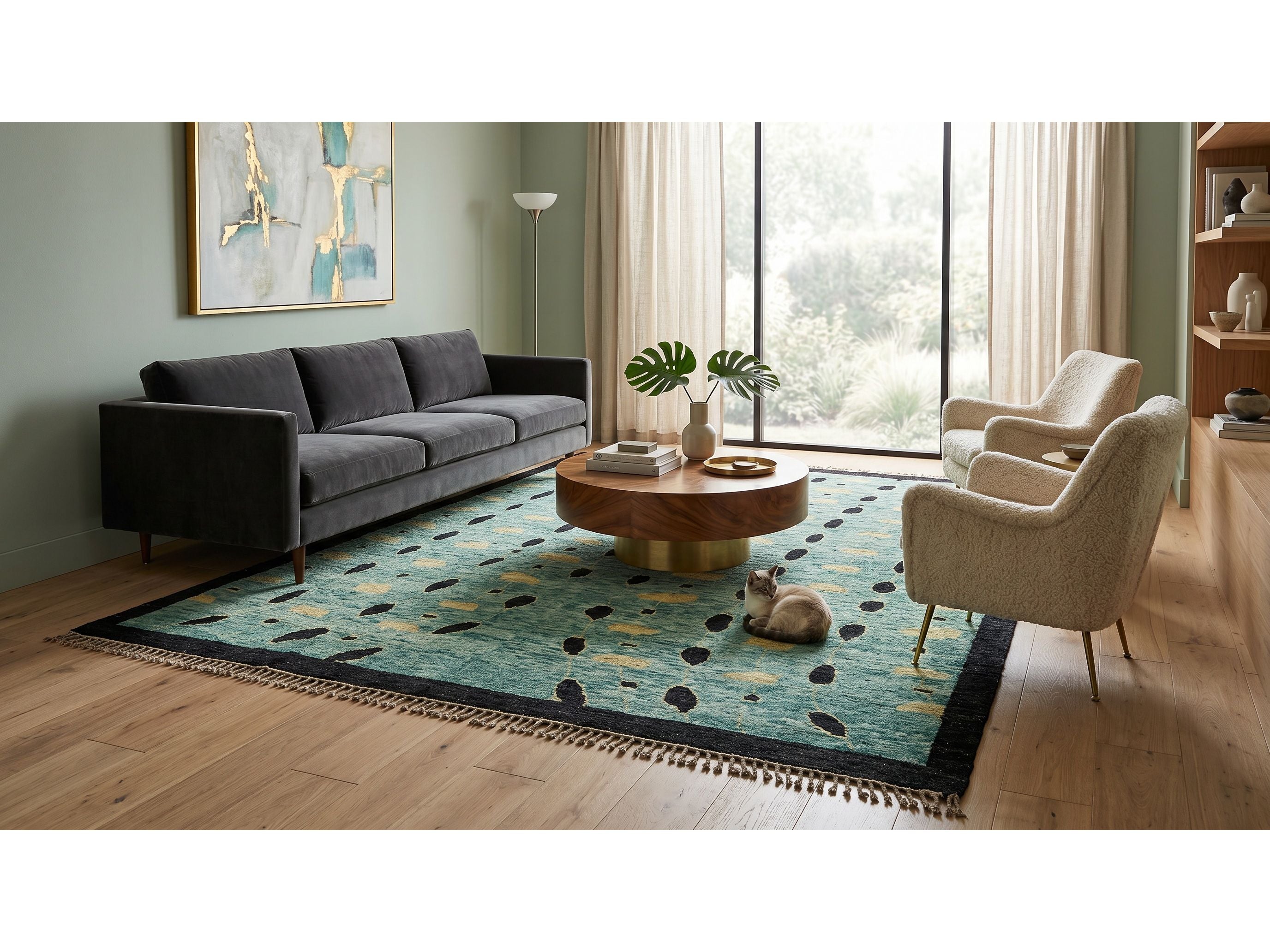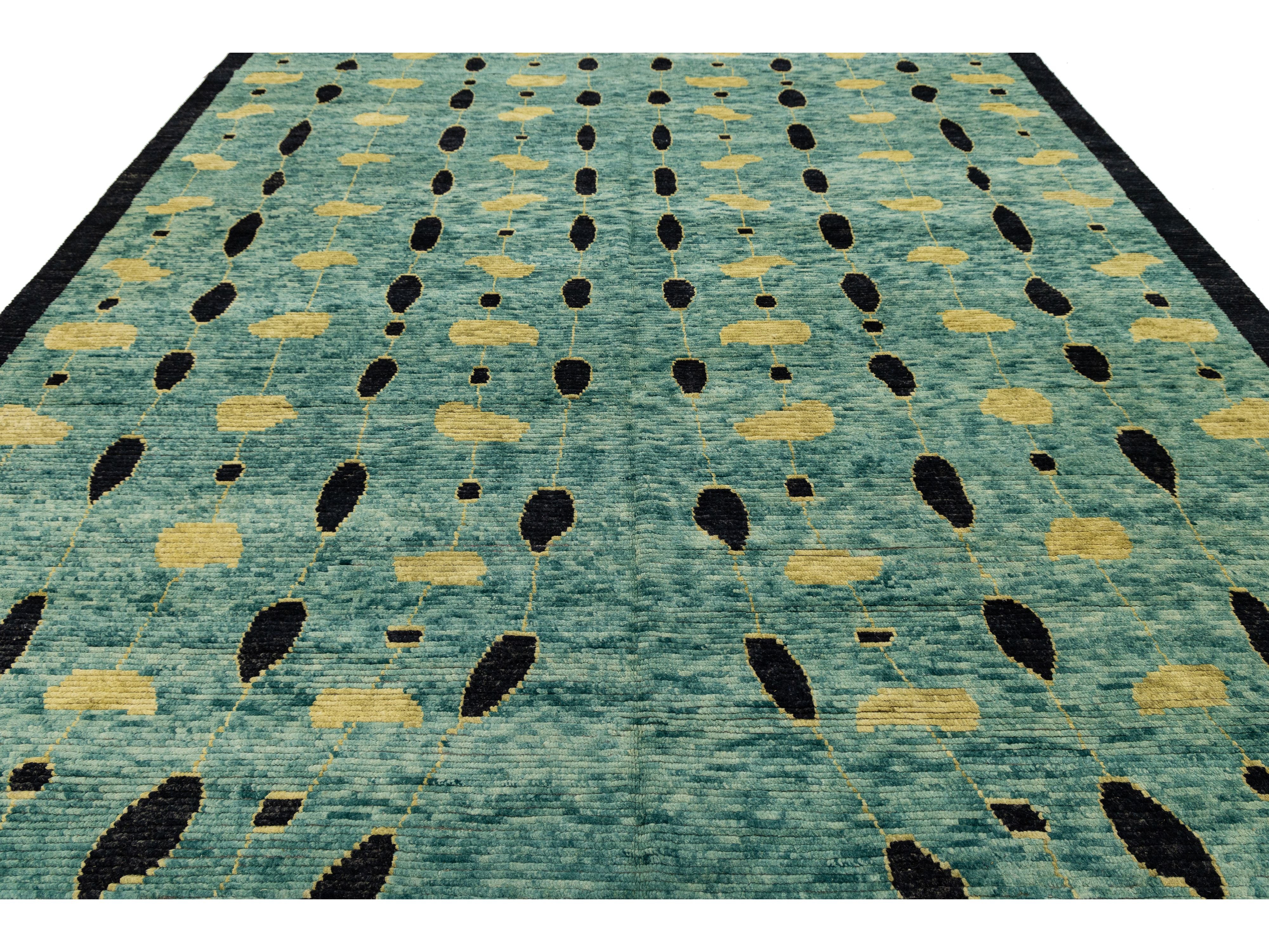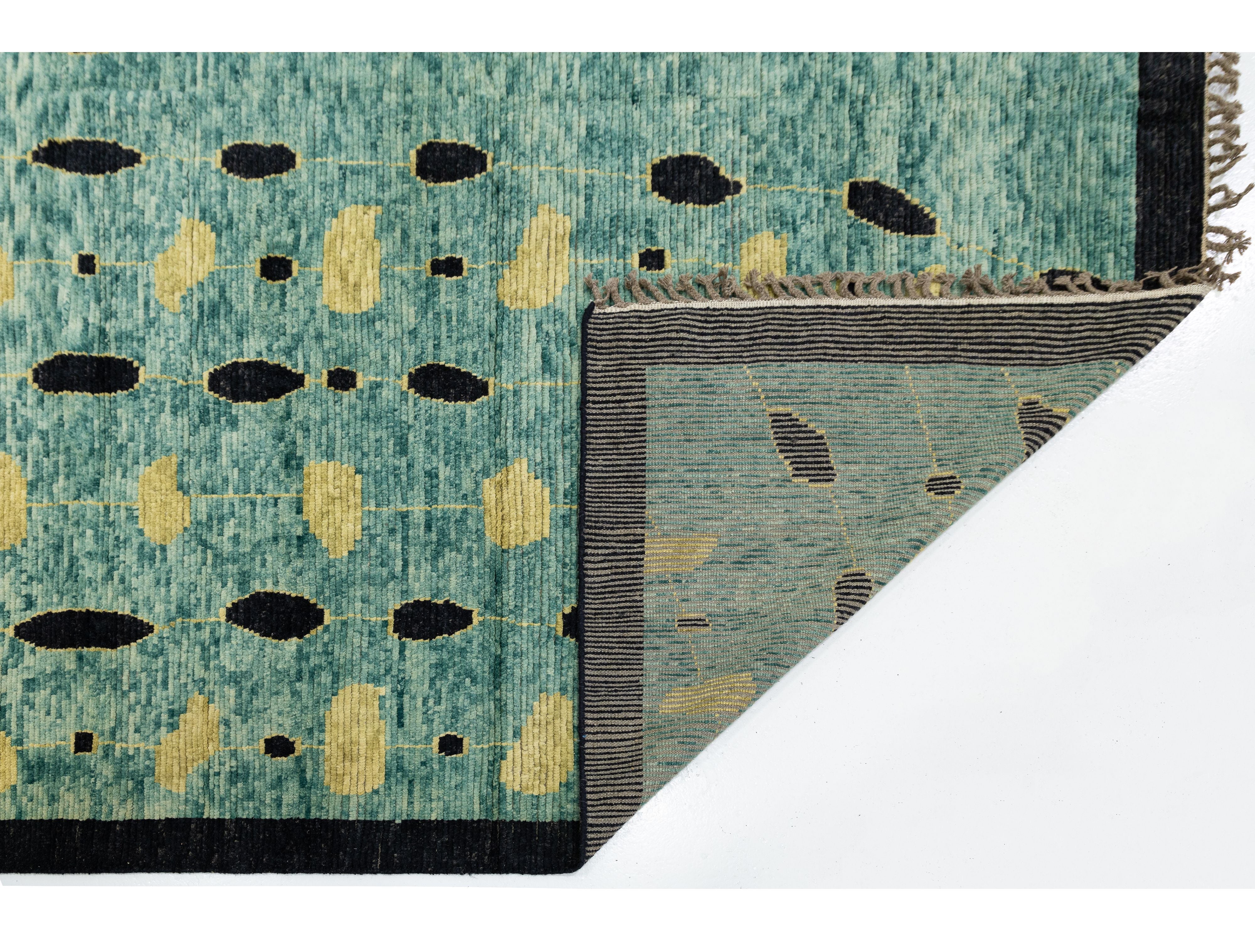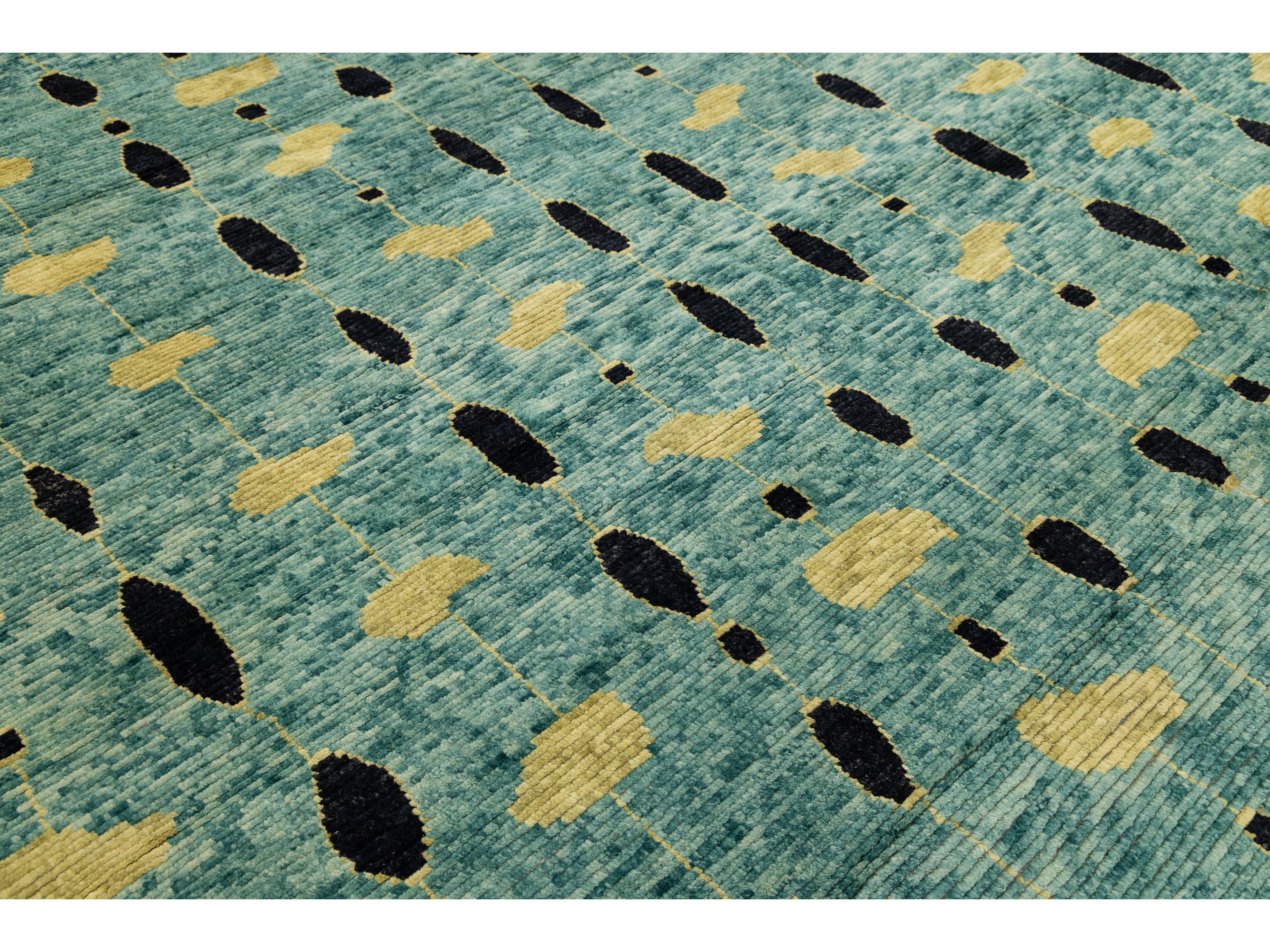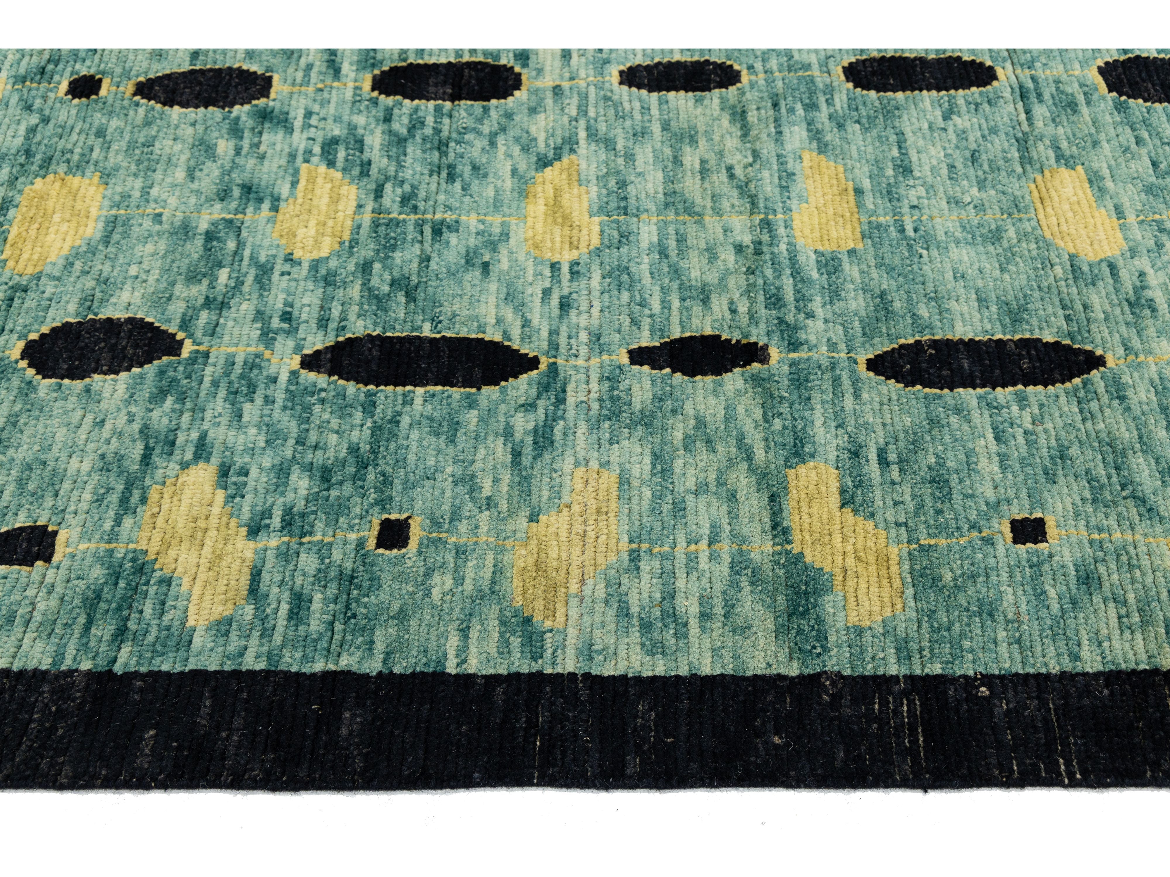 Elevate your space with this stunning Modern Moroccan-style wool rug, featuring a sophisticated fusion of traditional craftsmanship and contemporary abstract design. Set against a rich, textured teal-green field, the rug showcases a rhythmic pattern of hand-knotted charcoal and golden-ochre "raindrop" motifs. Crafted with high-quality wool, this piece offers a plush, durable pile that feels as luxurious as it looks. The striking contrast between the deep jewel tones and the organic, floating shapes makes it a perfect focal point for minimalist, mid-century modern, or eclectic interiors. This rug measures 10'2" x 13'6".