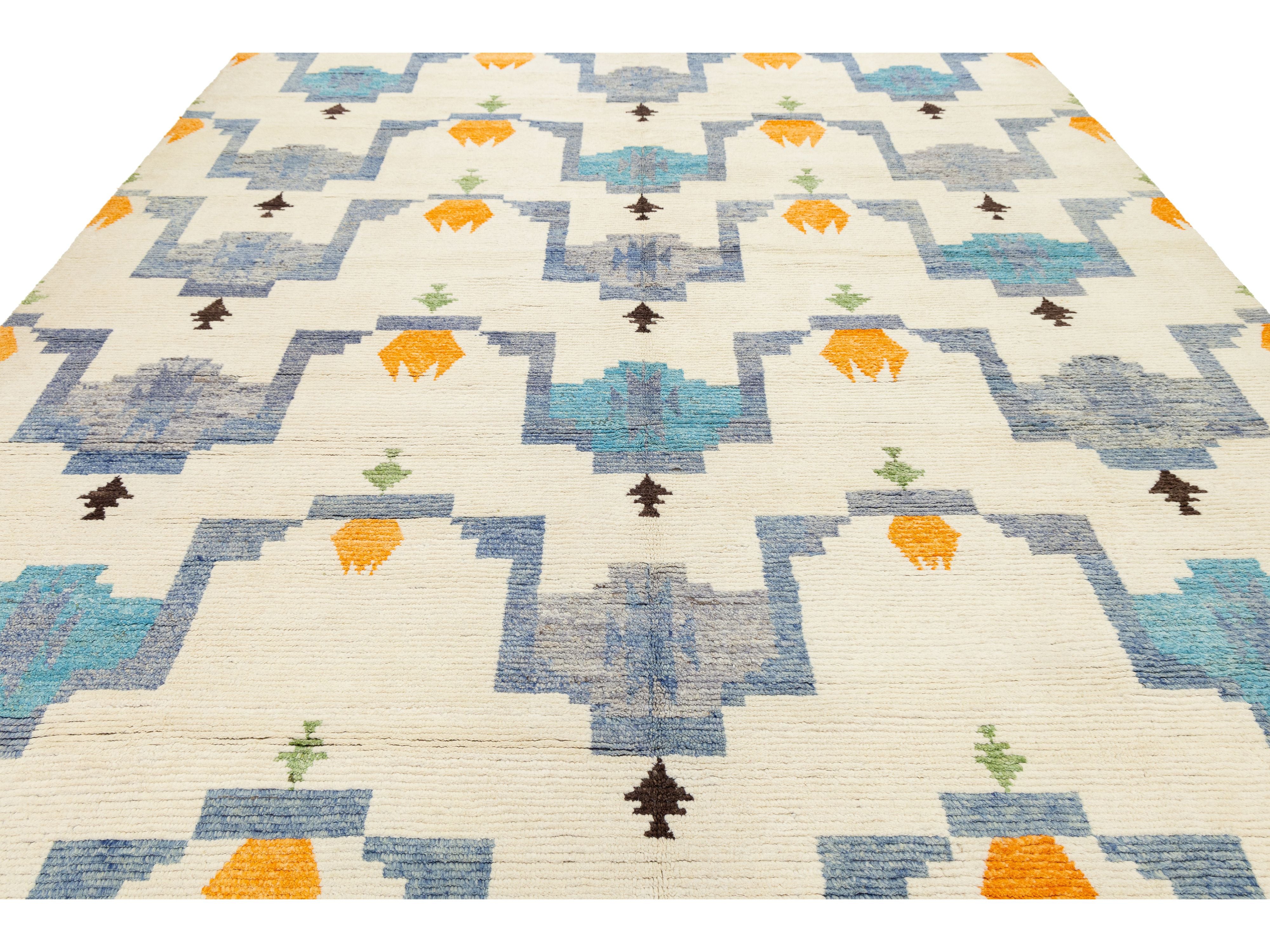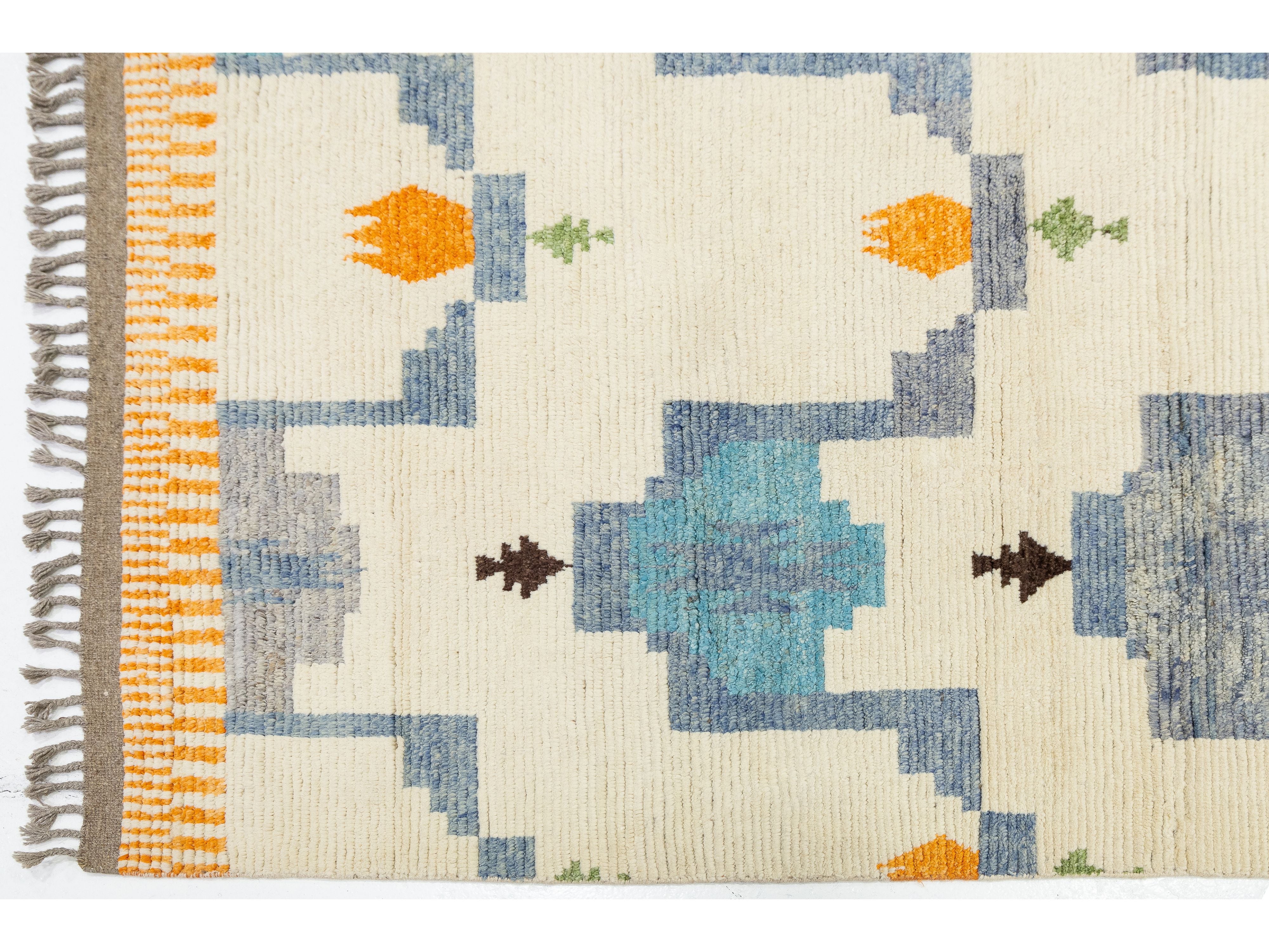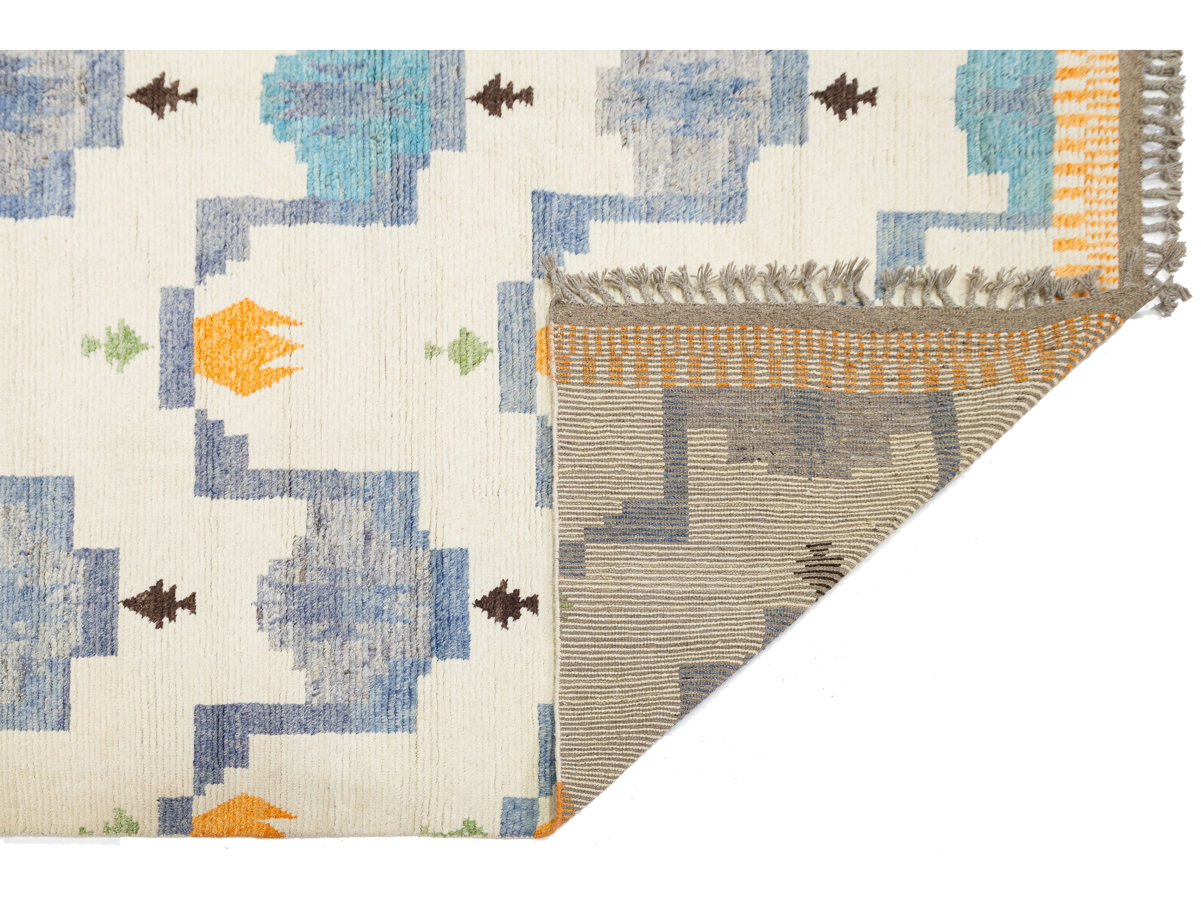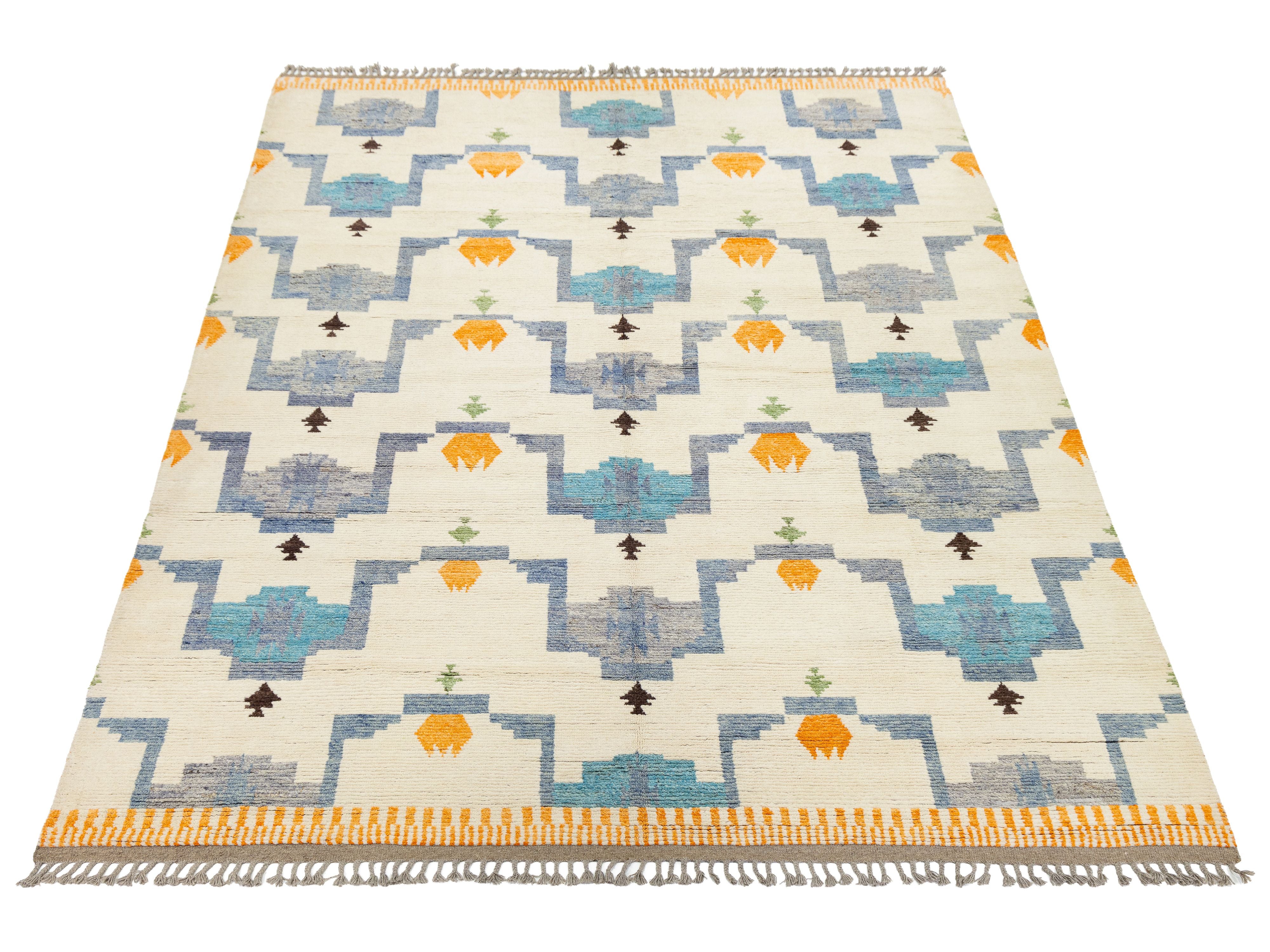 Elevate your space with this contemporary Moroccan-inspired rug. Hand-knotted from durable wool, it features a refreshing palette of sky blue, soft slate, and vibrant marigold against a creamy ivory field. The playful geometric motifs and subtle peaks create a rhythmic design that blends the ancient with the modern. Ideal for high-traffic areas, it adds a versatile splash of color to any room. This rug measures 10'3" x 14'11".