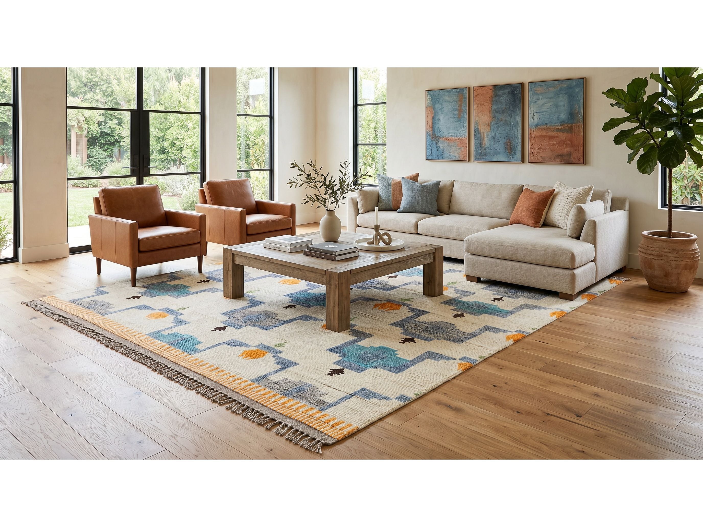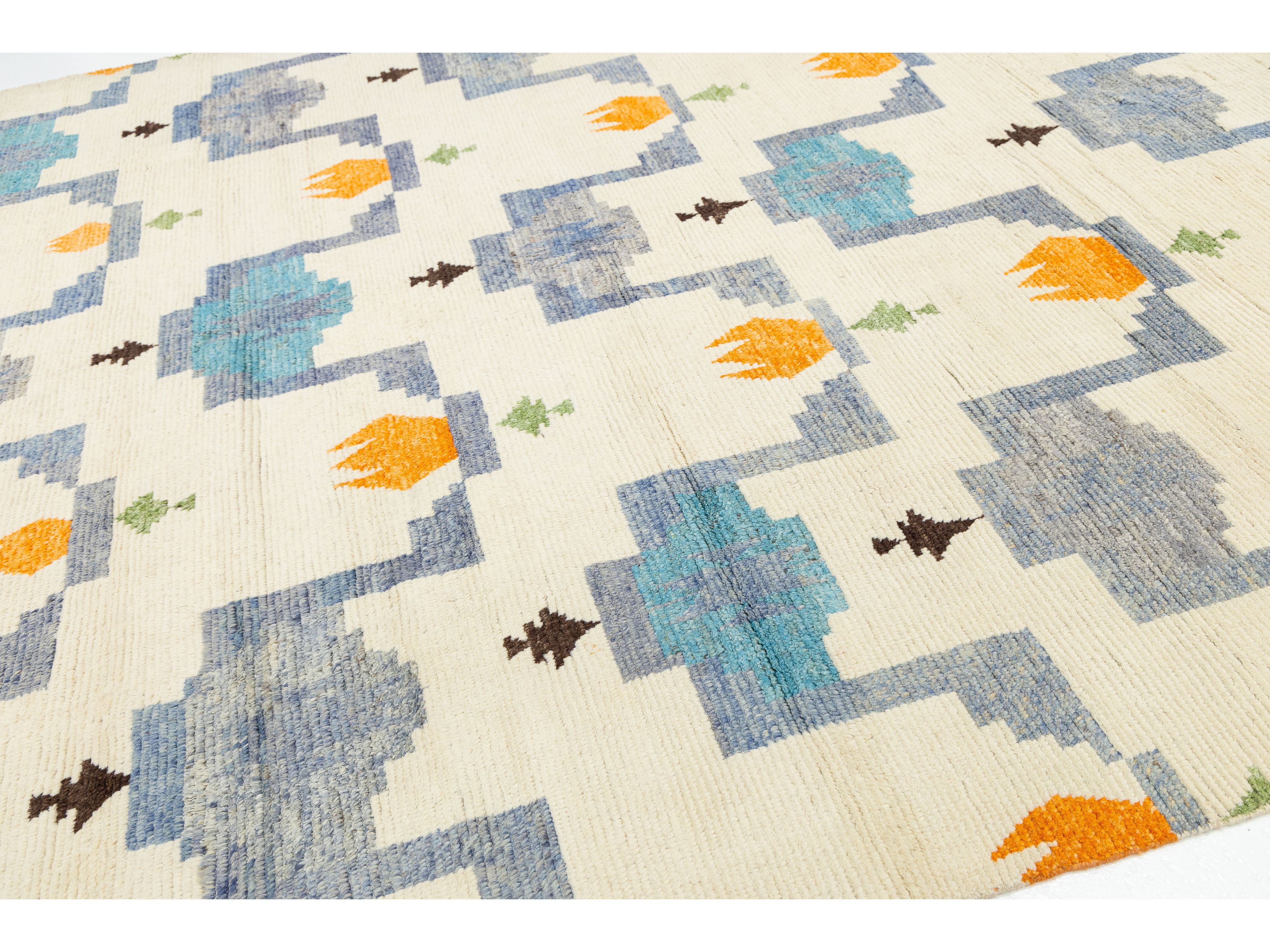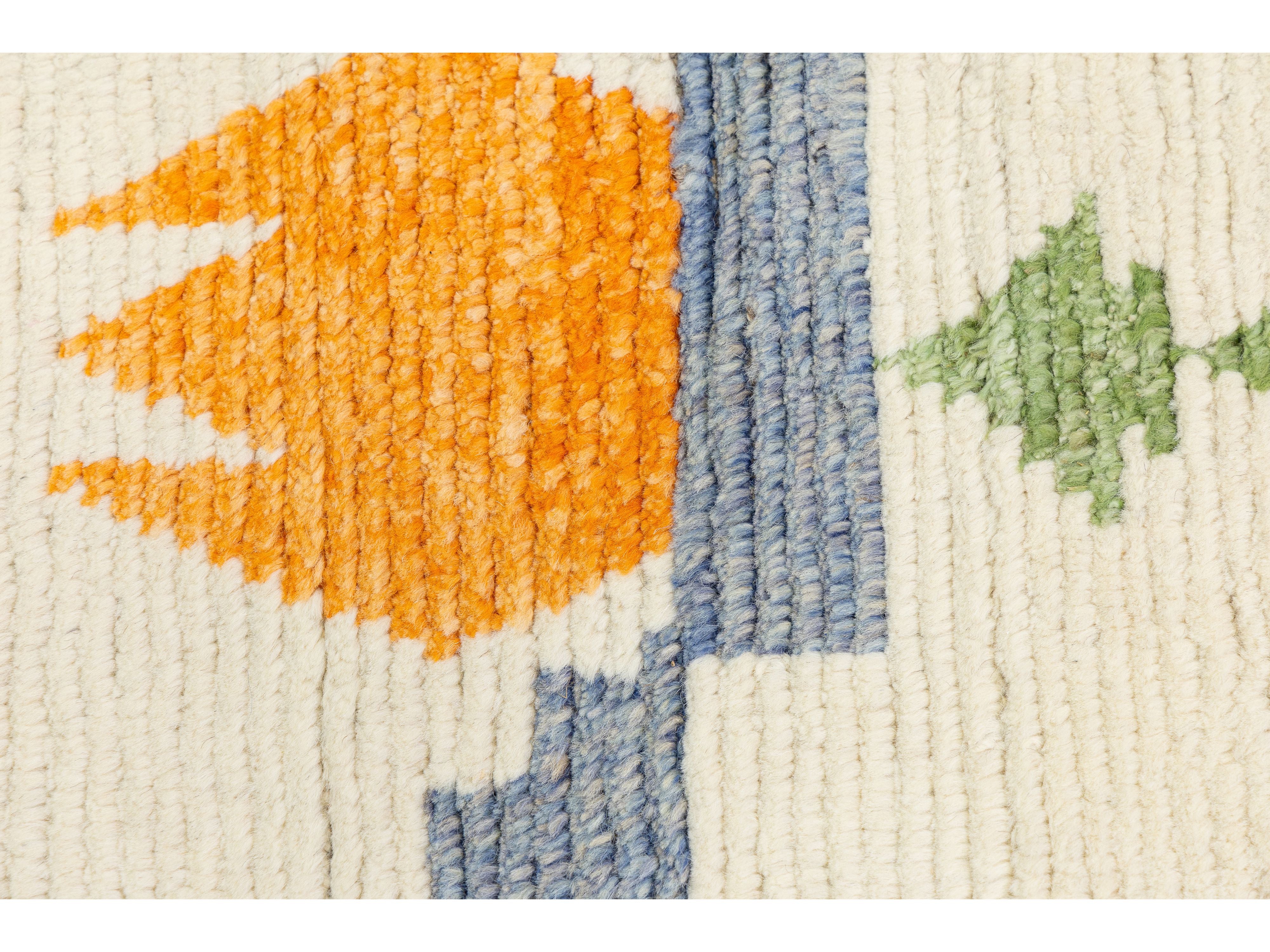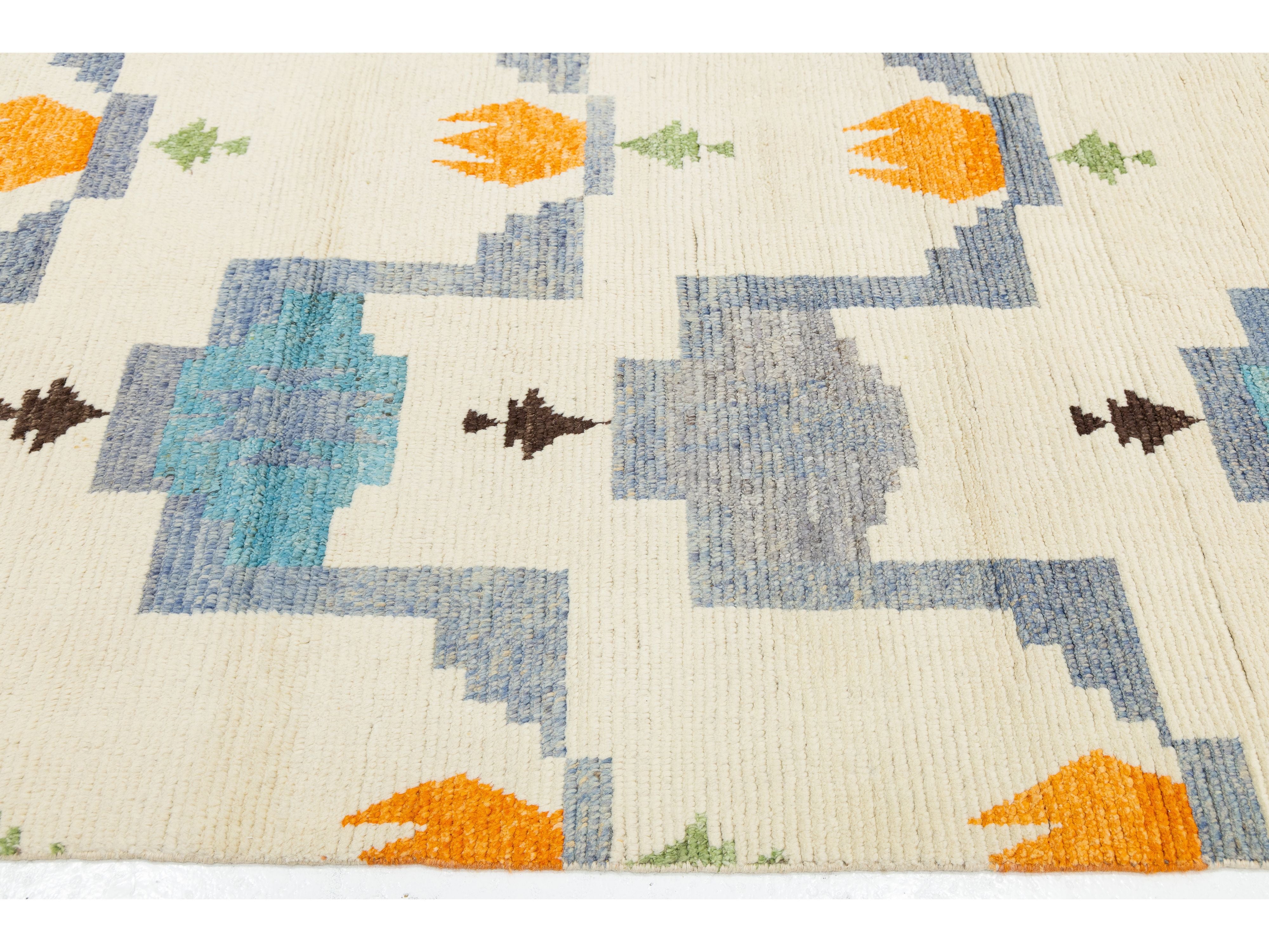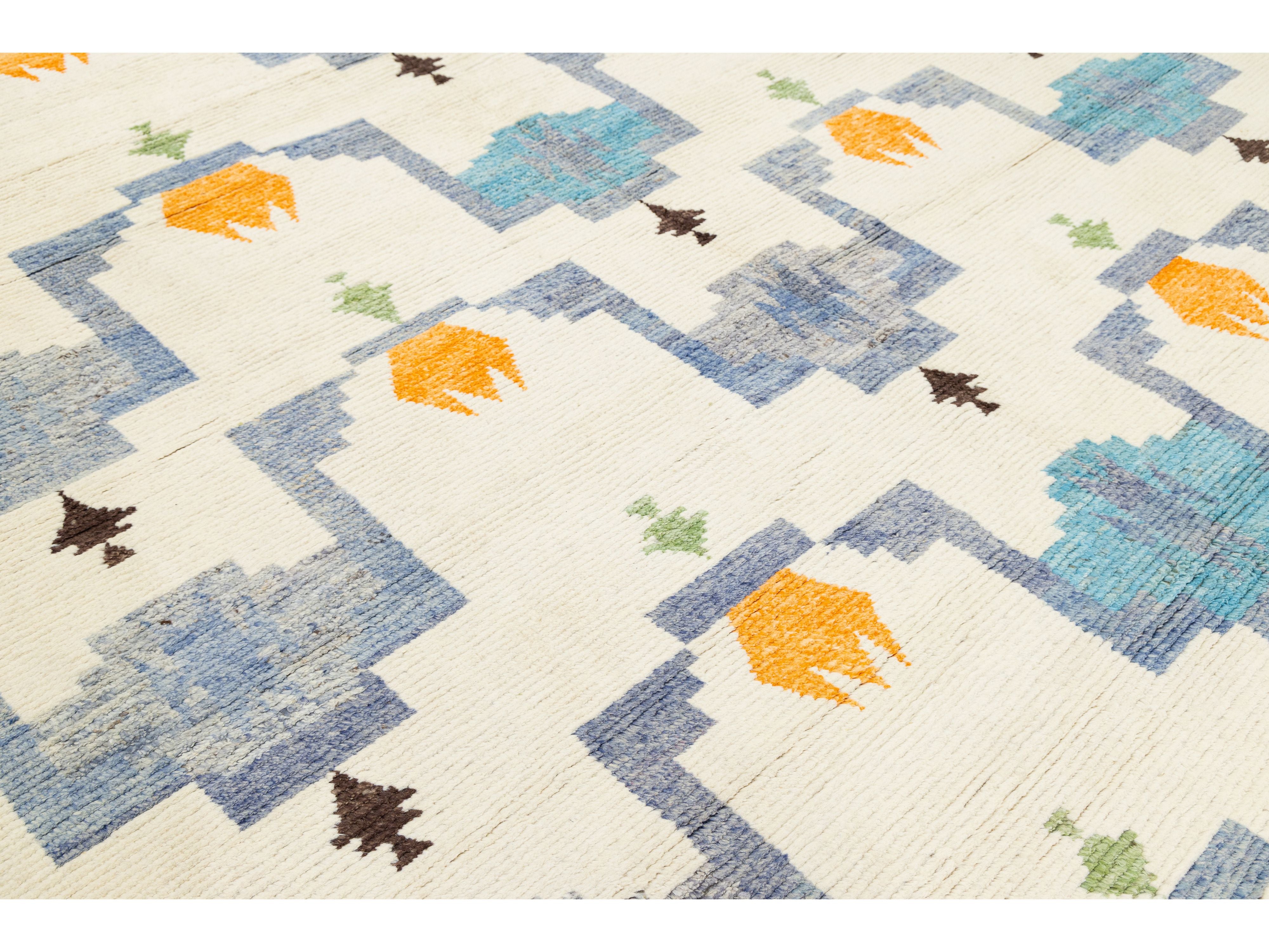 Elevate your space with this contemporary Moroccan-inspired rug. Hand-knotted from durable wool, it features a refreshing palette of sky blue, soft slate, and vibrant marigold against a creamy ivory field. The playful geometric motifs and subtle peaks create a rhythmic design that blends the ancient with the modern. Ideal for high-traffic areas, it adds a versatile splash of color to any room. This rug measures 10'3" x 14'11".