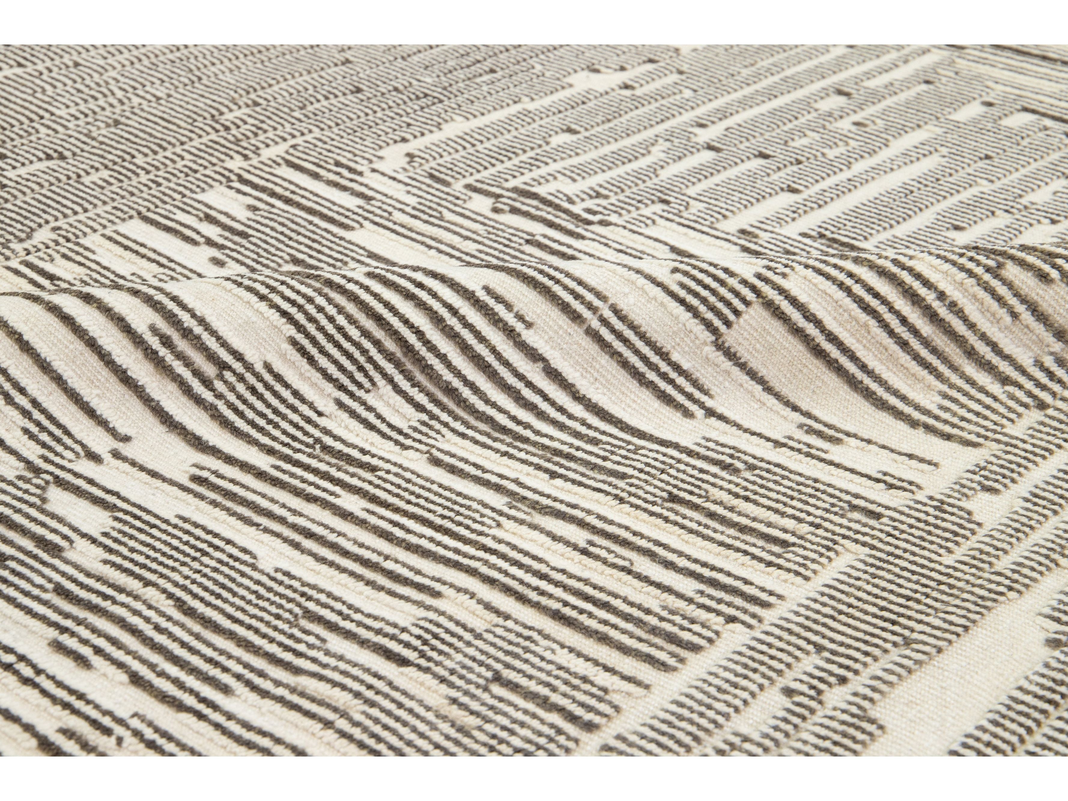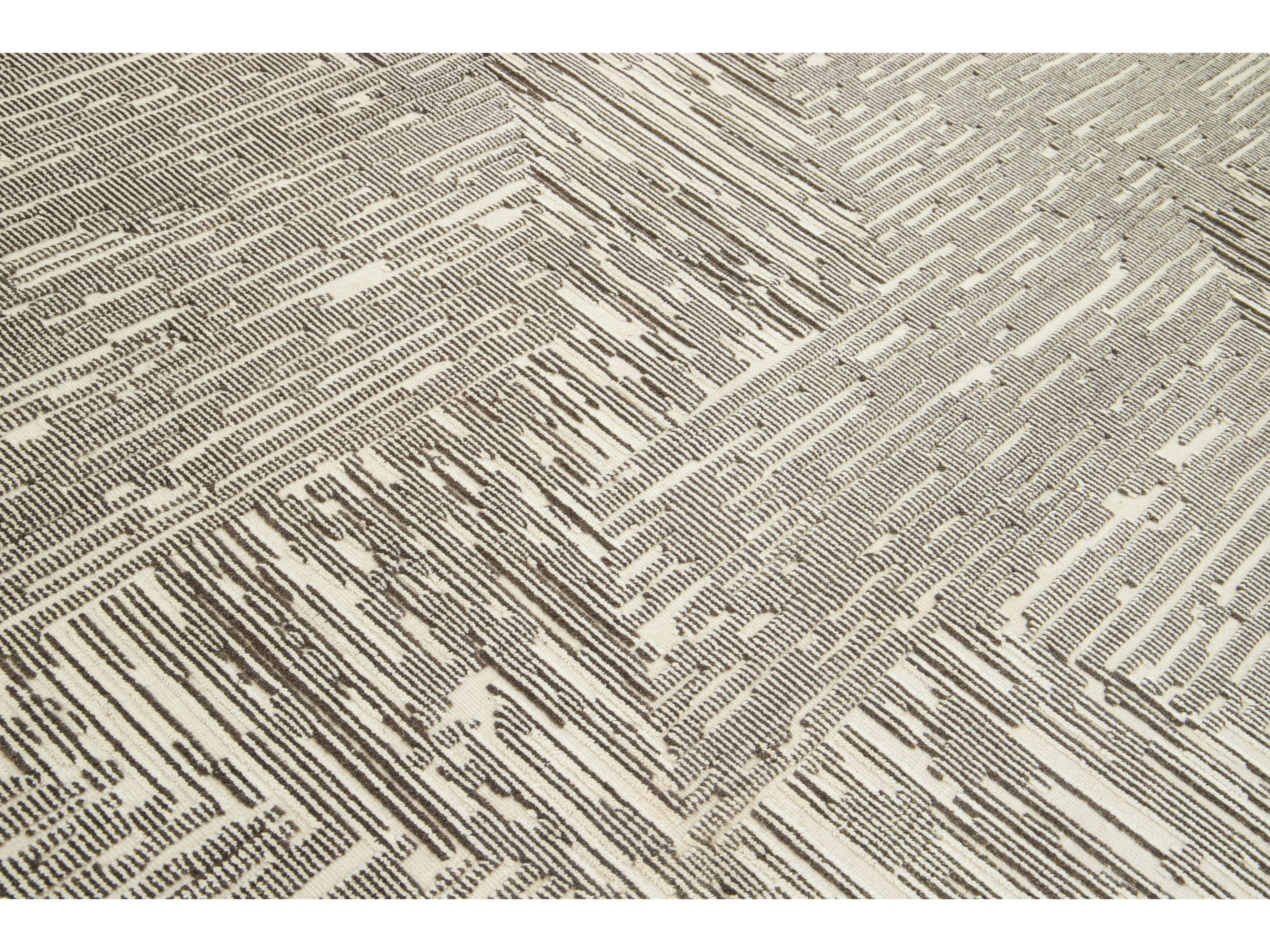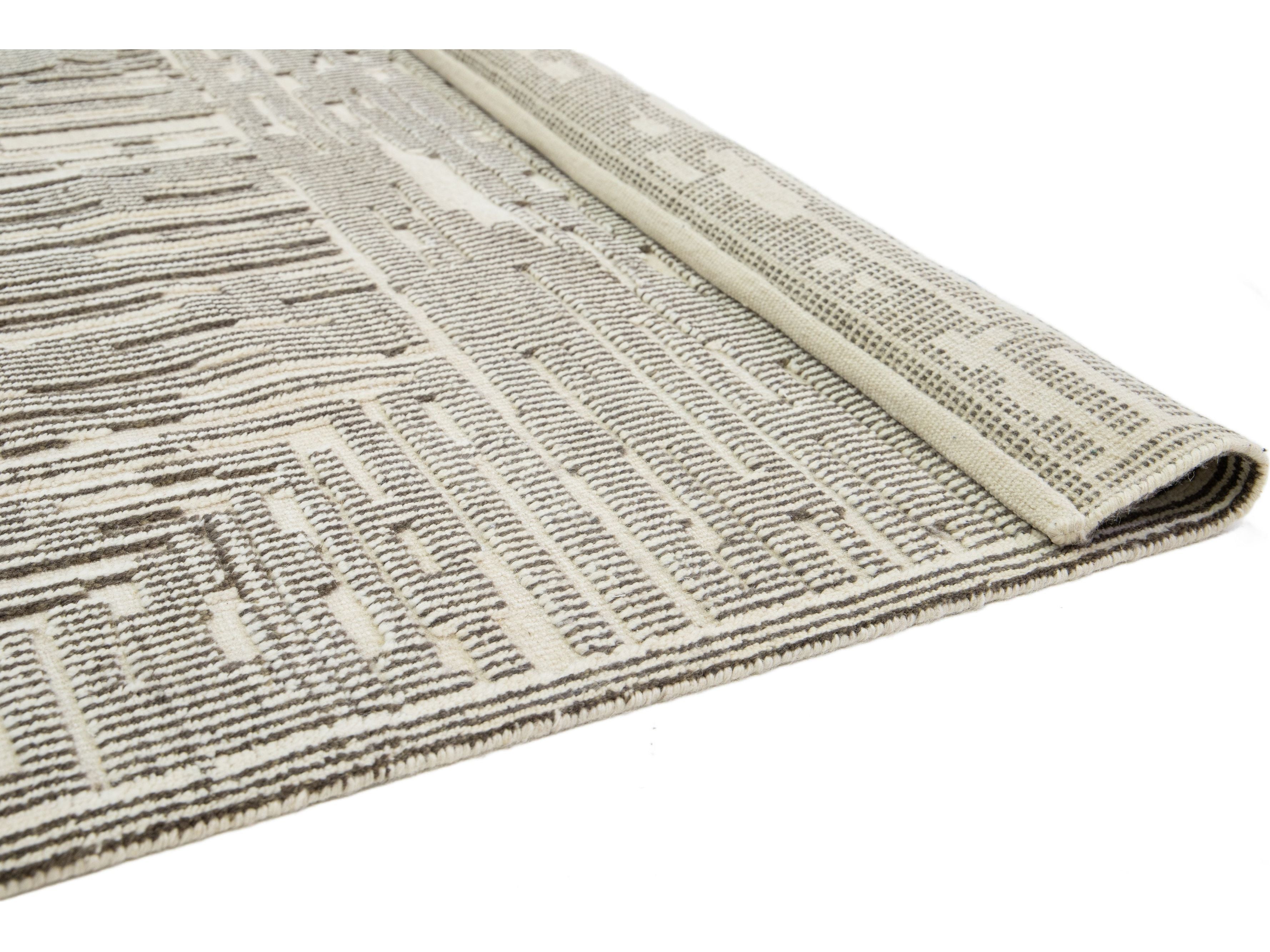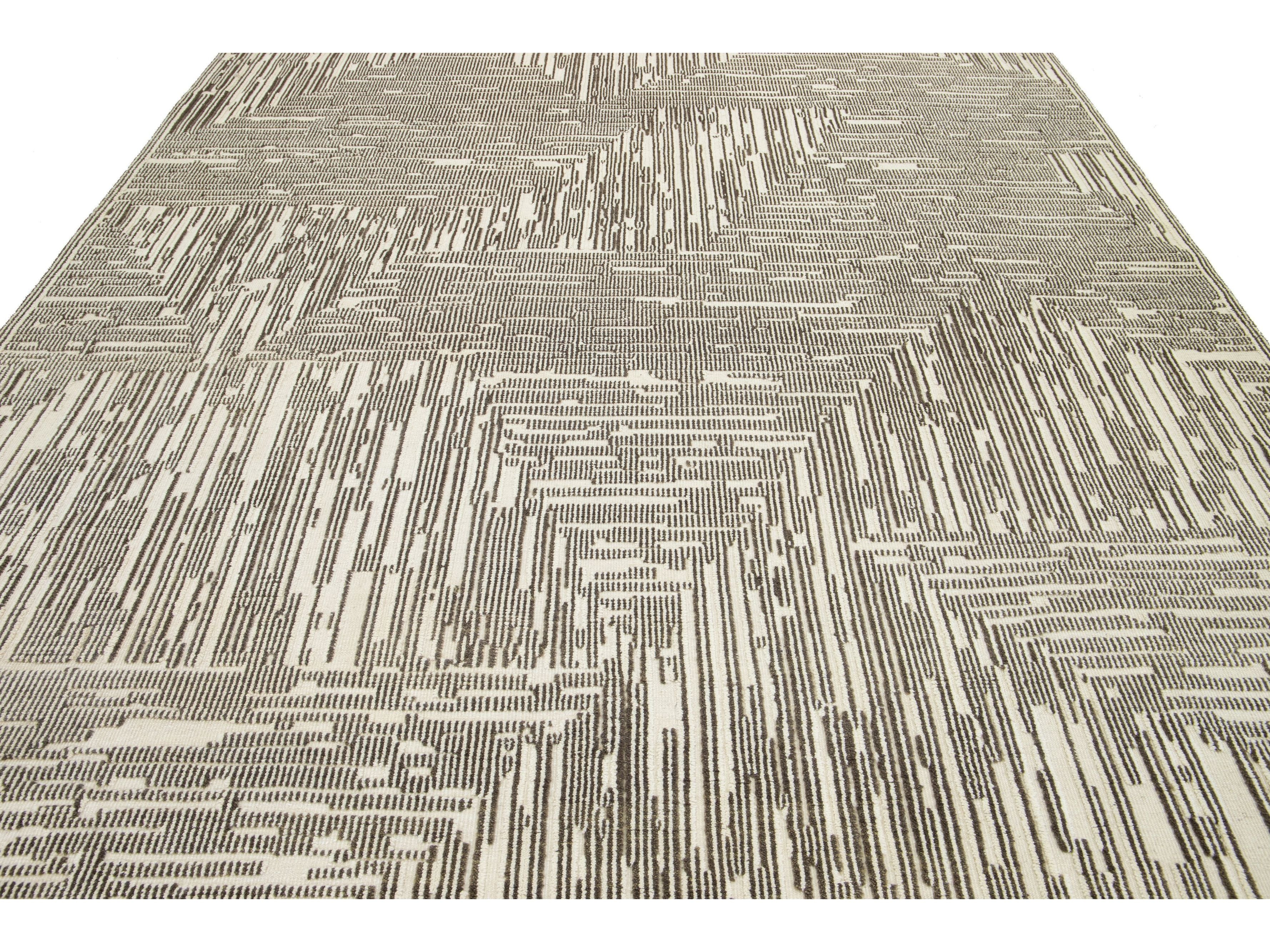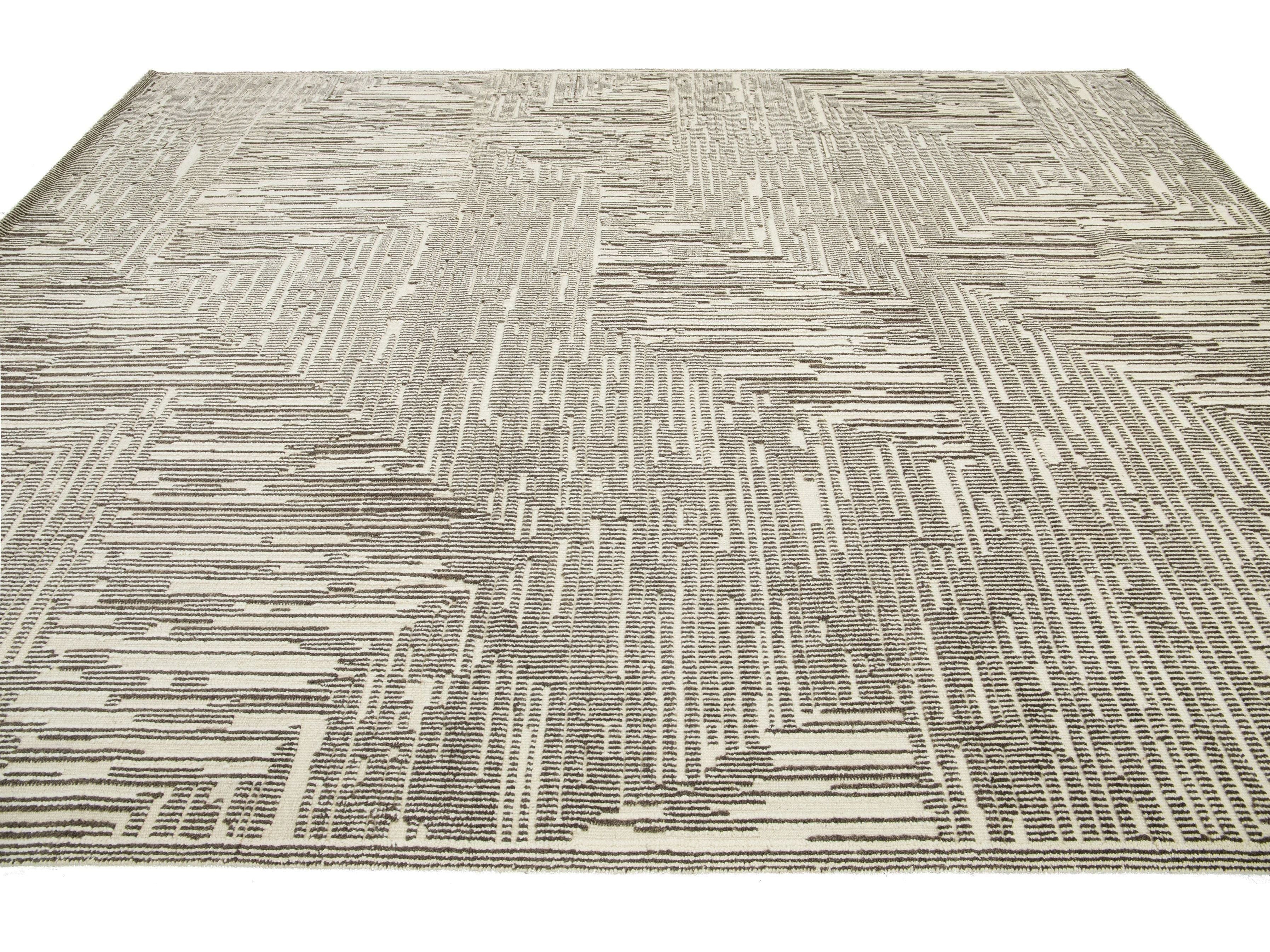 This hand-knotted wool rug showcases a luxurious beige and light brown base with a bold abstract pattern inspired by contemporary Moroccan design. This rug measures 12'1" x 15'.
