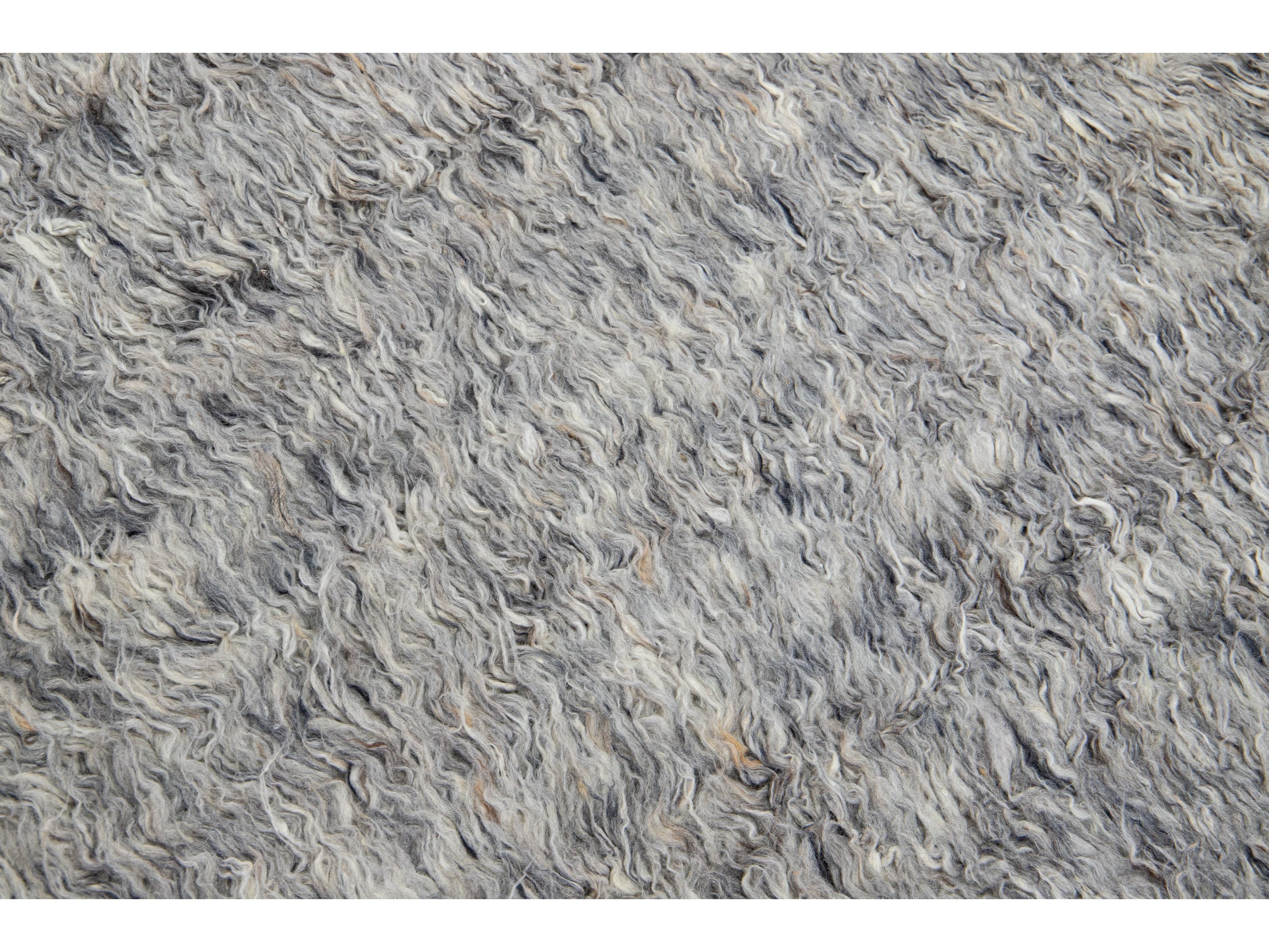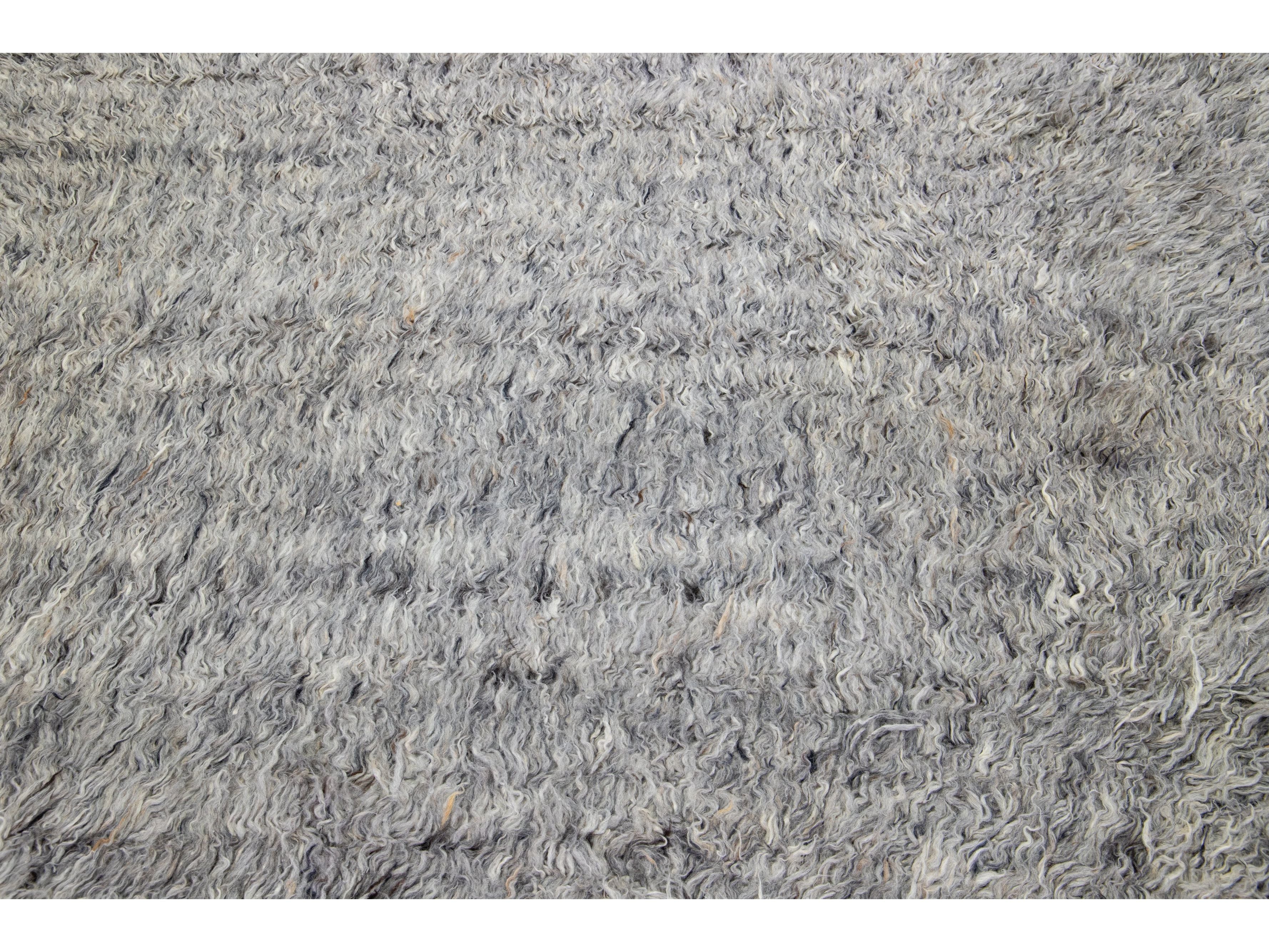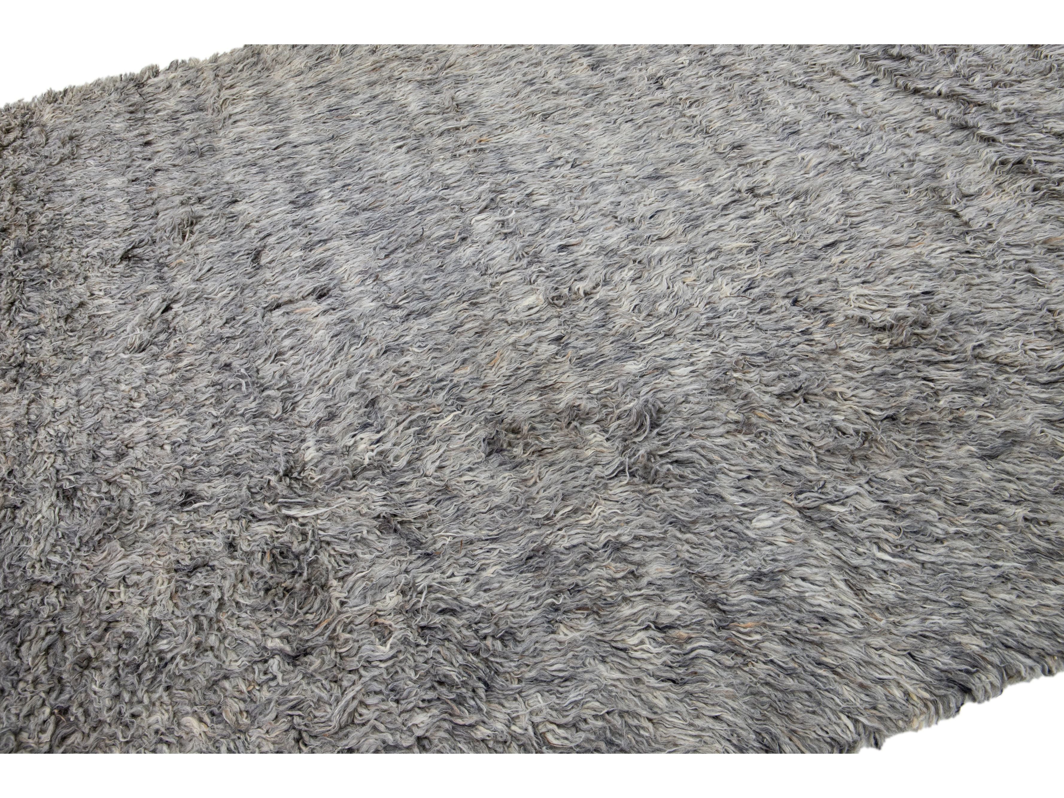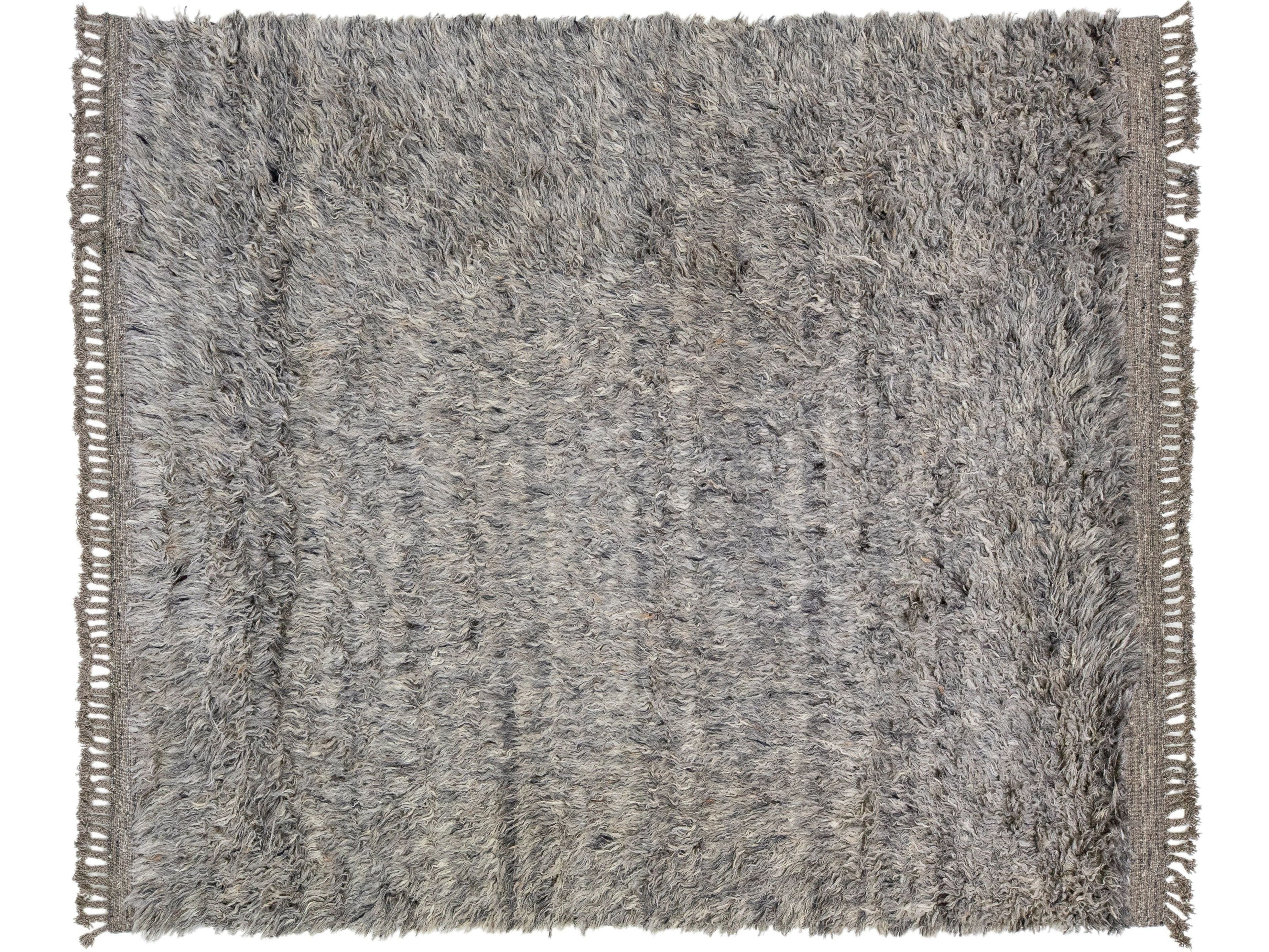 This elegant 8' 3" x 10' 3" Moroccan-style wool rug features a light gray-hued field with a striking solid design. Handmade with expert craftsmanship, this exquisite Modern rug will add a sophisticated touch to your décor.