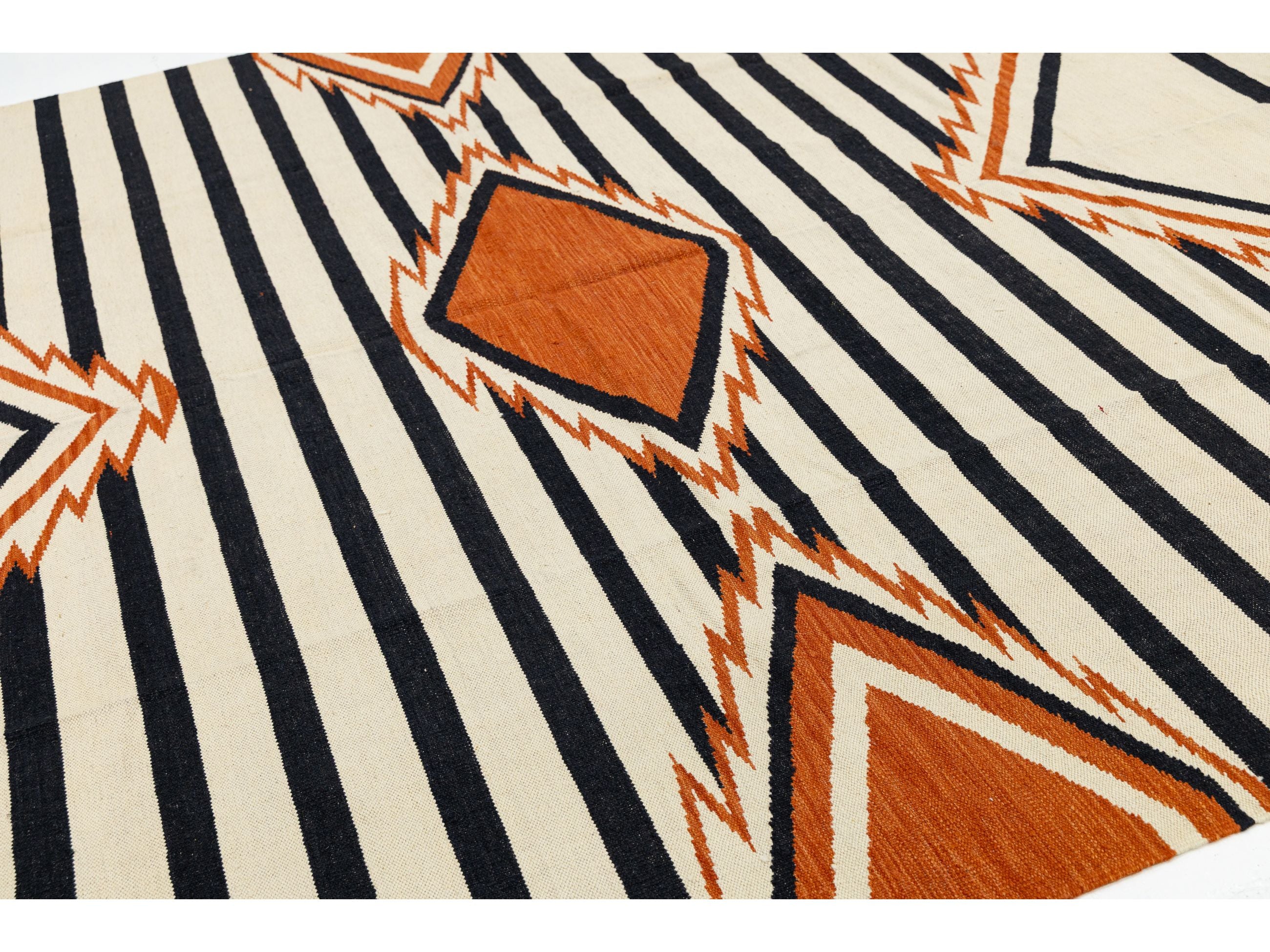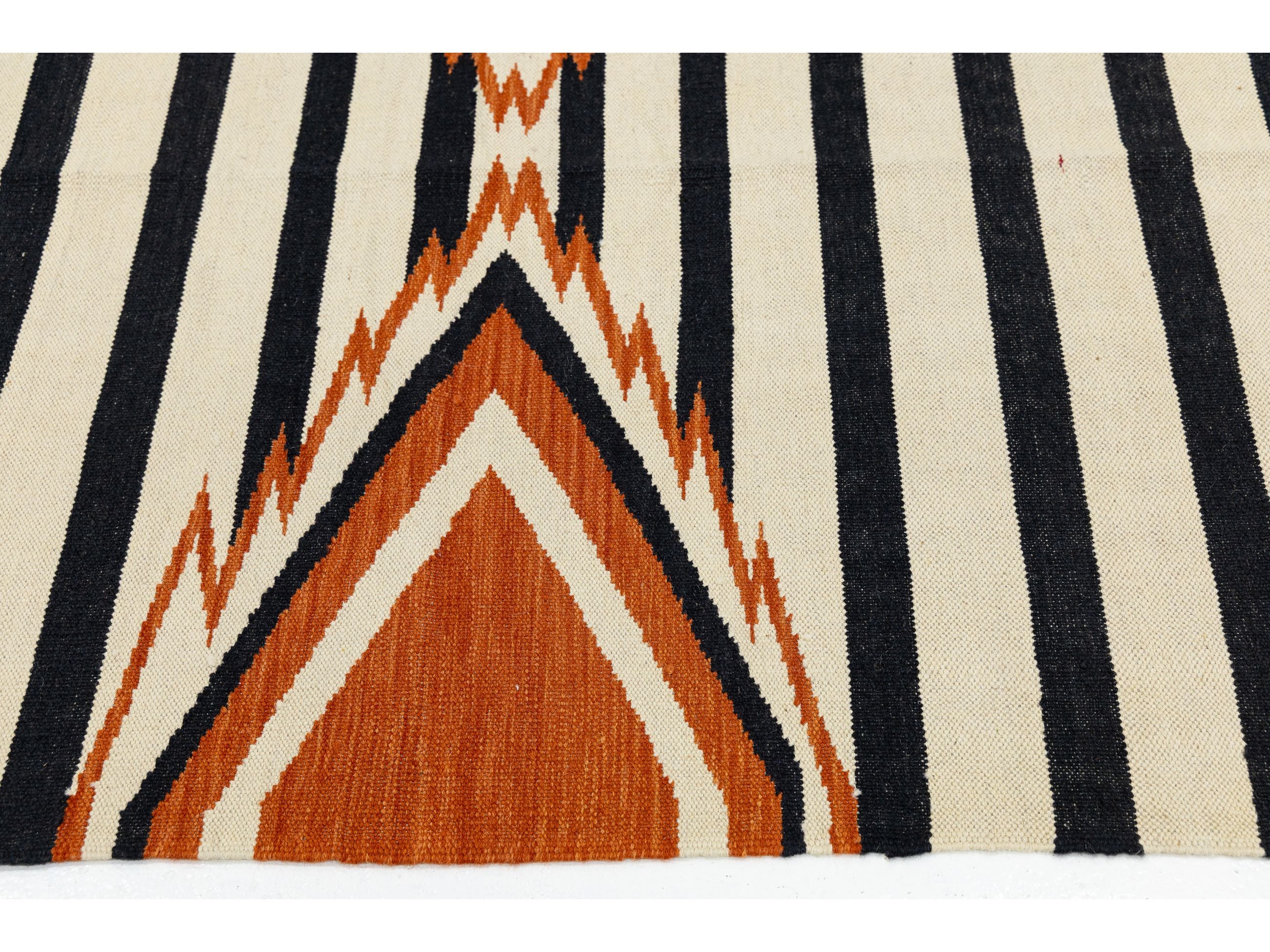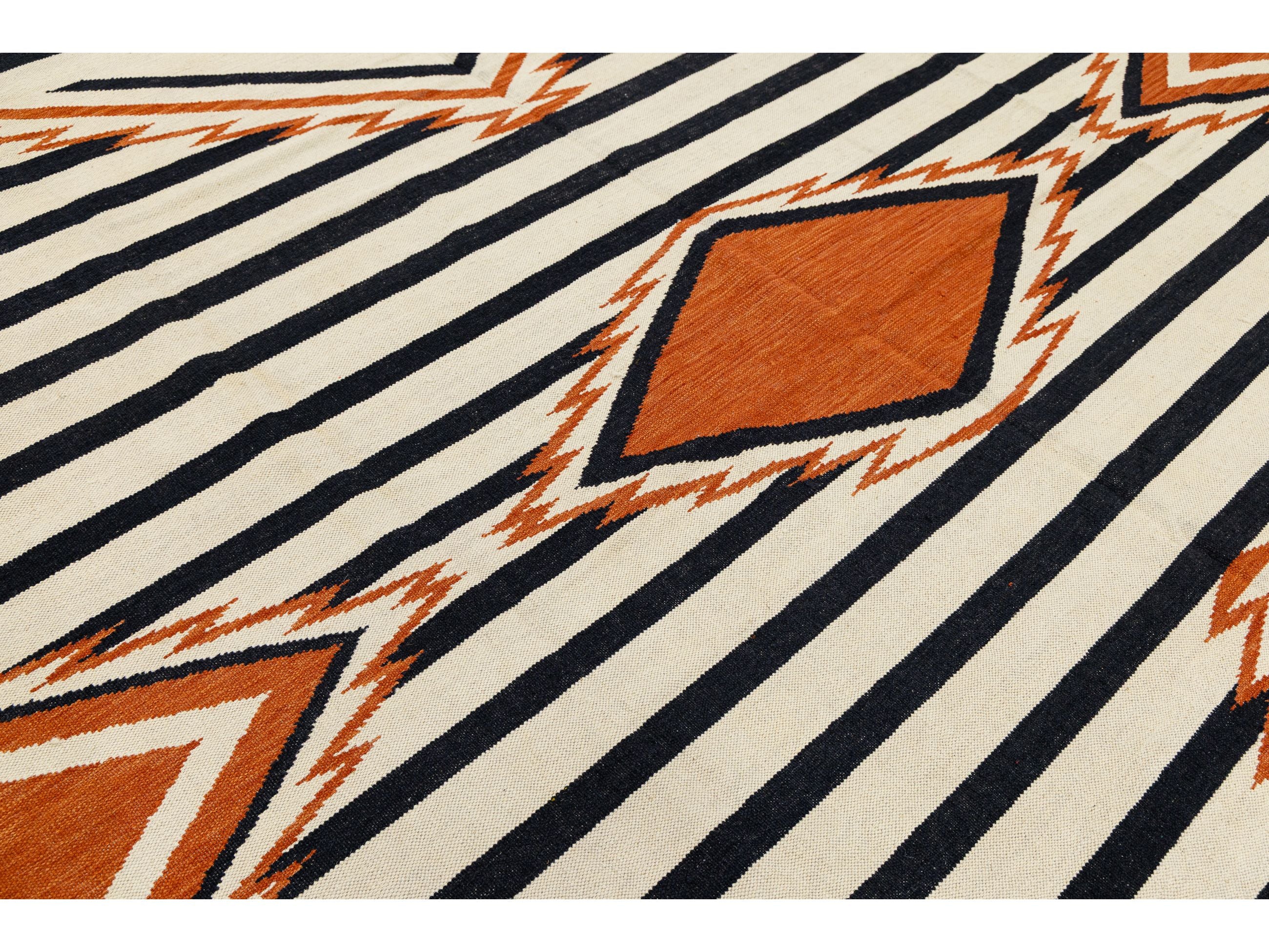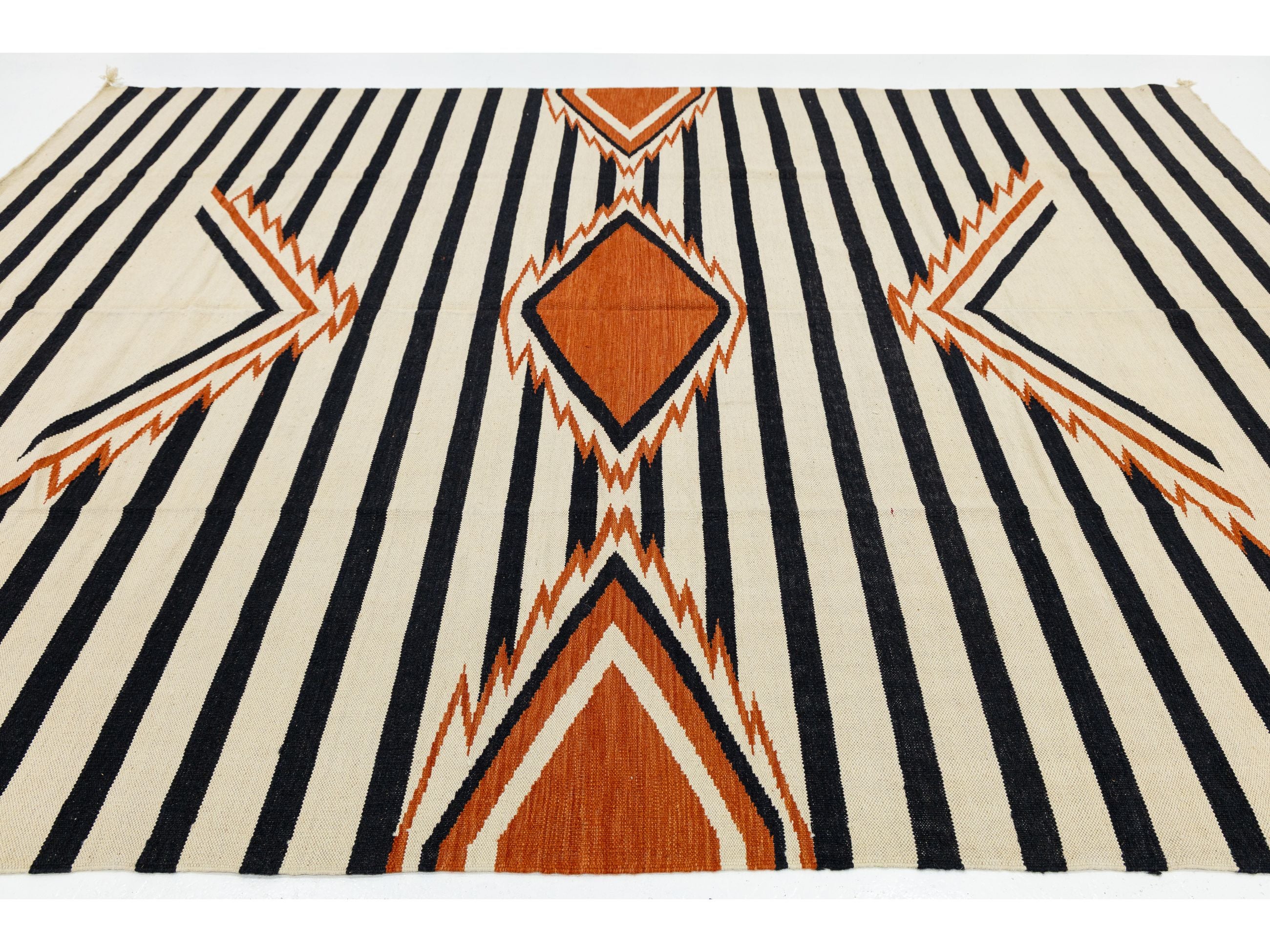 Enhance your space with this handmade Navajo-style wool rug, which beautifully blends traditional Southwestern heritage with modern design. It features bold black and cream stripes and a central terracotta diamond medallion. Crafted from high-quality wool, this flatweave rug is durable and low-profile, making it perfect for high-traffic areas. Its timeless design complements Mid-Century Modern, Boho-Chic, and Western-inspired decor. This rug measures 9'3' x 12'.
