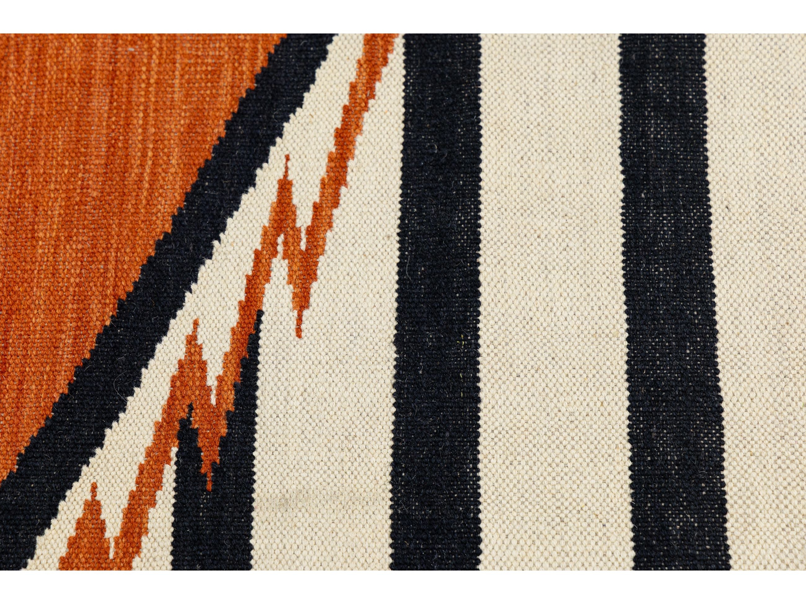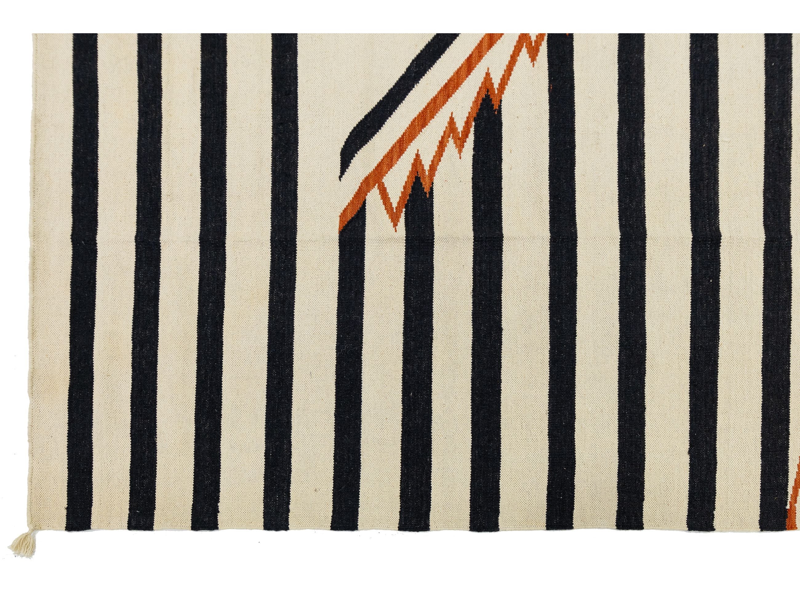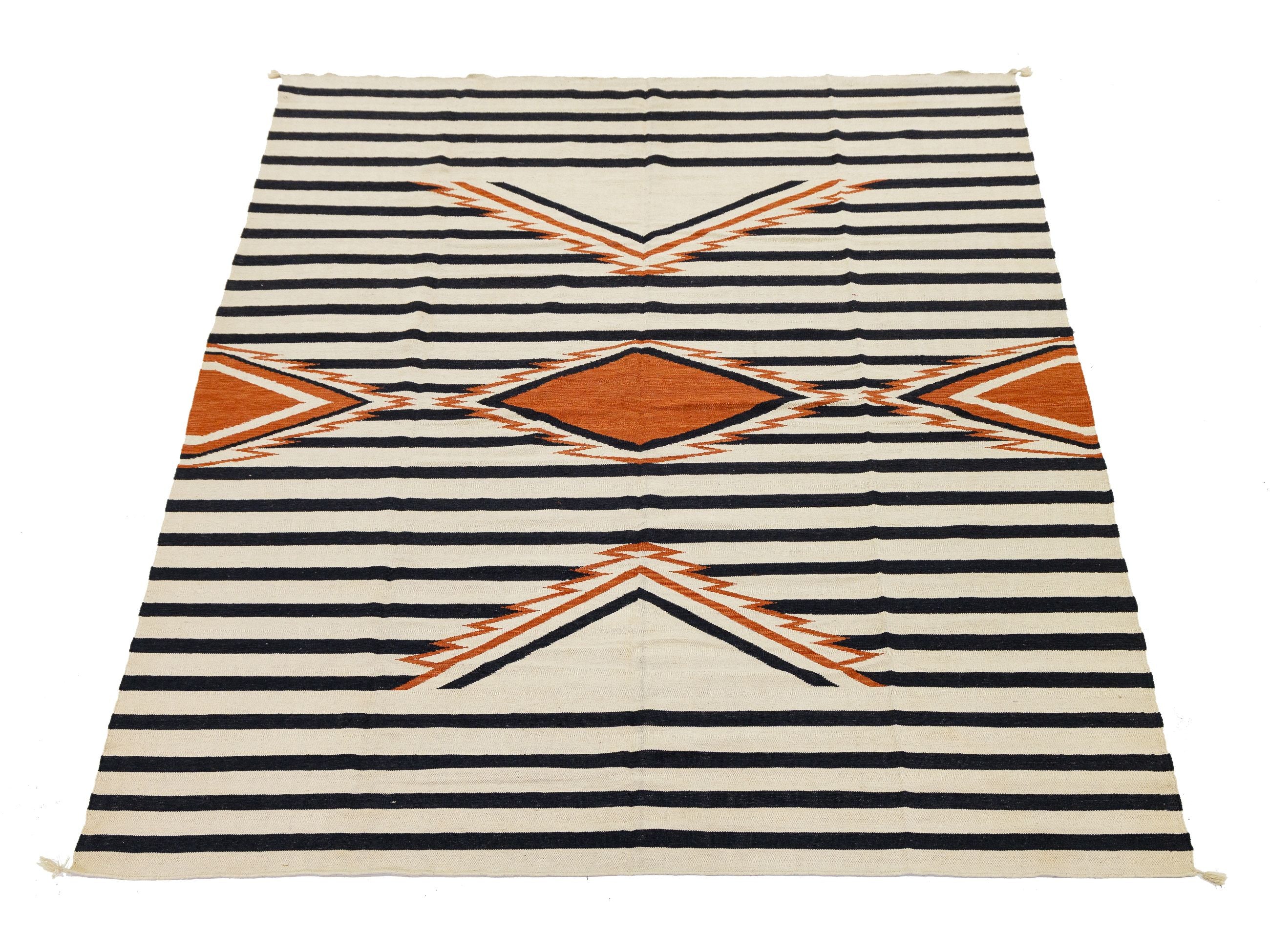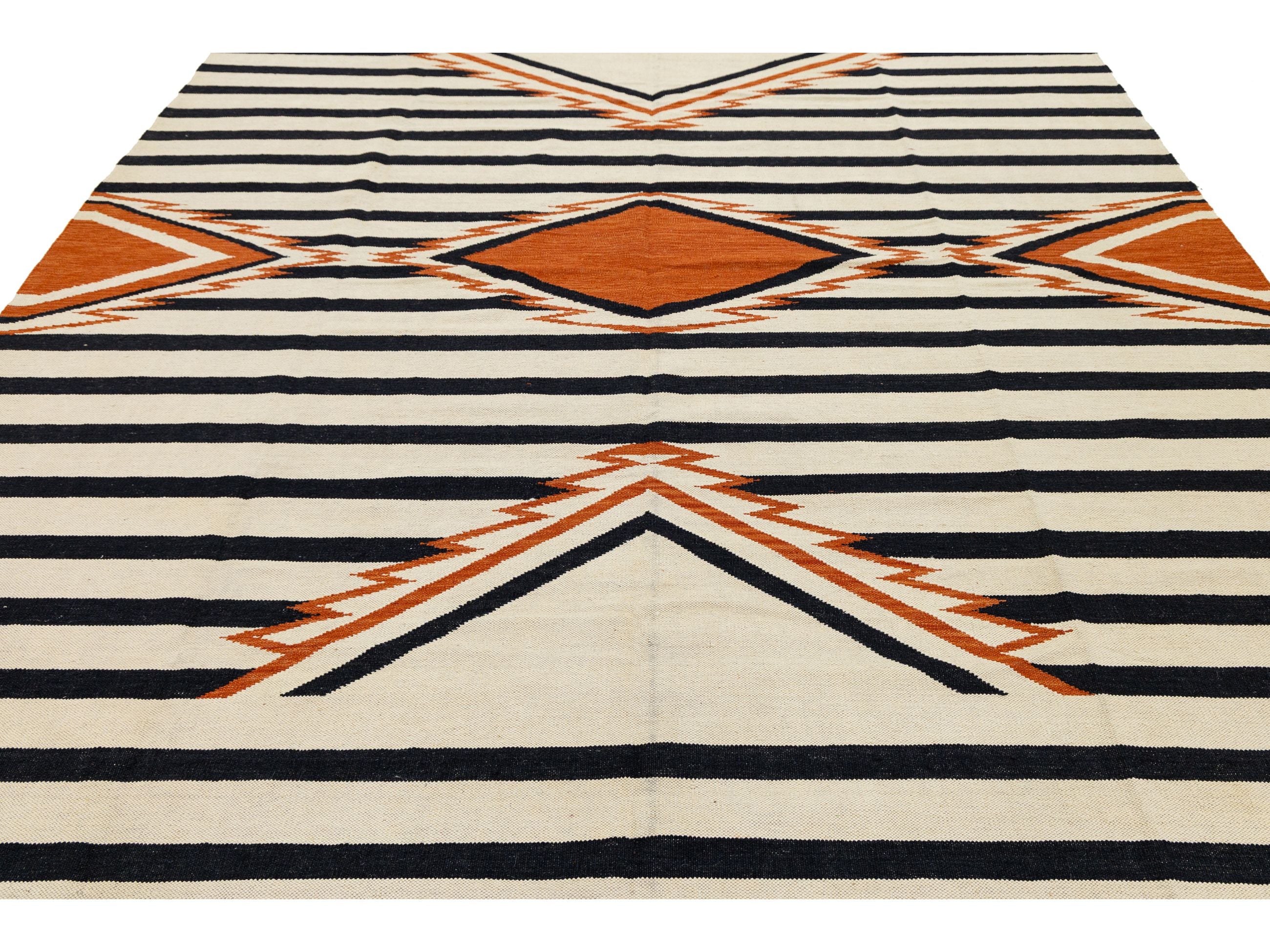 Enhance your space with this handmade Navajo-style wool rug, which beautifully blends traditional Southwestern heritage with modern design. It features bold black and cream stripes and a central terracotta diamond medallion. Crafted from high-quality wool, this flatweave rug is durable and low-profile, making it perfect for high-traffic areas. Its timeless design complements Mid-Century Modern, Boho-Chic, and Western-inspired decor. This rug measures 9'3' x 12'.