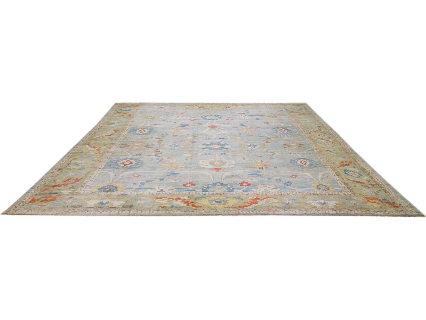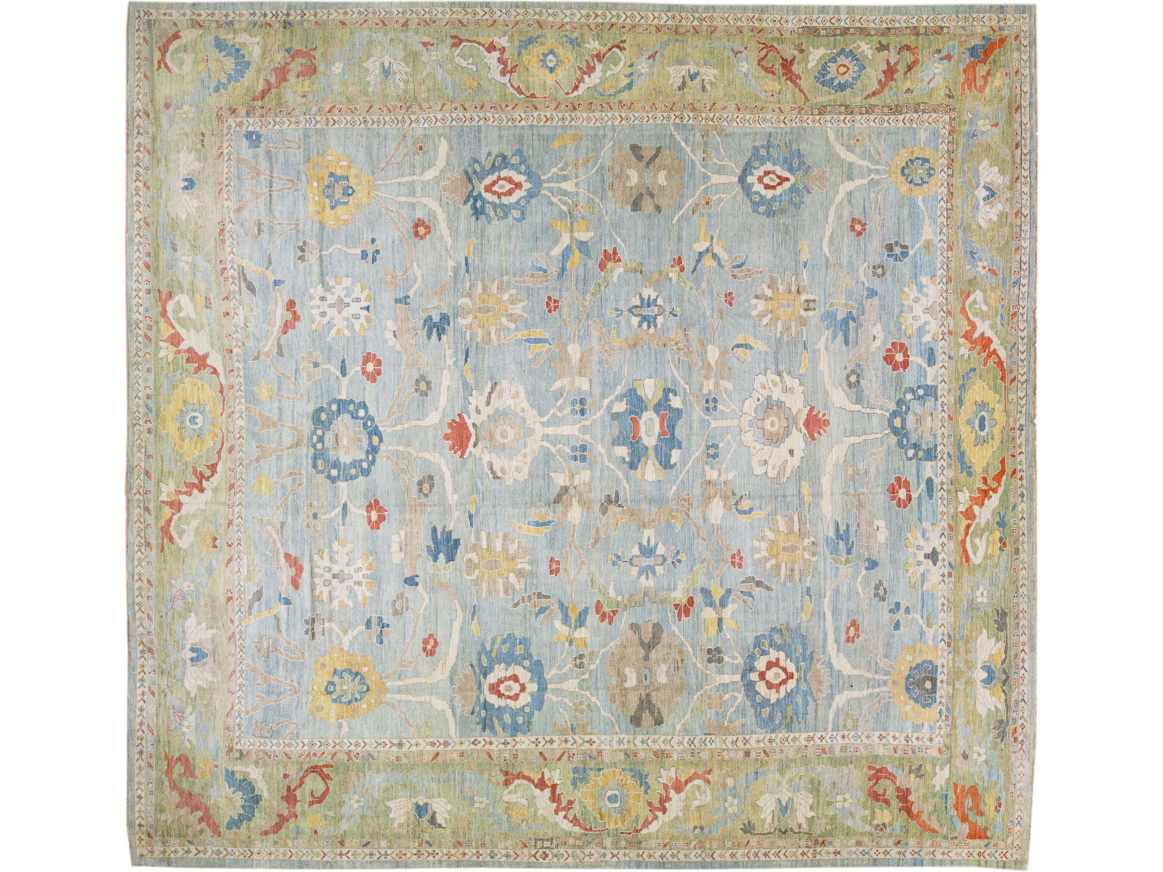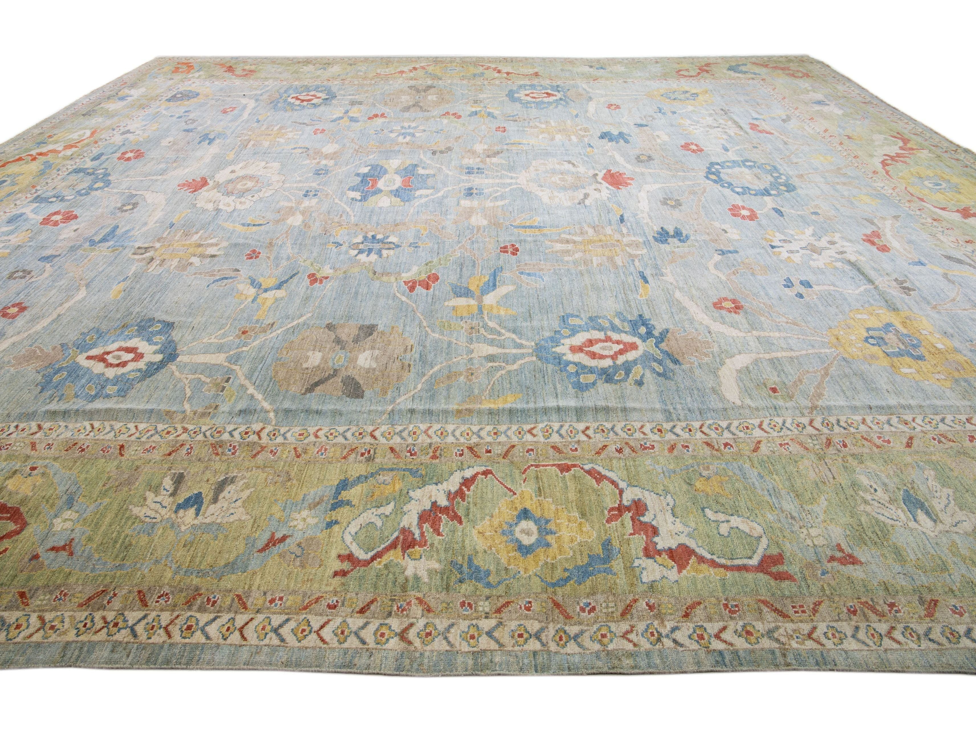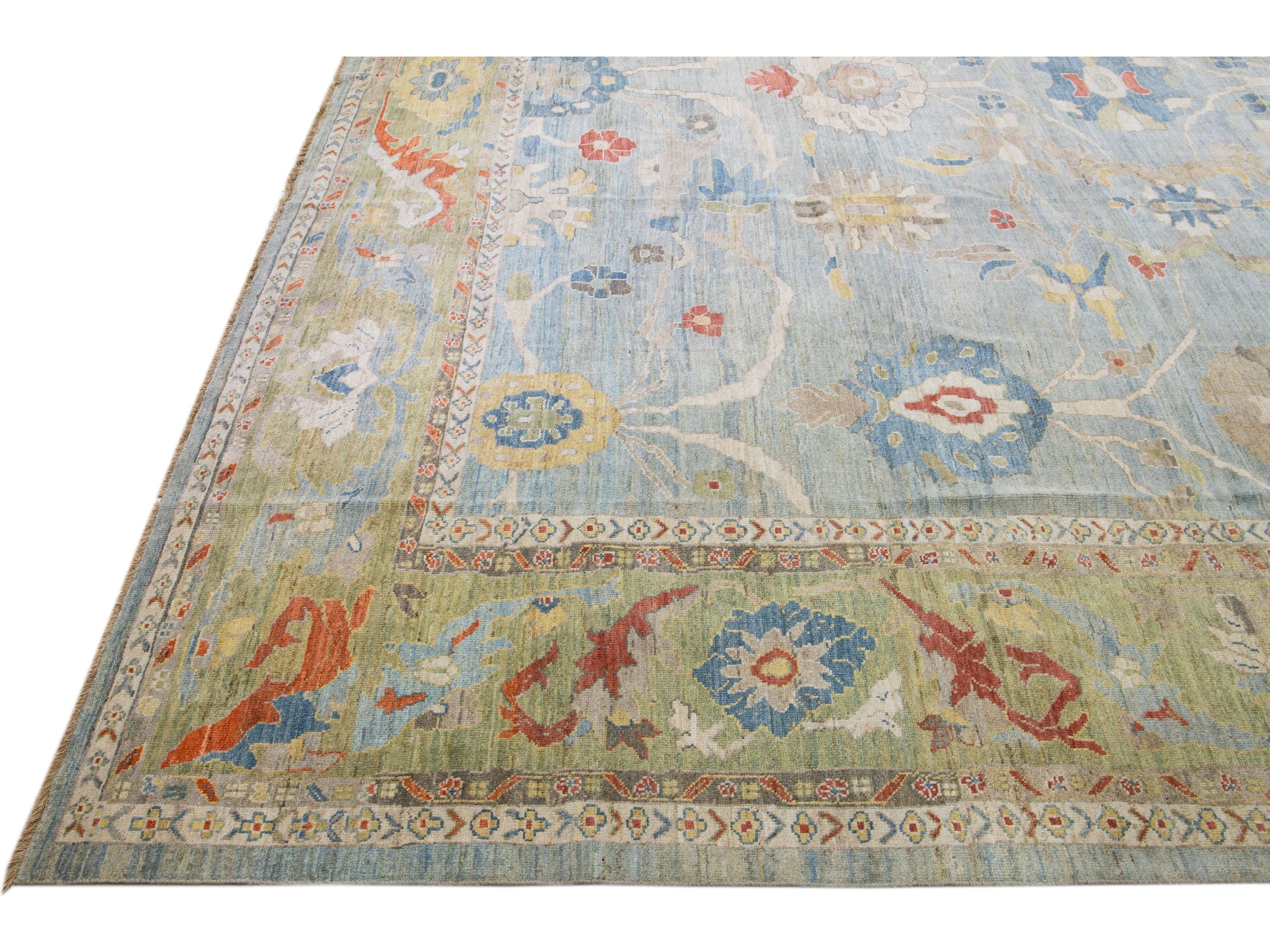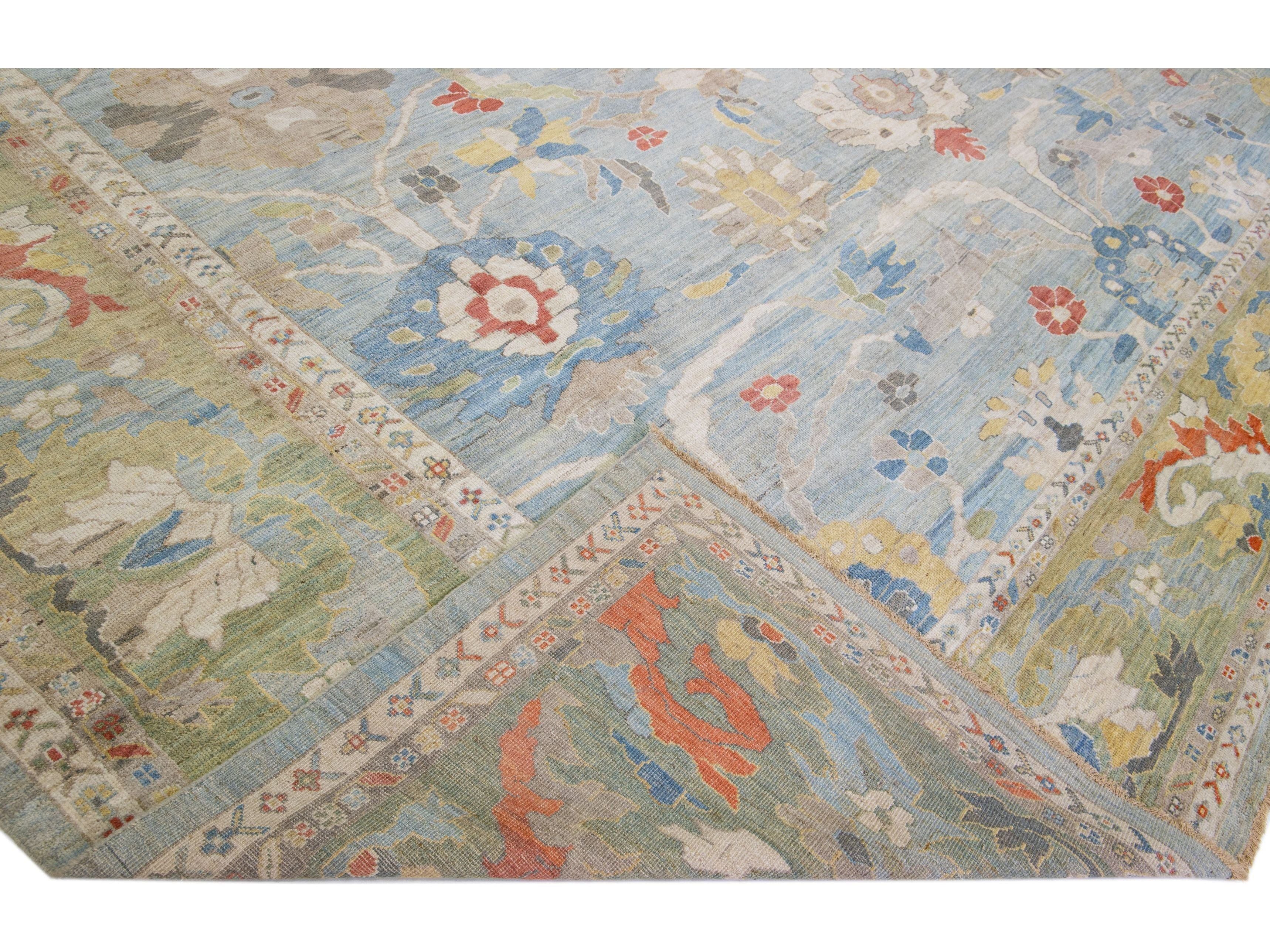 Beautiful modern Sultanabad hand-knotted wool rug with a blue field. This rug has a green frame and multicolor accents in a gorgeous all-over floral design.