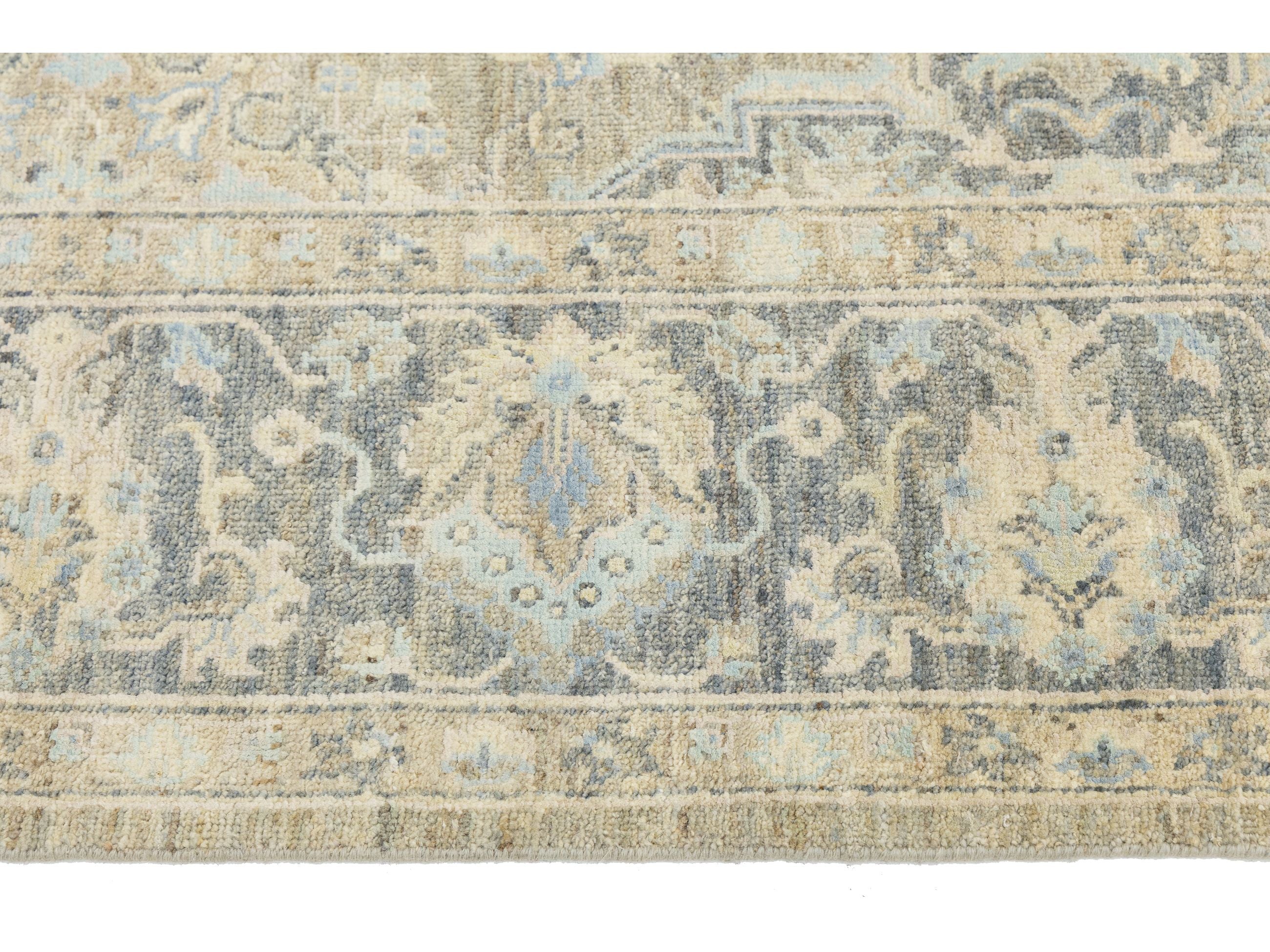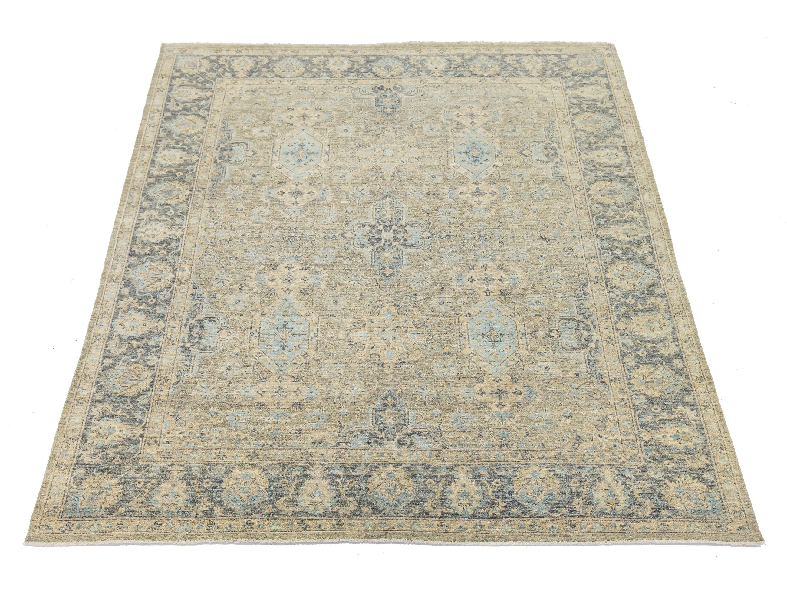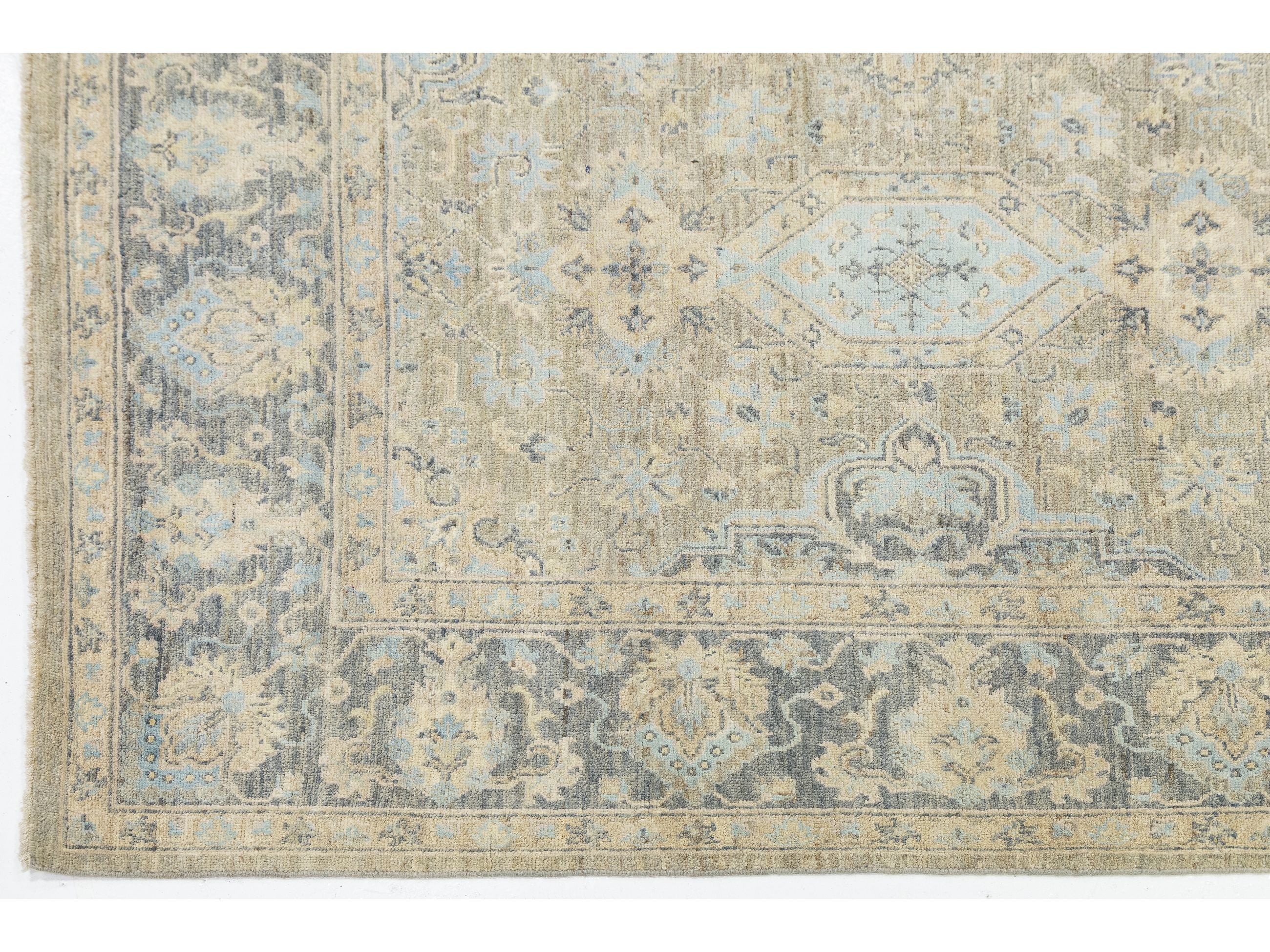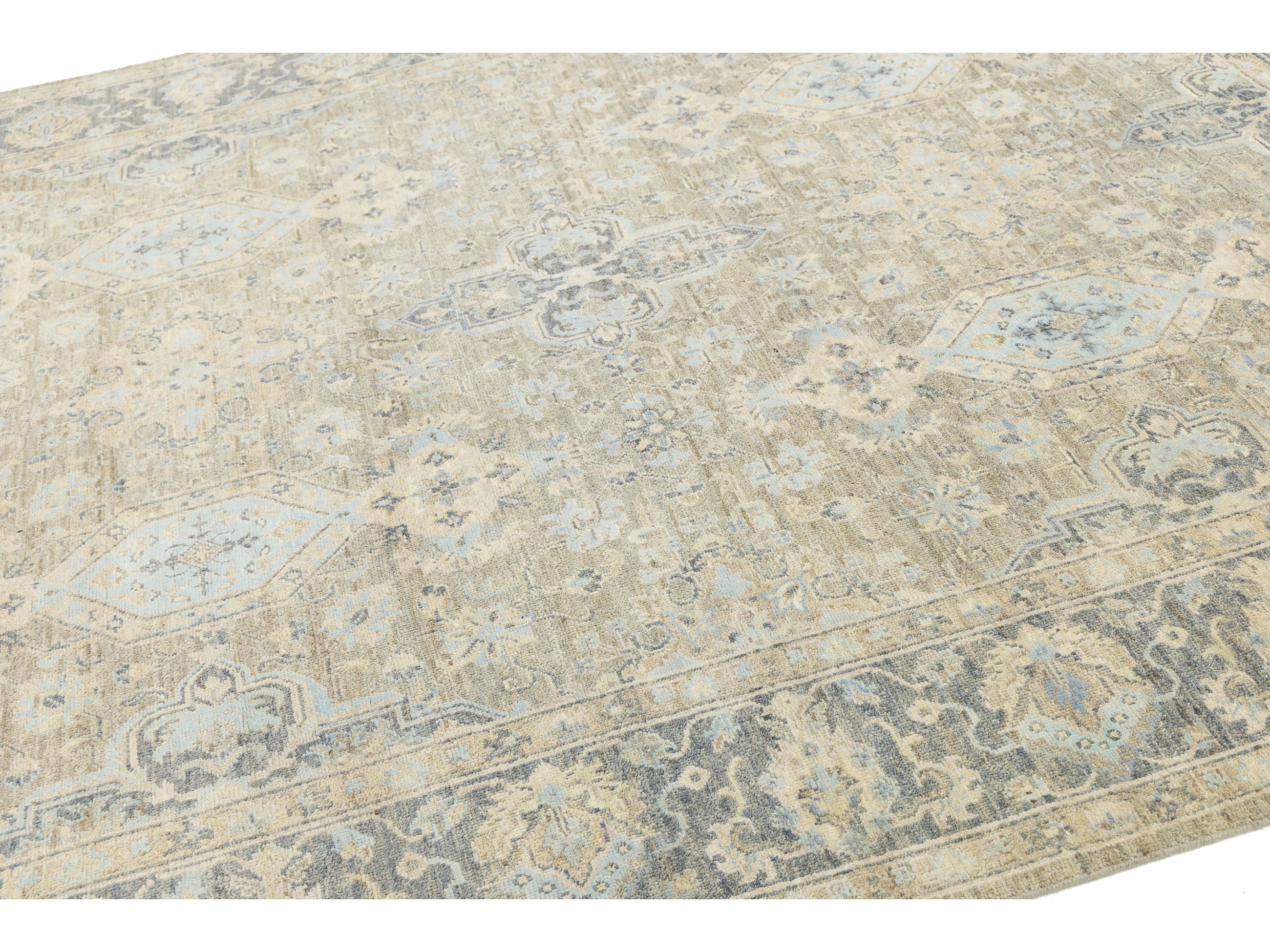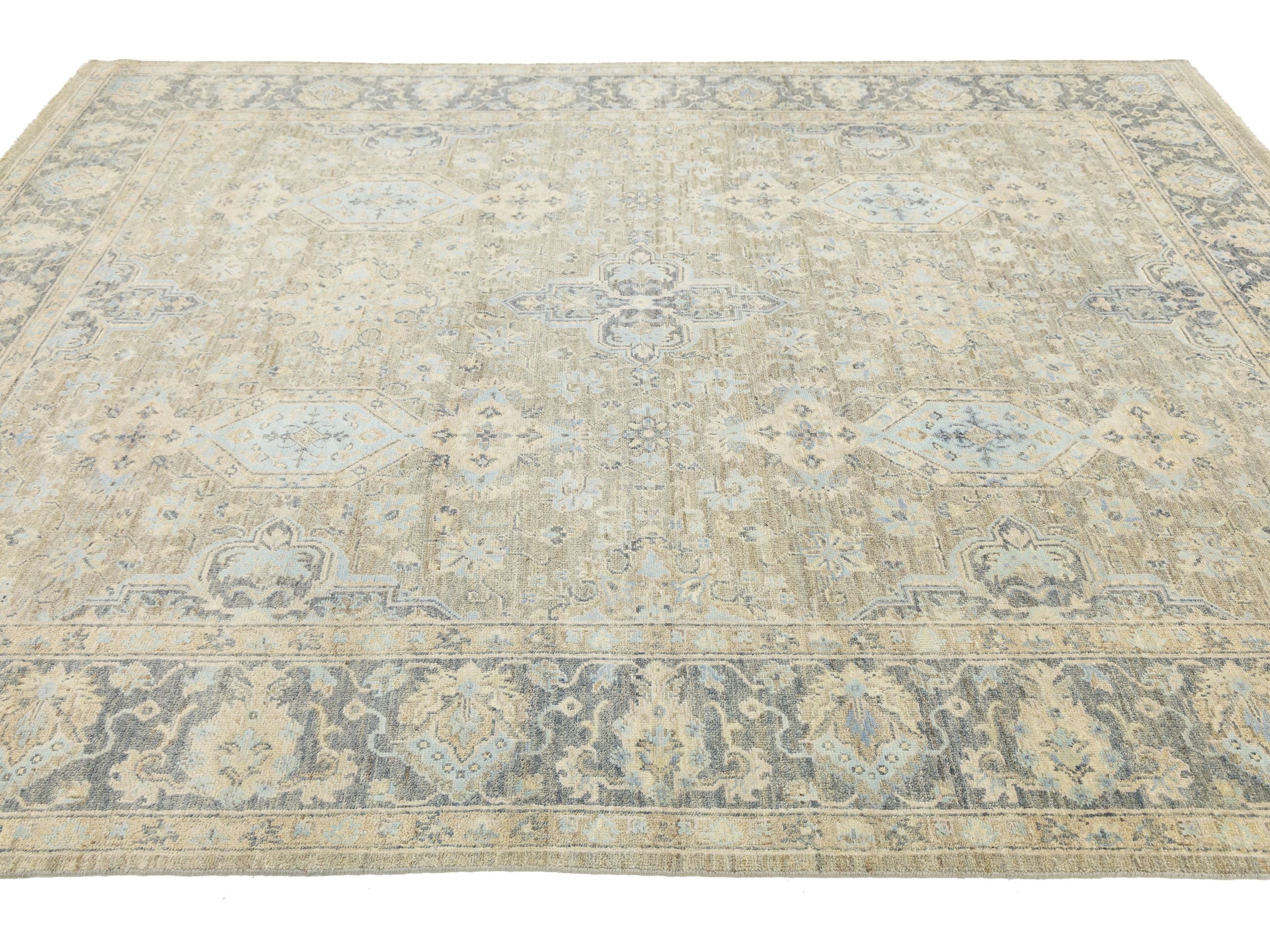 Elevate your space with this exquisite Modern Tabriz-style rug, a blend of traditional craftsmanship and contemporary design. Hand-knotted from premium wool and silk, it boasts a soft sheen that changes under varying light. The oversized central medallion is surrounded by delicate floral and geometric motifs, framed by a slate-grey border. Its muted palette of champagne beige, cool slate, and hints of sky blue offers a sophisticated, antique look that adds texture without overwhelming any room. This rug measures 7'11" x 10'3".